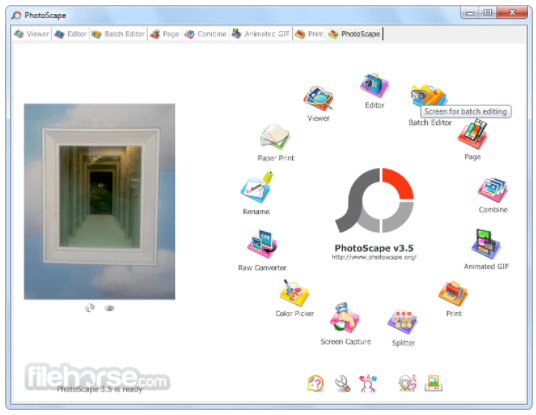 포토스케이프 3.4 버전의 모습을 사진으로 보여주고 있습니다. 포토스케이프는 거의 모든 종류의 이미지 작업을 할 수 있는 무료 이미지 편집 소프트웨어로 뷰어, 편집기, 페이지, 애니메이션, 화면 캡처 등 다앙한 기능을 할 수 있습니다.