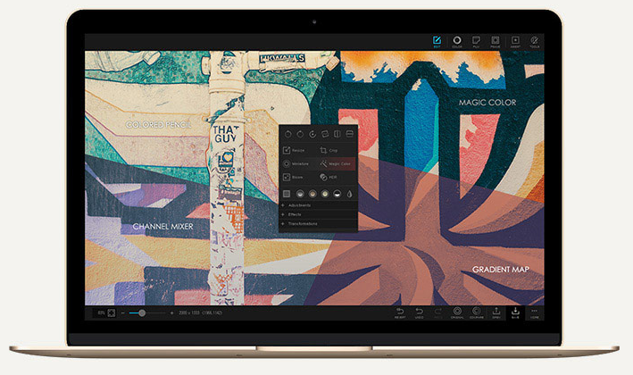색상 및 필터를 조정하여 다양한 효과를 통해 본인 고유의 스타일을 만들 수 있으며, 필름 효과, 이미지 변환, 컷 아웃, 290개 이상의 프레임, 브러시 등의 다양한 도구를 이용할 수 있어 무료이지만 활용도가 매우 높습니다.