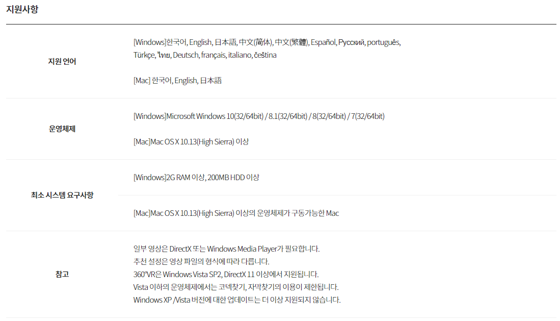 곰플레이어는 윈도우7(Window7) 이상에서 사용이 가능하며, Mac OS X 10.13이상에서 베타버전으로 사용이 가능합니다. 현재까지 애플 관련 기기에 대한 지원이 떨어진다는 점이 조금 아쉬운 점으로 꼽힙니다.
