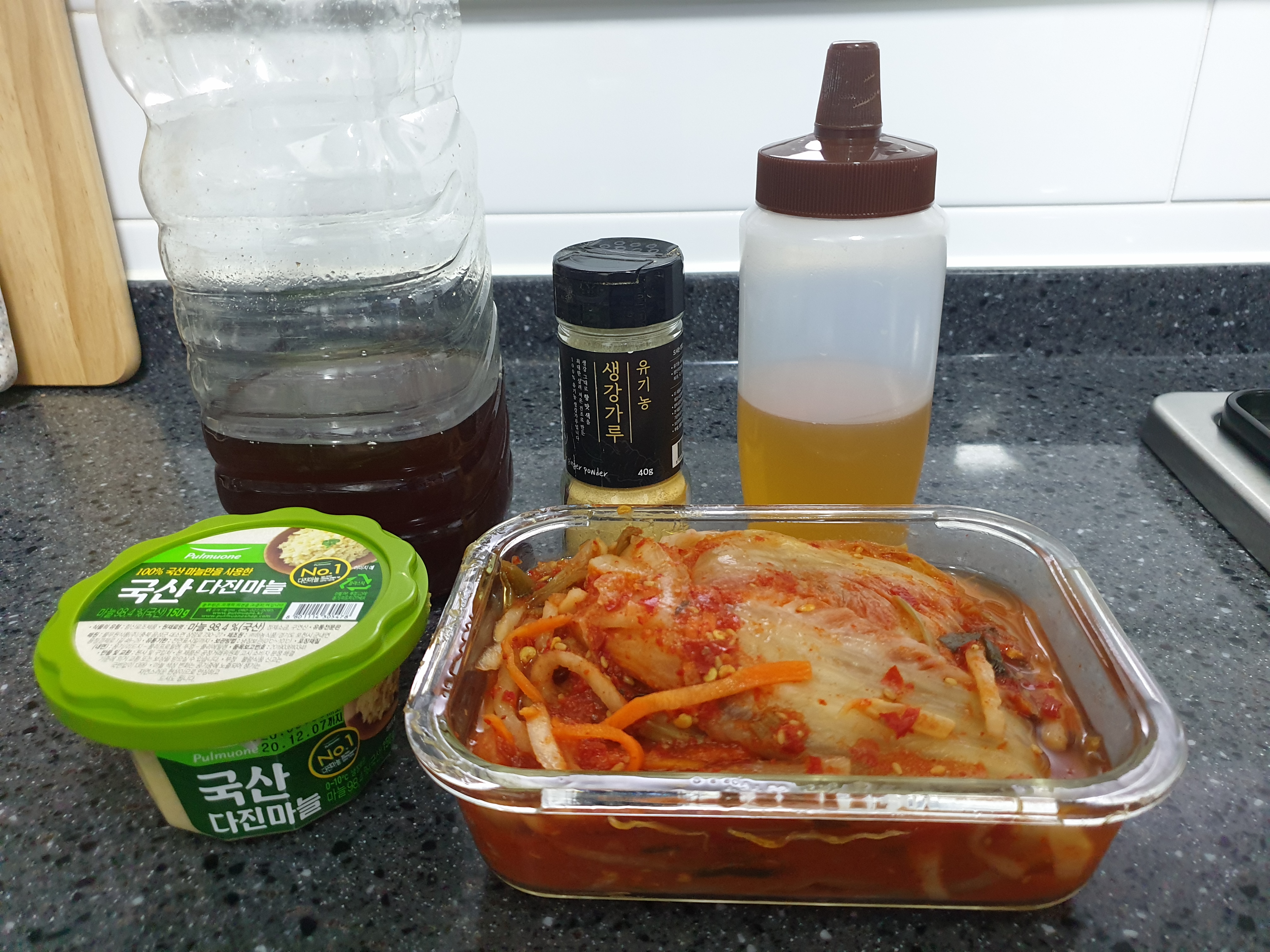 준비물은 매실액(없어도 됩니다.), 다진 마늘, 생강가루, 꿀(설탕), 묵은지 김치입니다.