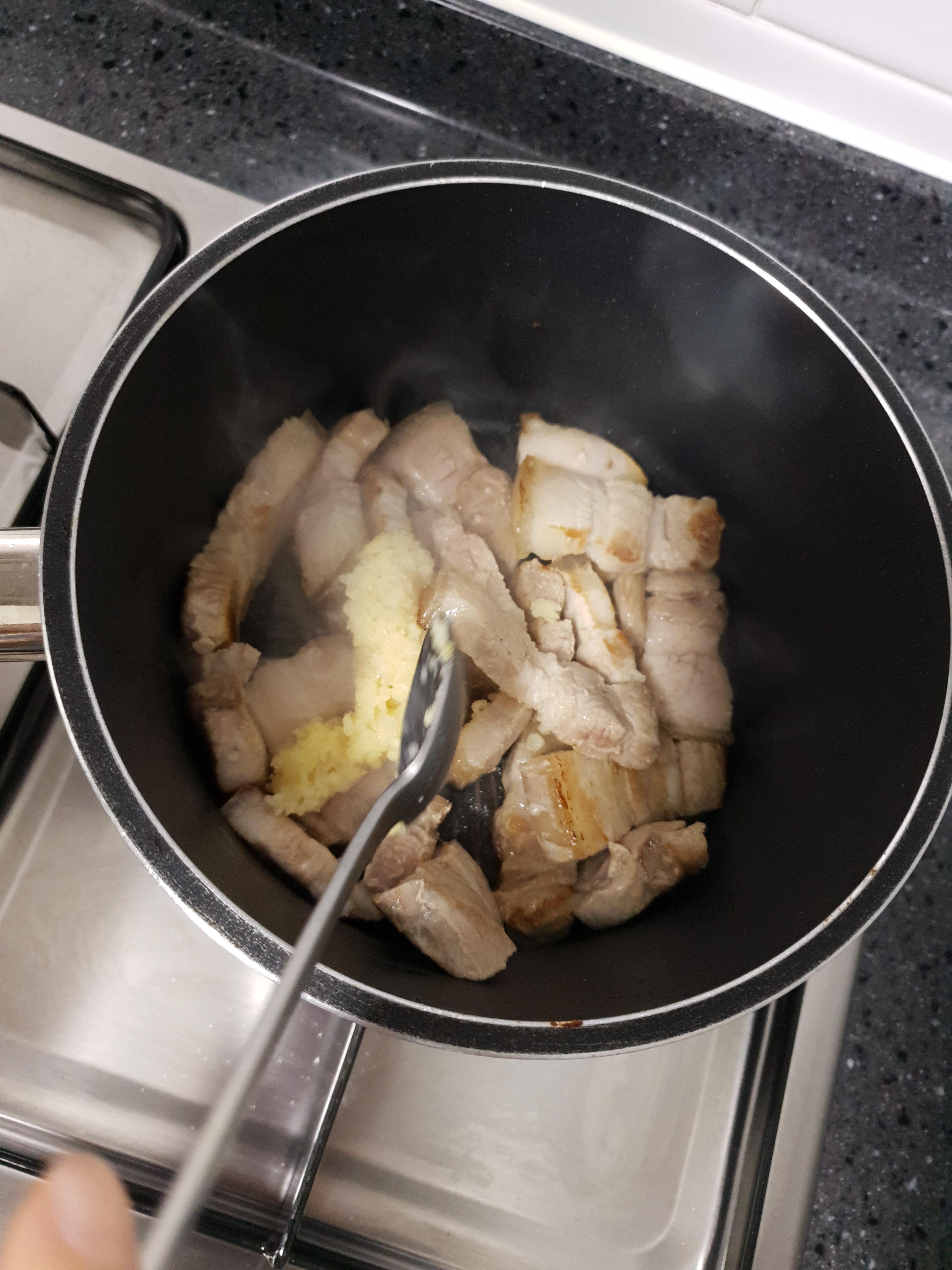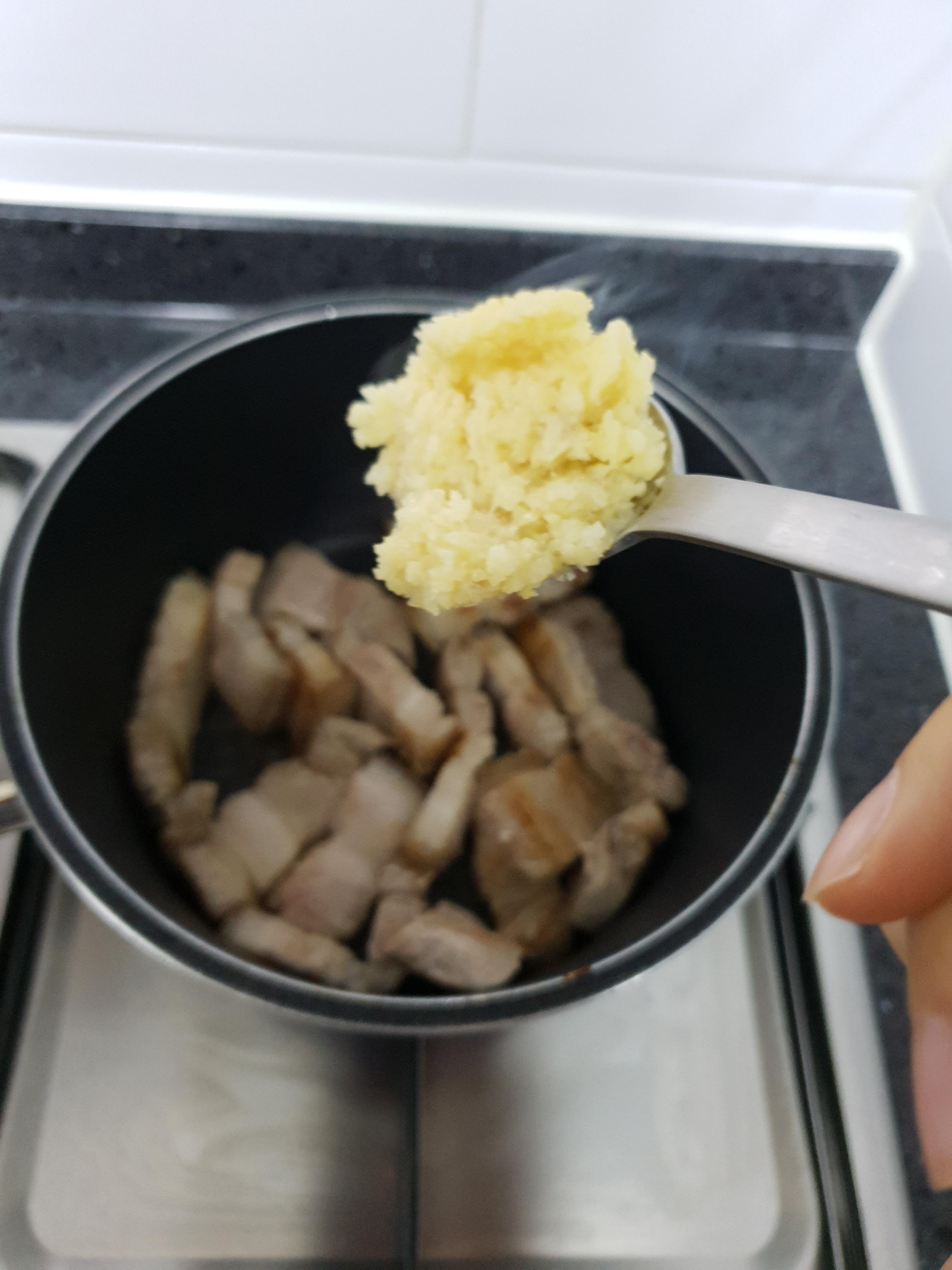돼지고기를 익히셨으면 다음으로 다진 마늘을 큰 술로 가득 차게 한 스푼 넣어주세요.