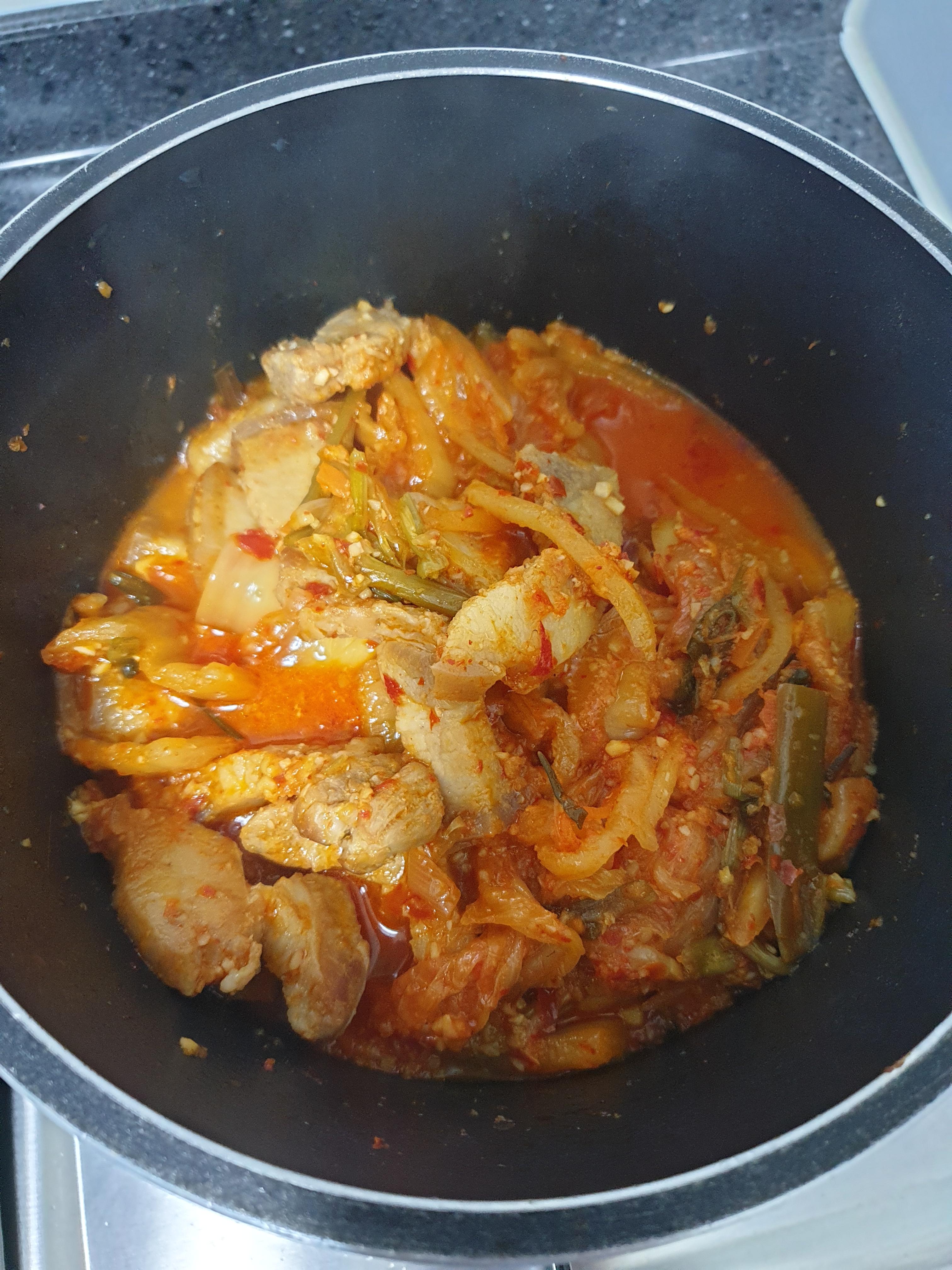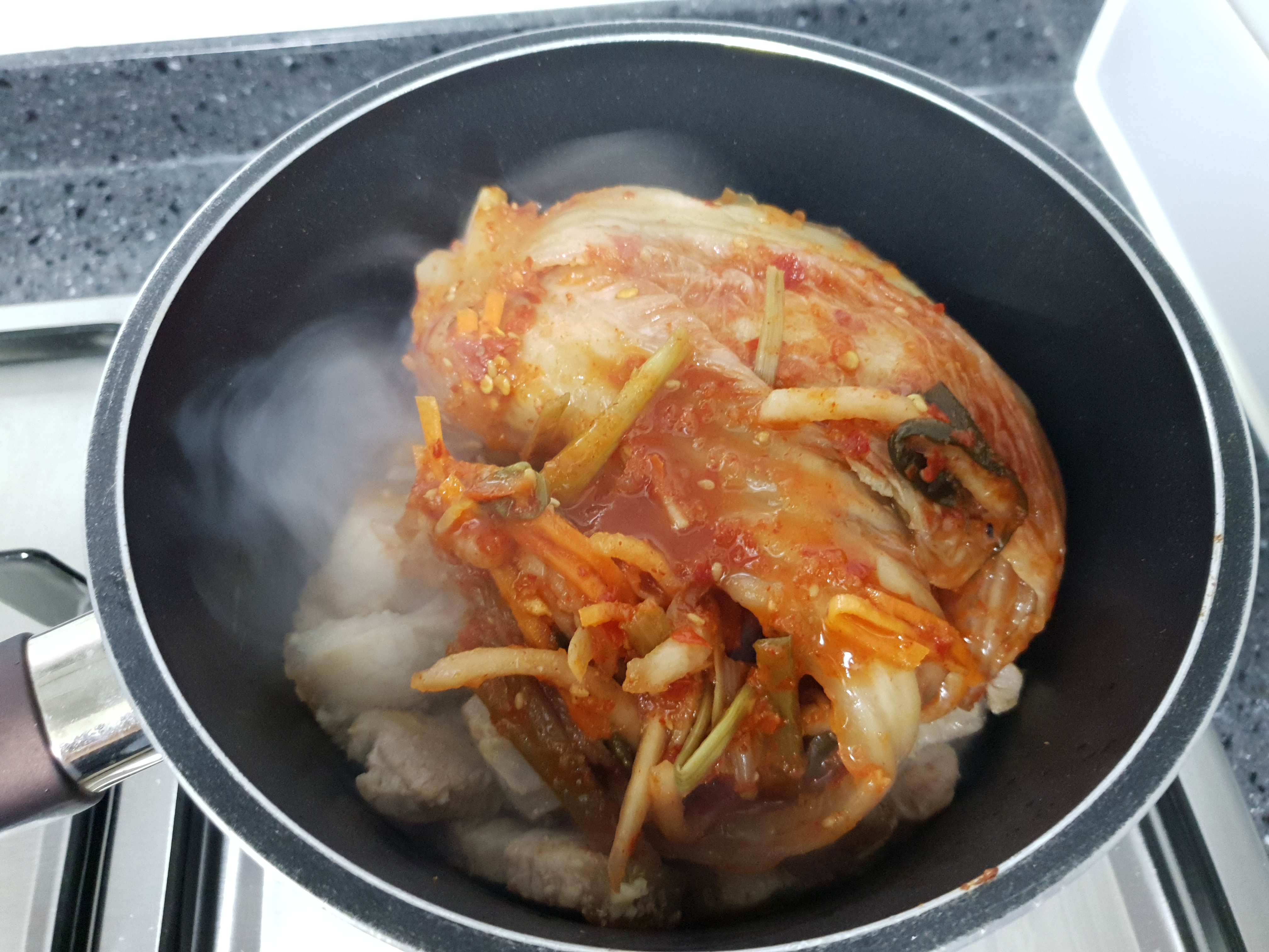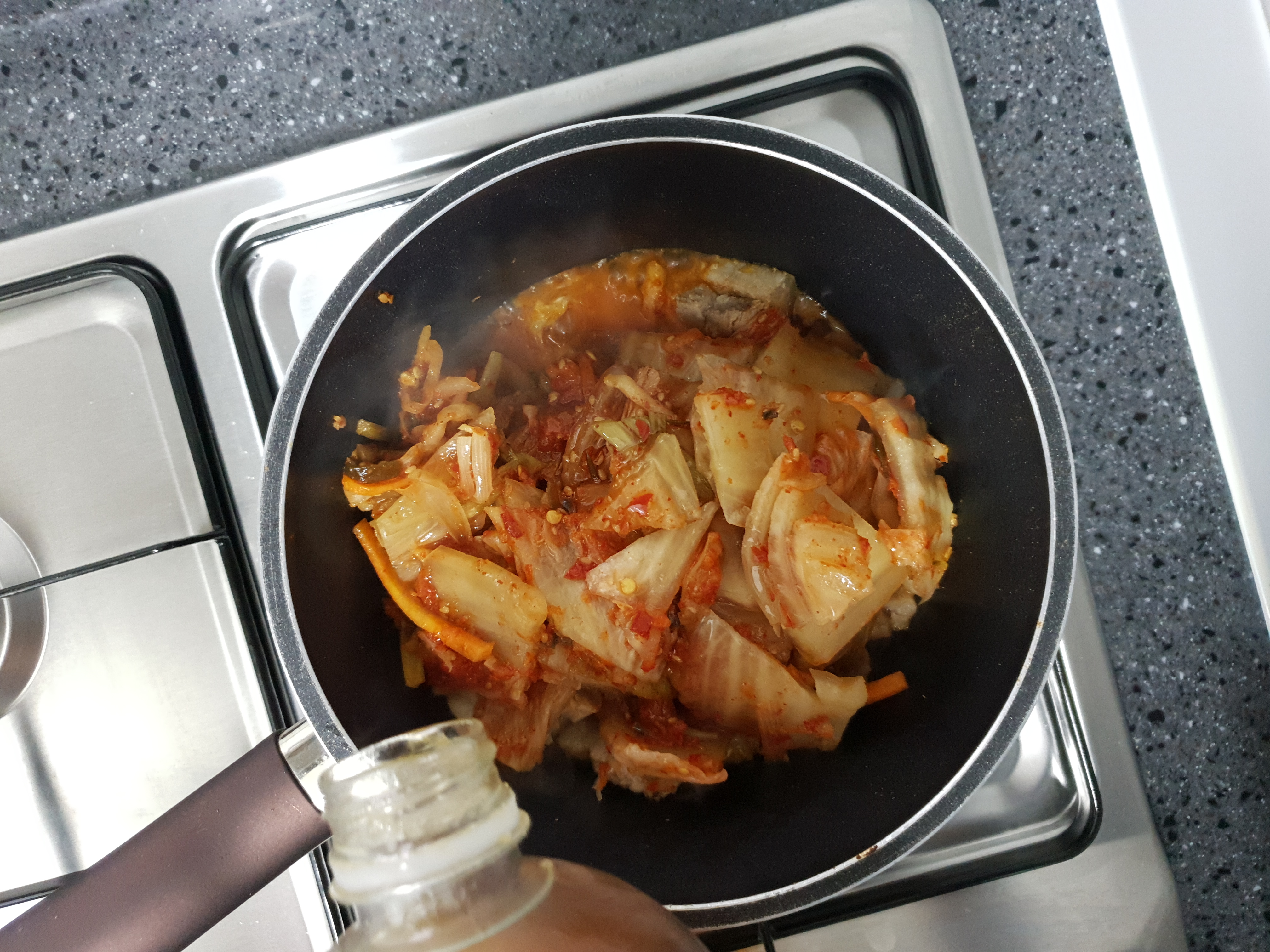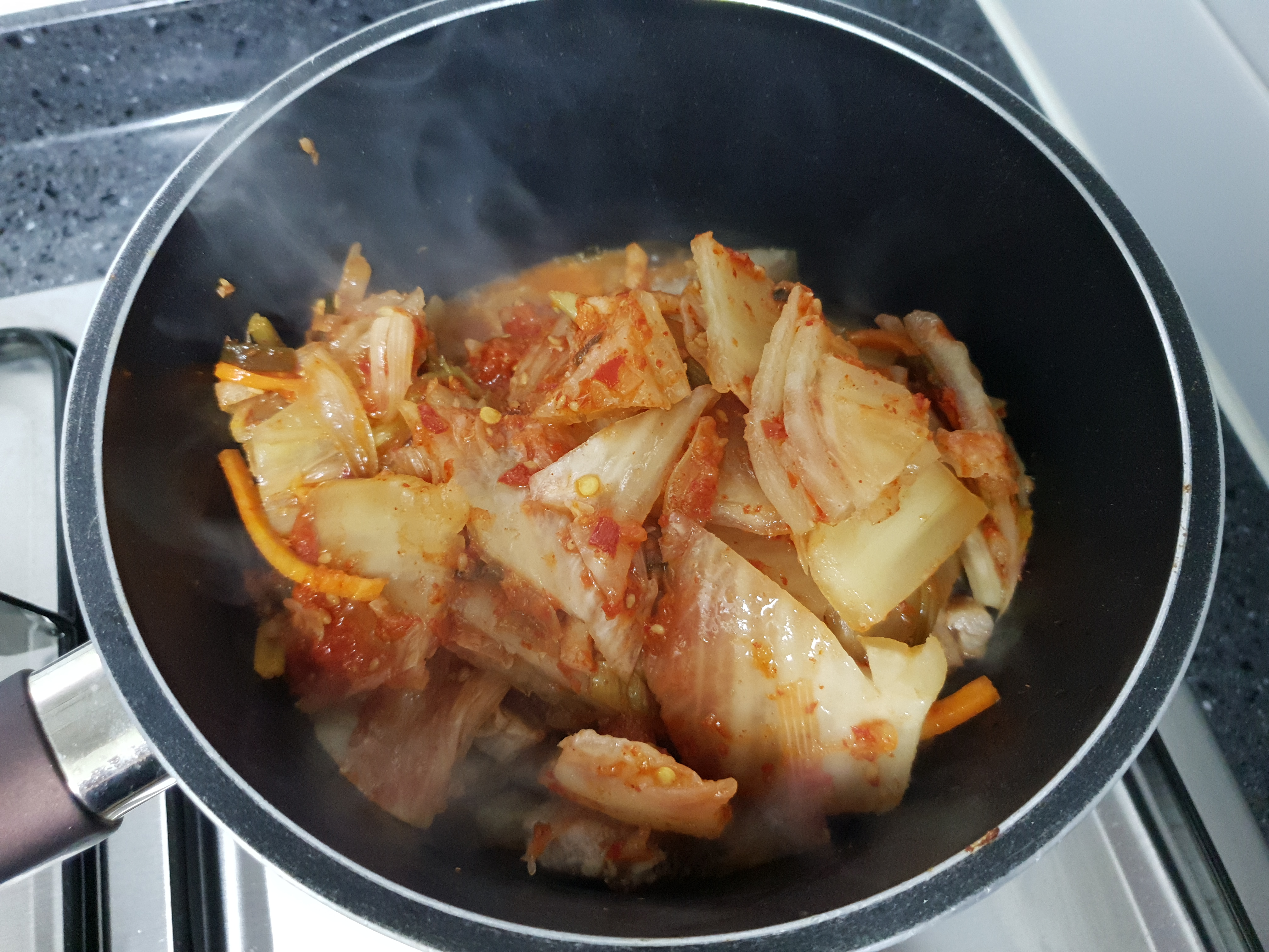 1/4 포기의 김치를 넣어주세요. 김치 국물은 조금만 넣거나 넣지 않아도 충분합니다^^ 끓이다 보면 김치 자체에서 물이 생기기 때문입니다.