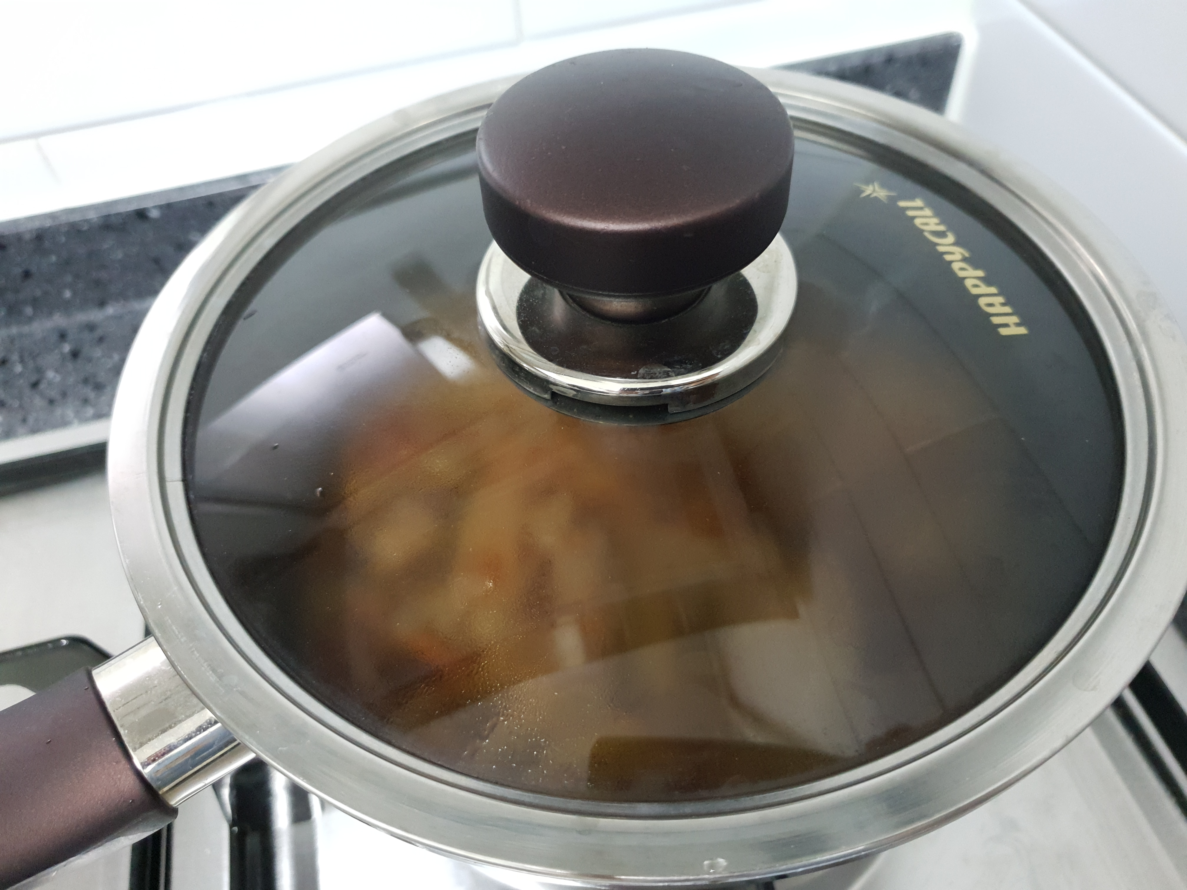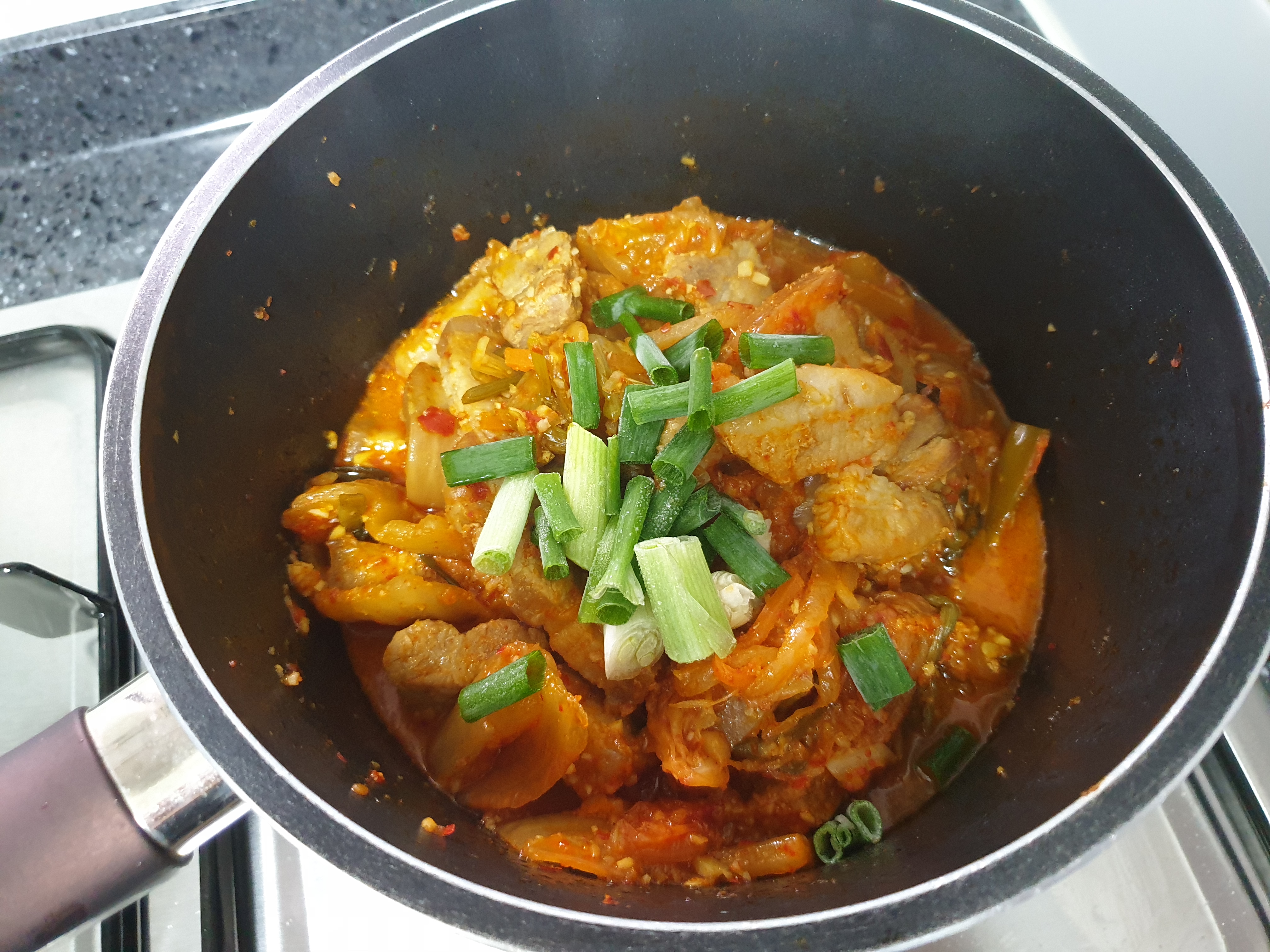 마지막에 쪽파를 썰어 돼지김치찜 위에 얹은 뒤 1분 정도 더 끓여줍니다.(쪽파를 넣지 않아도 무관합니다.) 기호에 따라 양파나 고추 등을 넣기도 하지만 그러면 재료가 너무 많이 들어가 초간단 레시피가 아니겠죠?