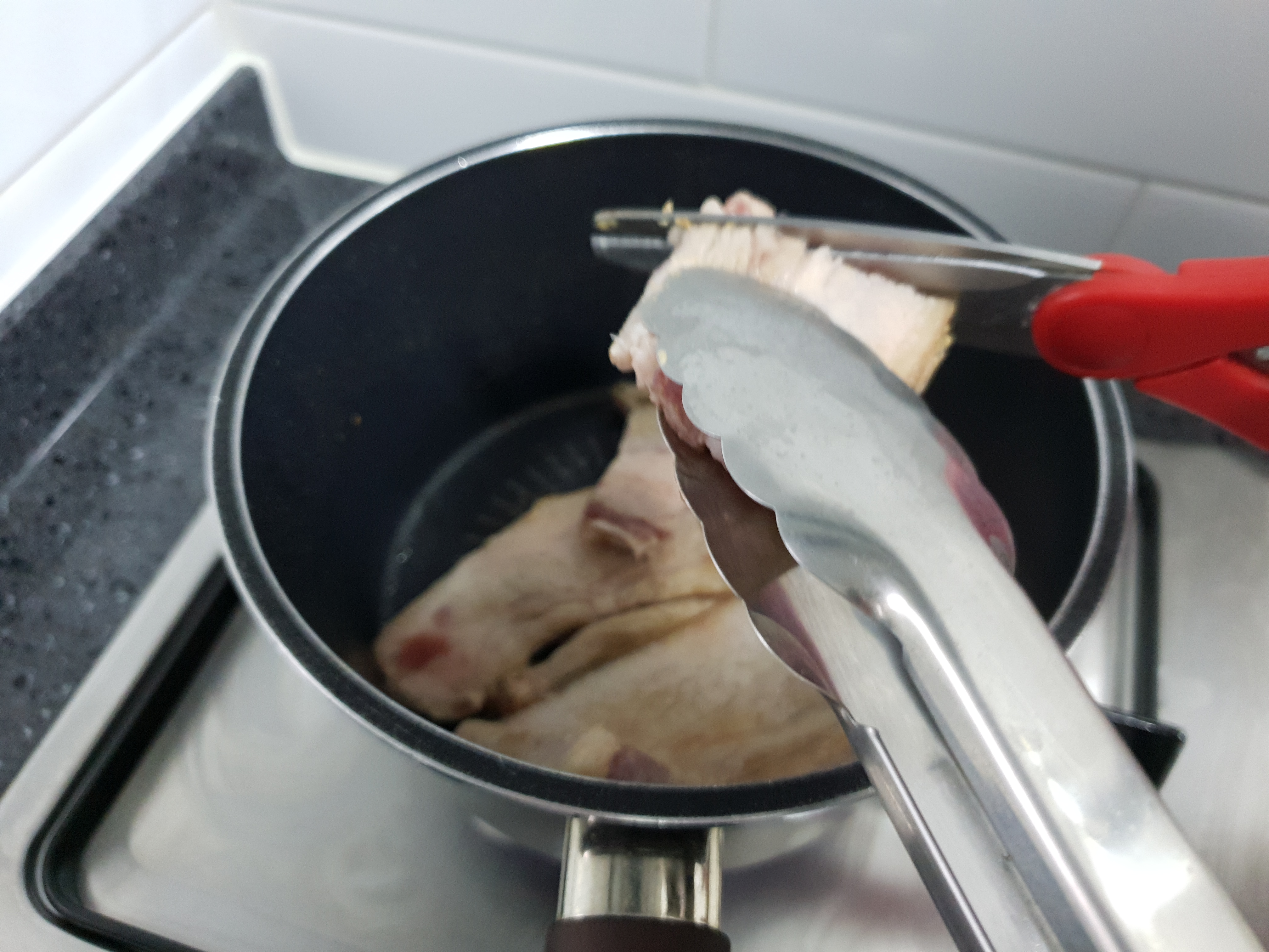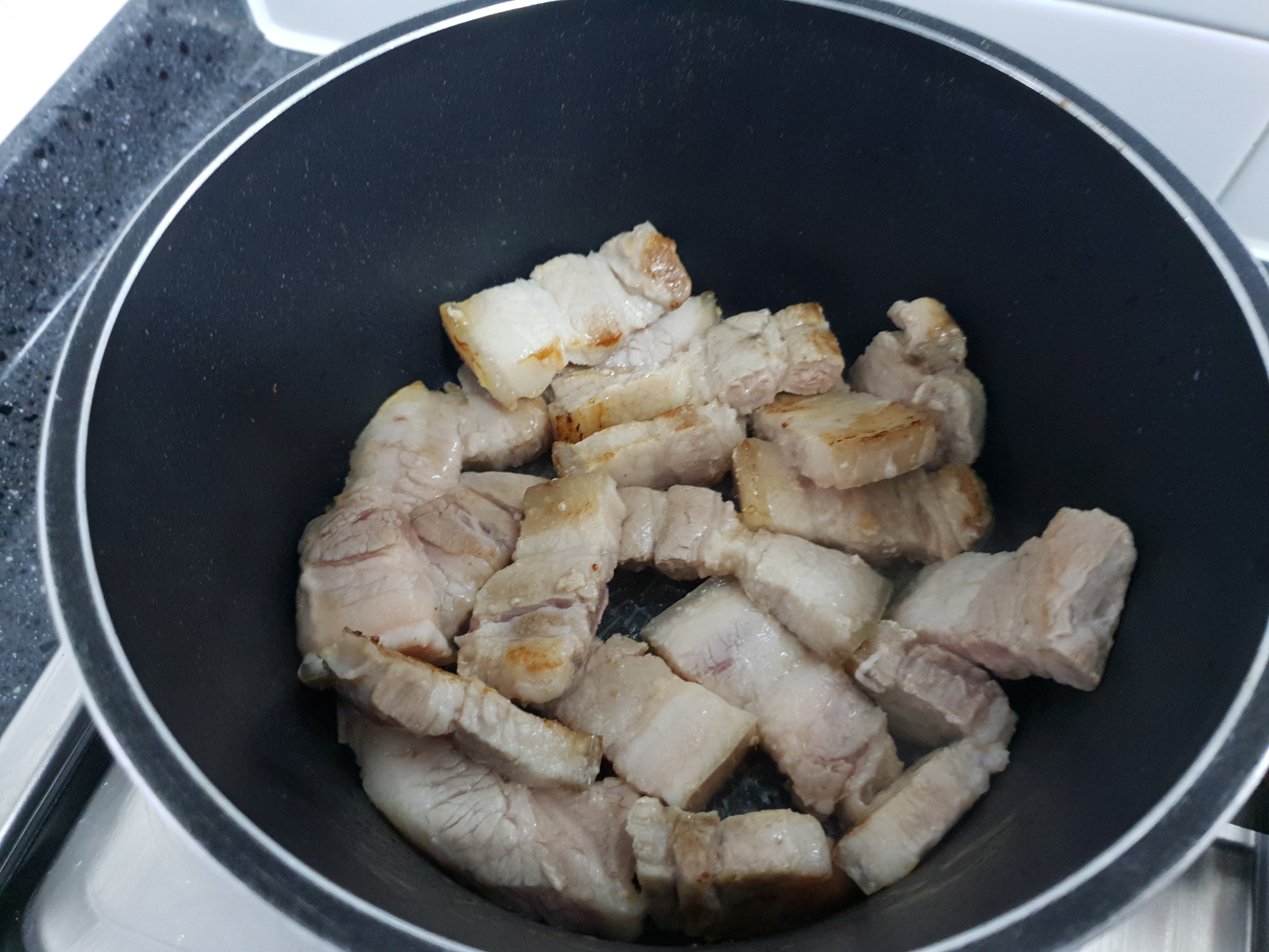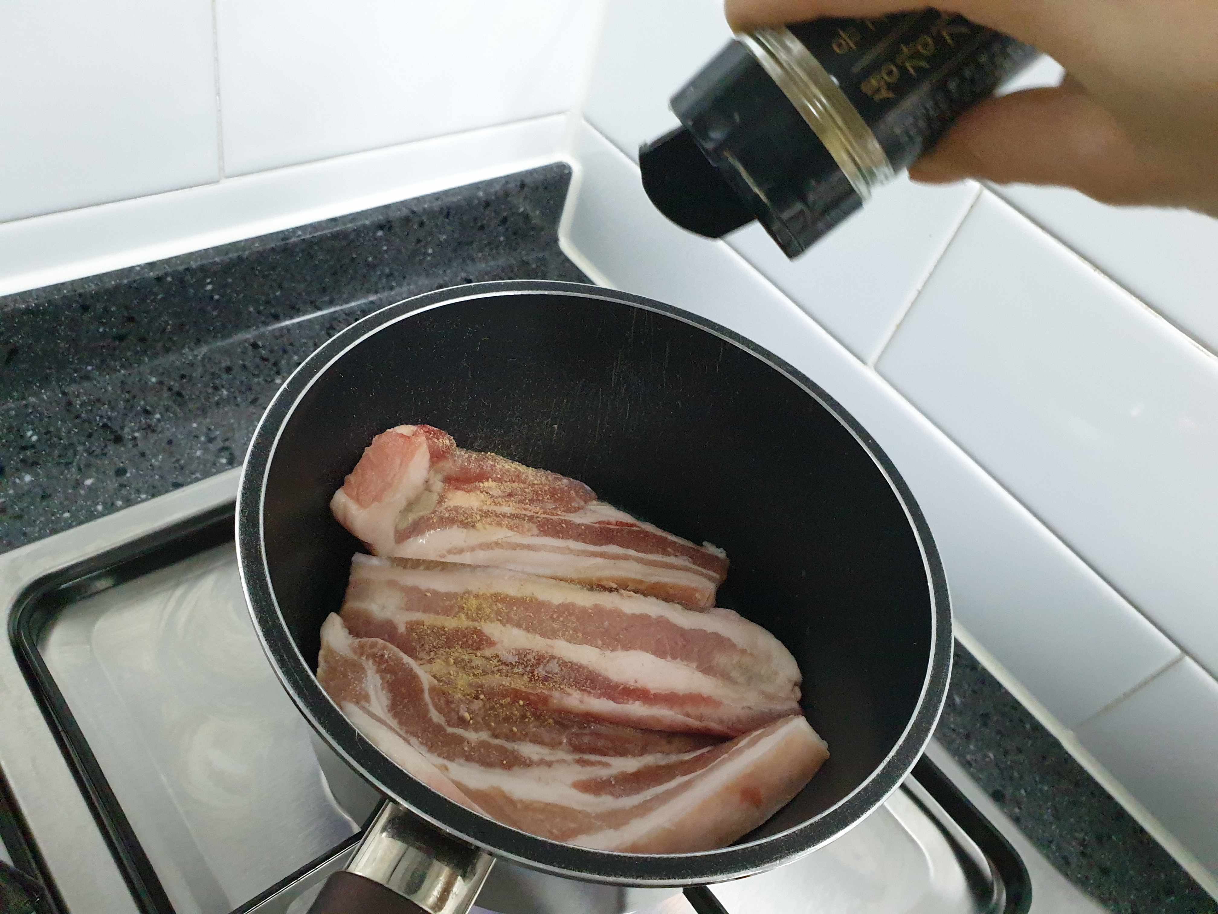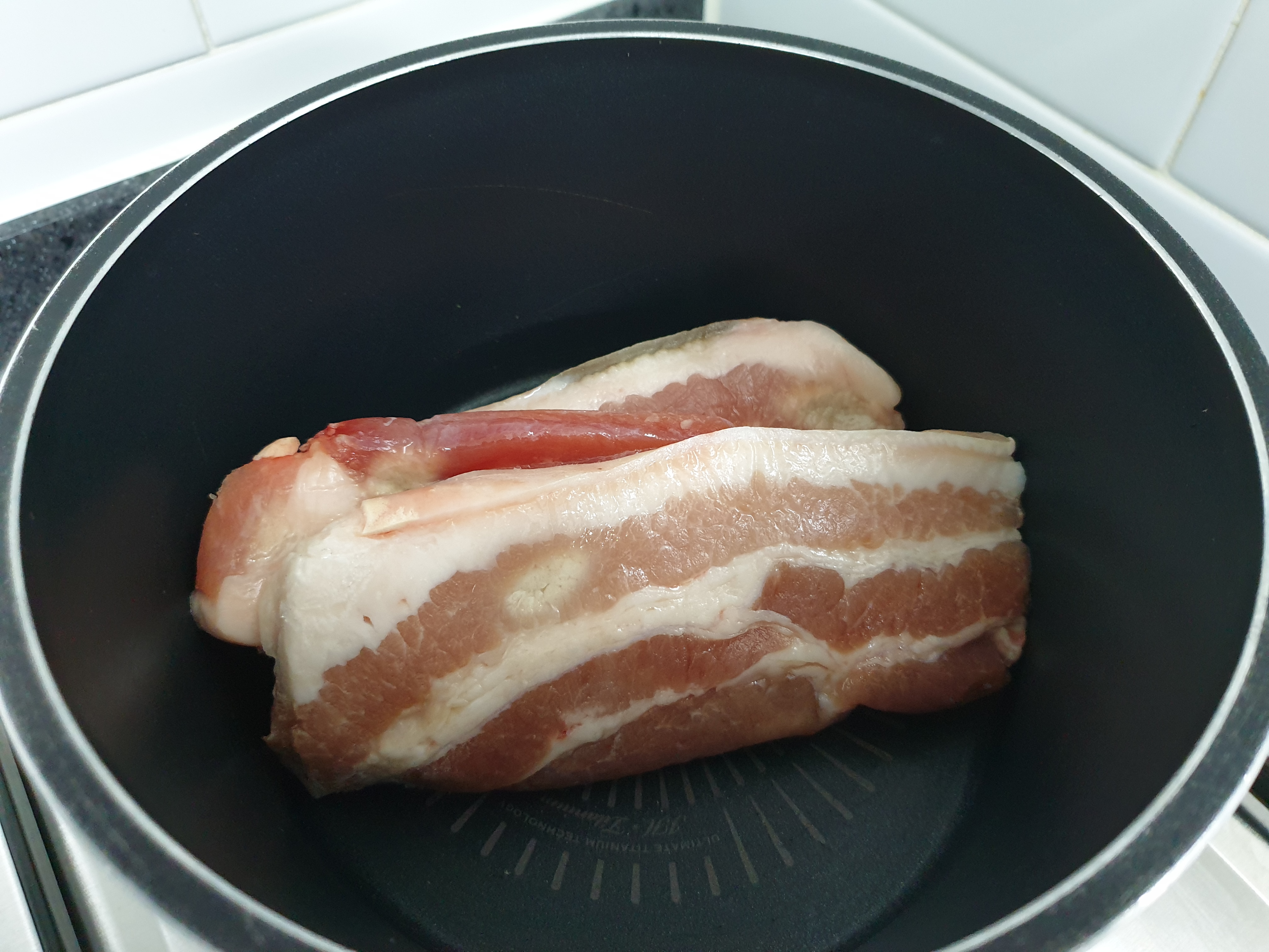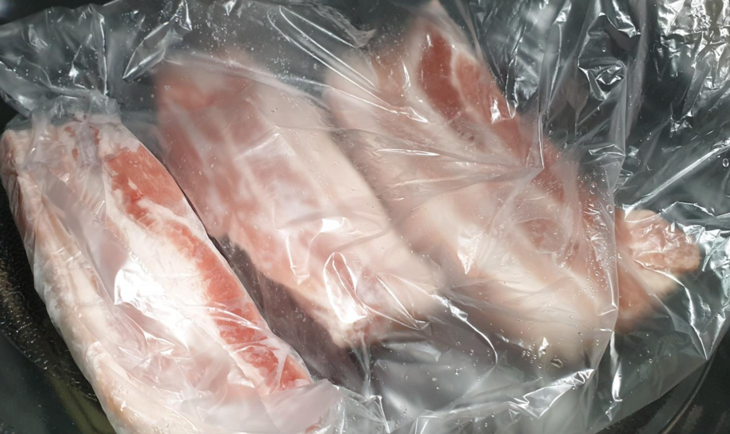 우선 보관된 돼지고기를 꺼내어 준비합니다. 김치찜을 만들 때는 지방이 들어가 있는 고기가 맛이 있어서 삼겹살용으로 준비하였습니다. 앞다리살도 무관합니다.(뒷다리살은 지양합니다 ㅎㅎ)