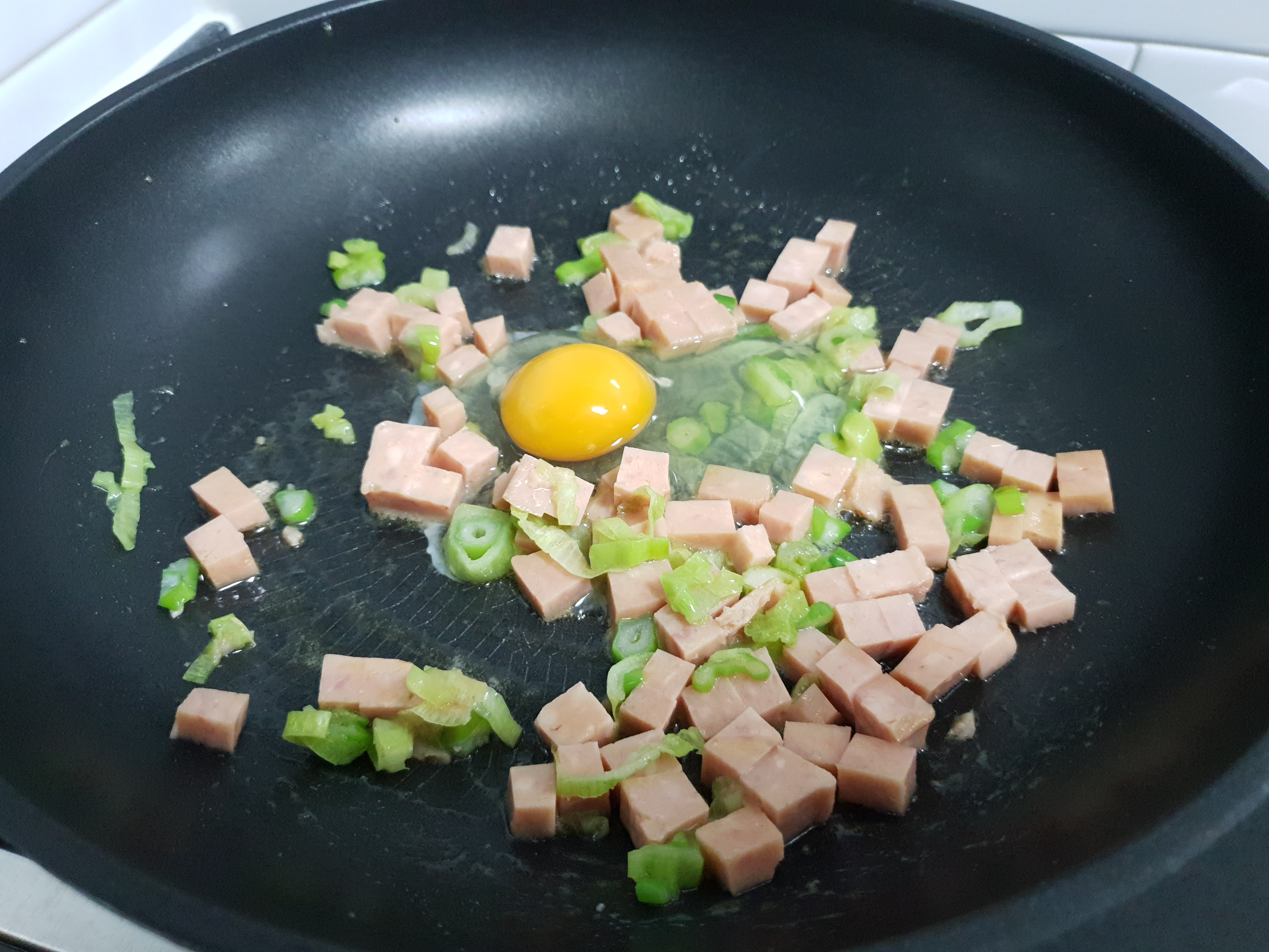 추가적으로 스팸을 넣고 중불에 30초간 같이 볶아주세요.