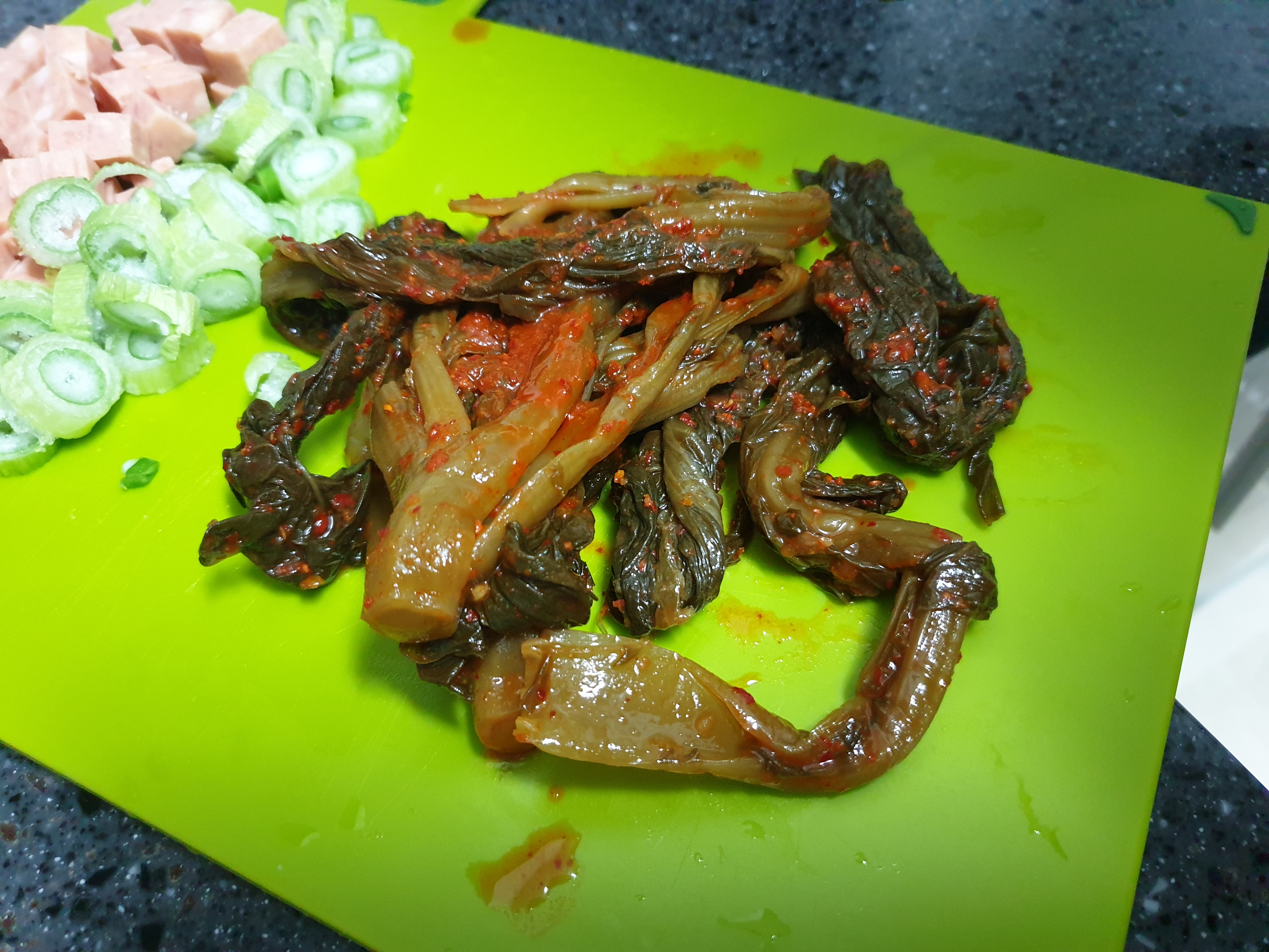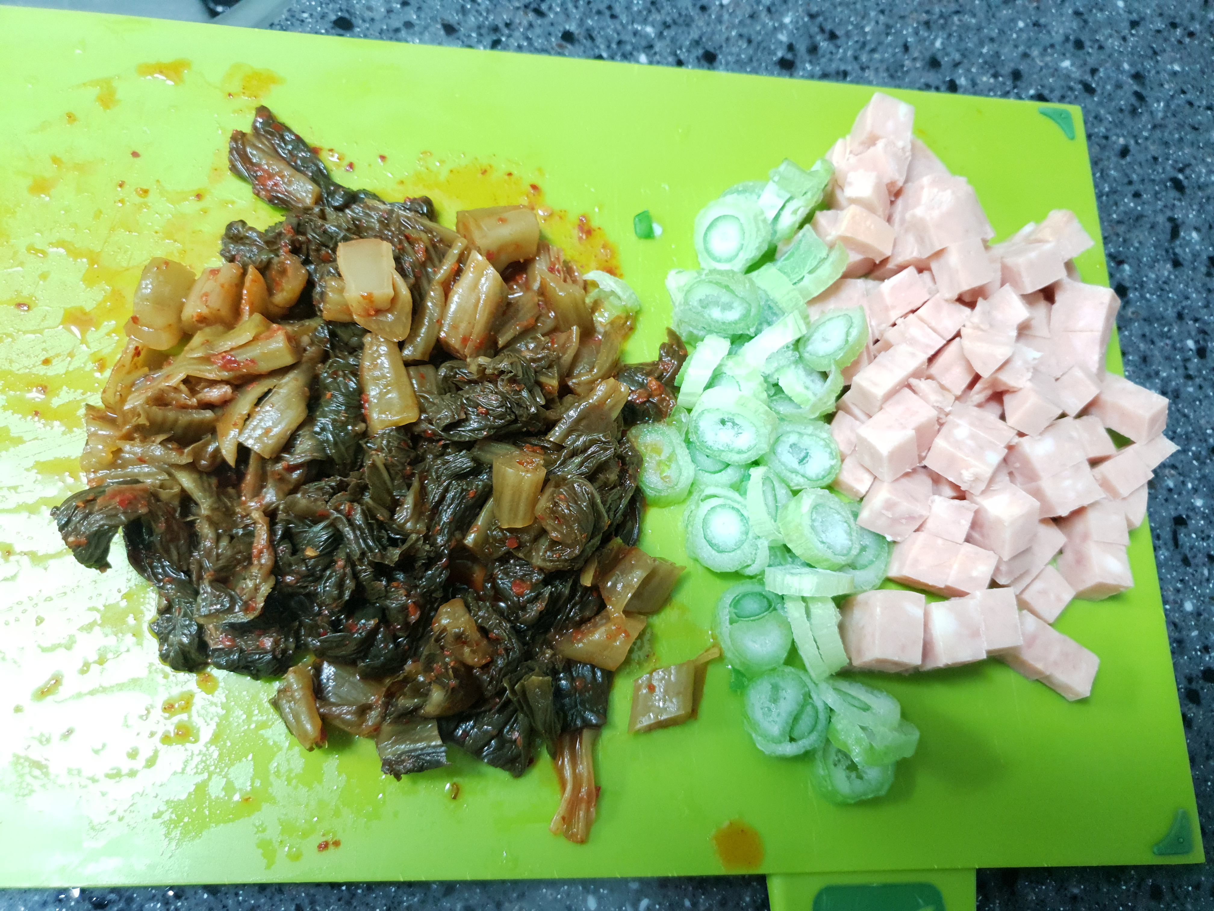 스팸과 쪽파, 그리고 갓김치를 썰어 준비해둔 사진입니다.
