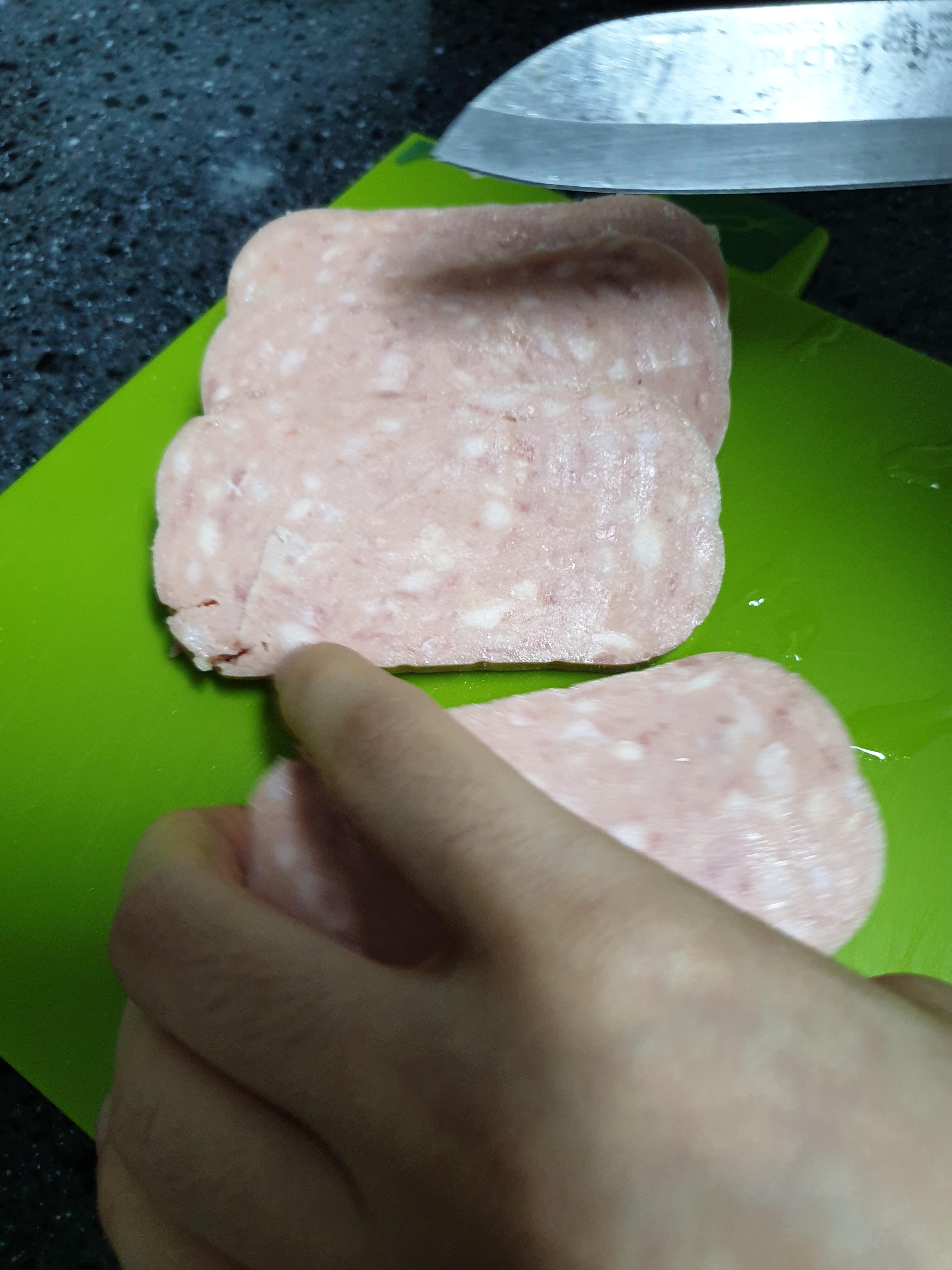 런천미트(190g)를 꺼내서 먹기 좋은 크기로 사진과 같이 썰어줍니다. 런천미트는 약 100g만 사용하면 충분합니다. 나머지는 랩에 잘 보관하여 냉동실에 얼려주도록 하세요 ㅎㅎ 다음 요리를 위해서 말이죠!