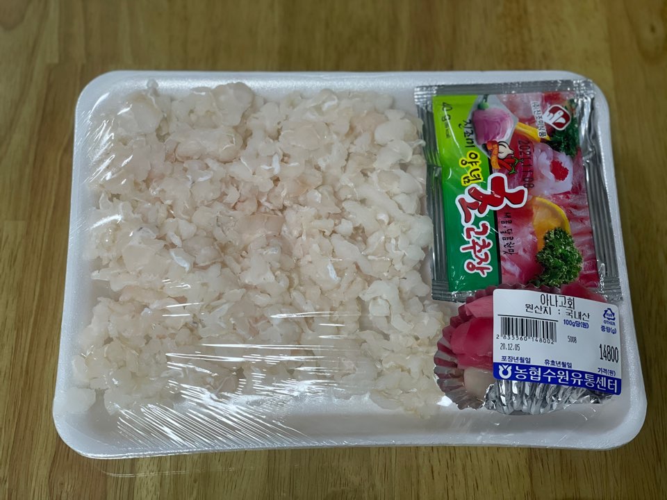 하나로마트 수원점에서 판매하는 자연상 방어는 29,900원이었고, 아나고회는 14,800원입니다. 초고추장을 각각 랩으로 포장해 주네요.(g당 가격에 따라 다를 수 있습니다.)