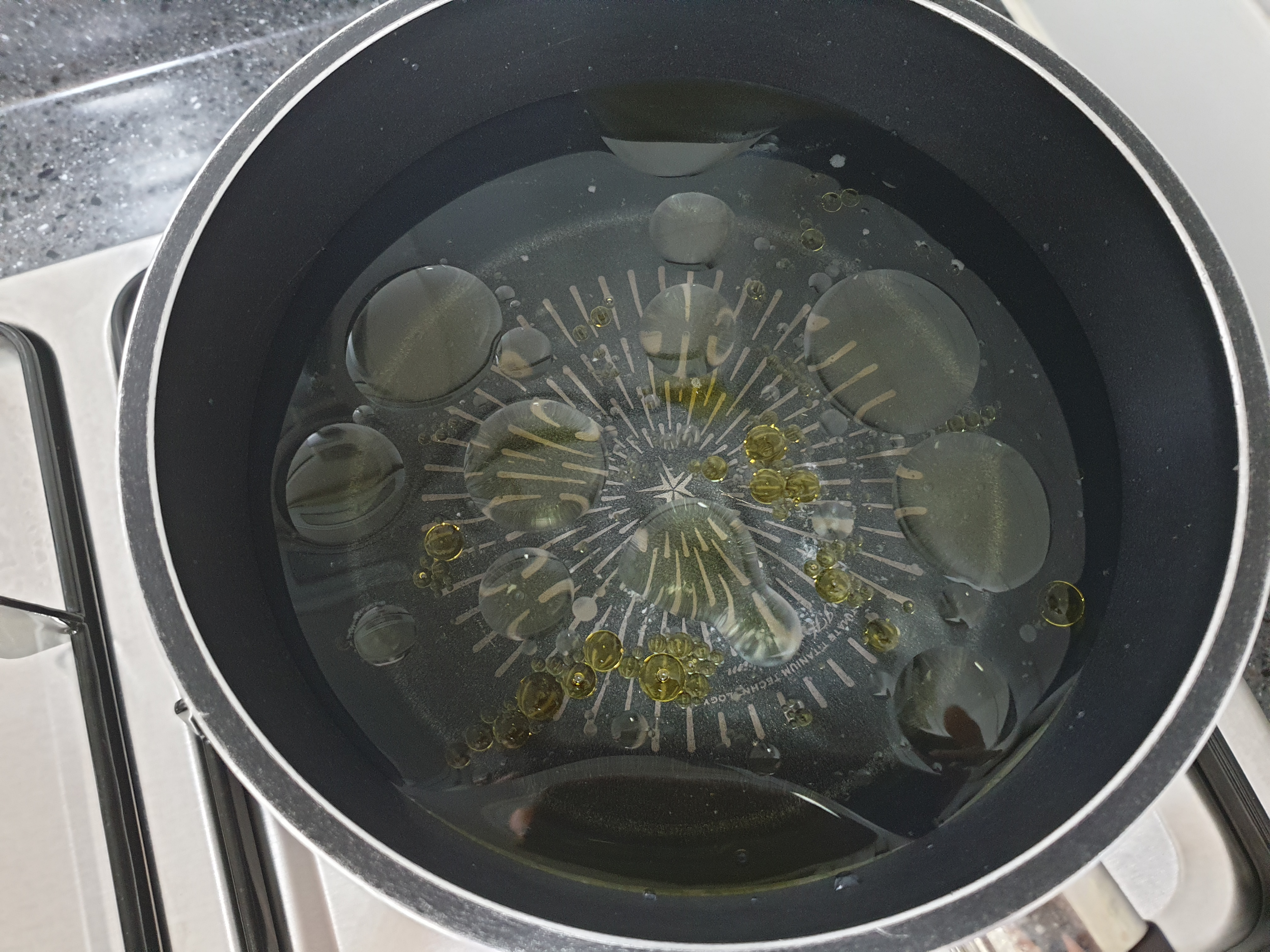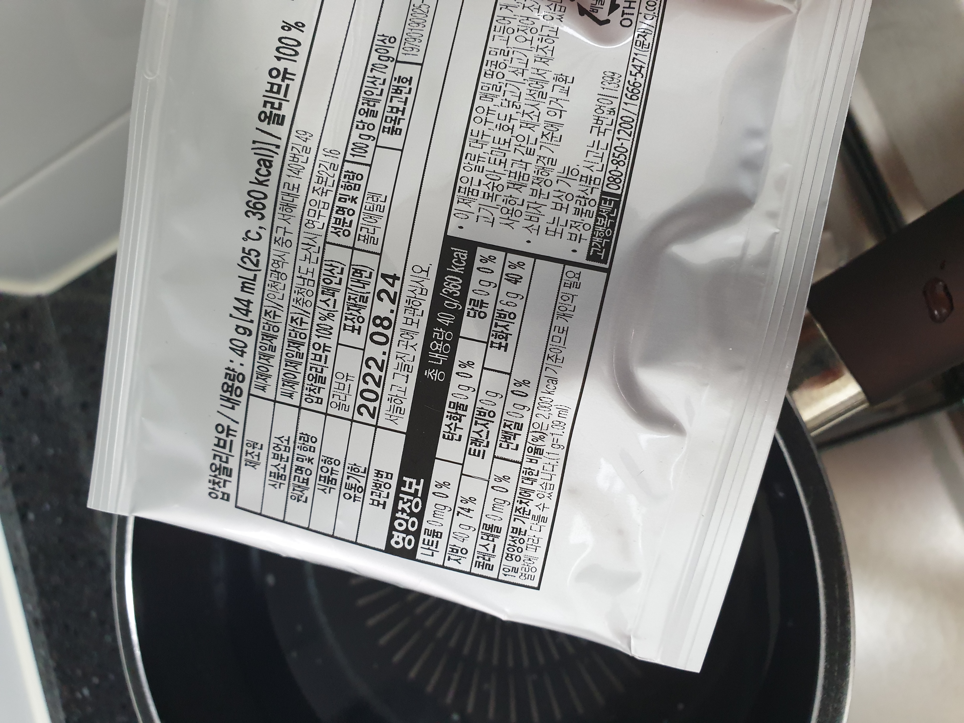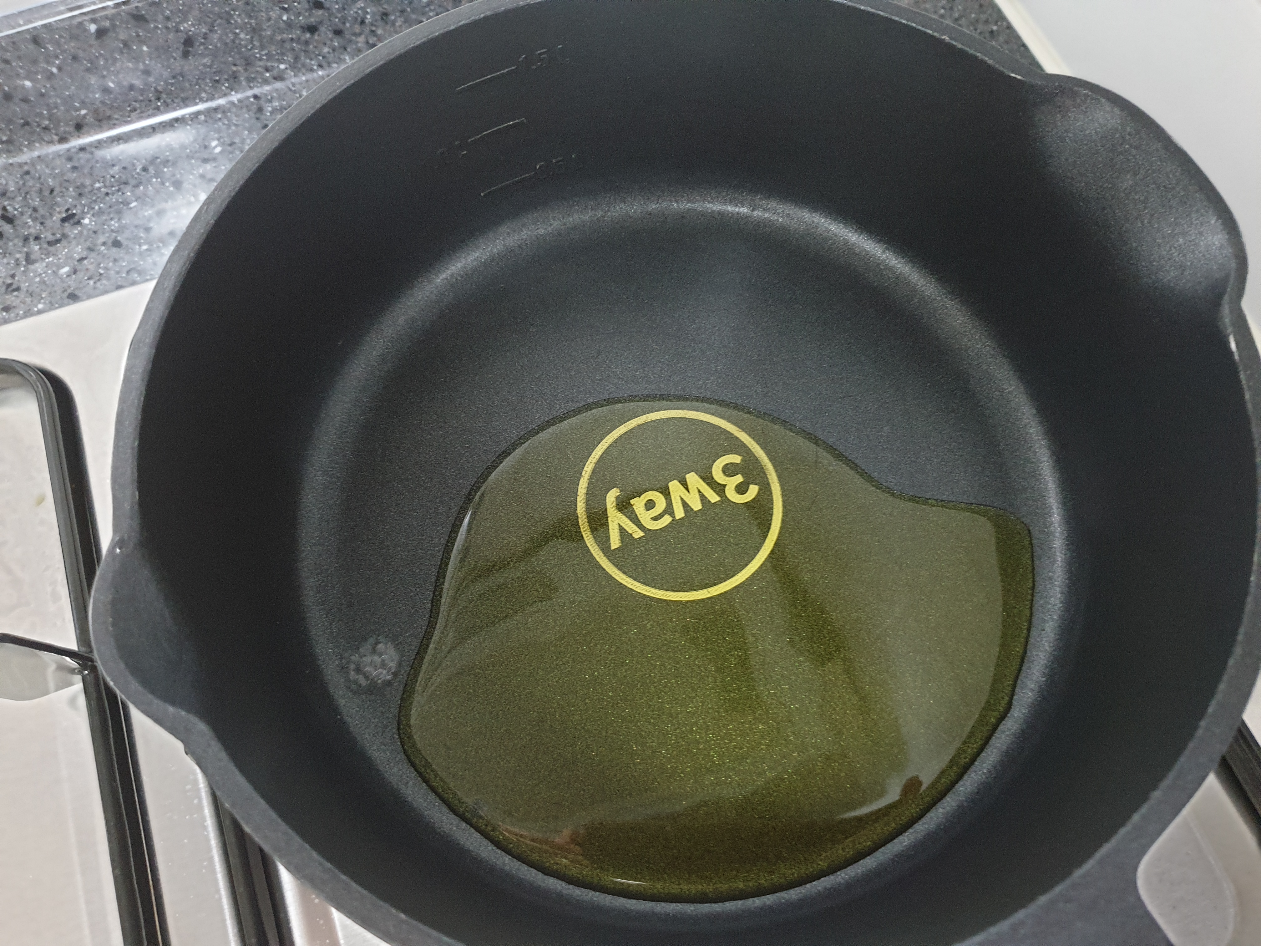 물 1500ml에 소금 1스푼(약 3g), 올리브유 1/2팩을 냄비에 넣습니다.