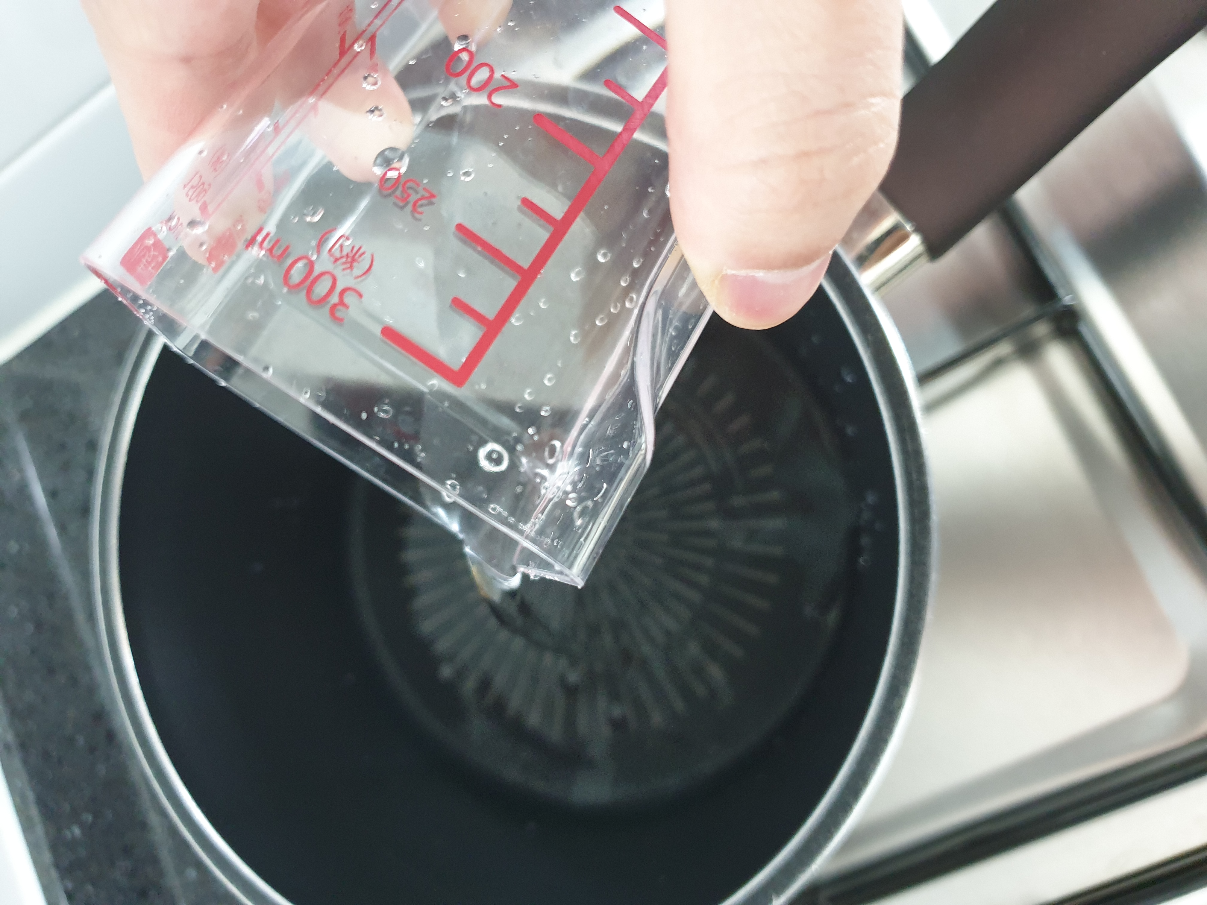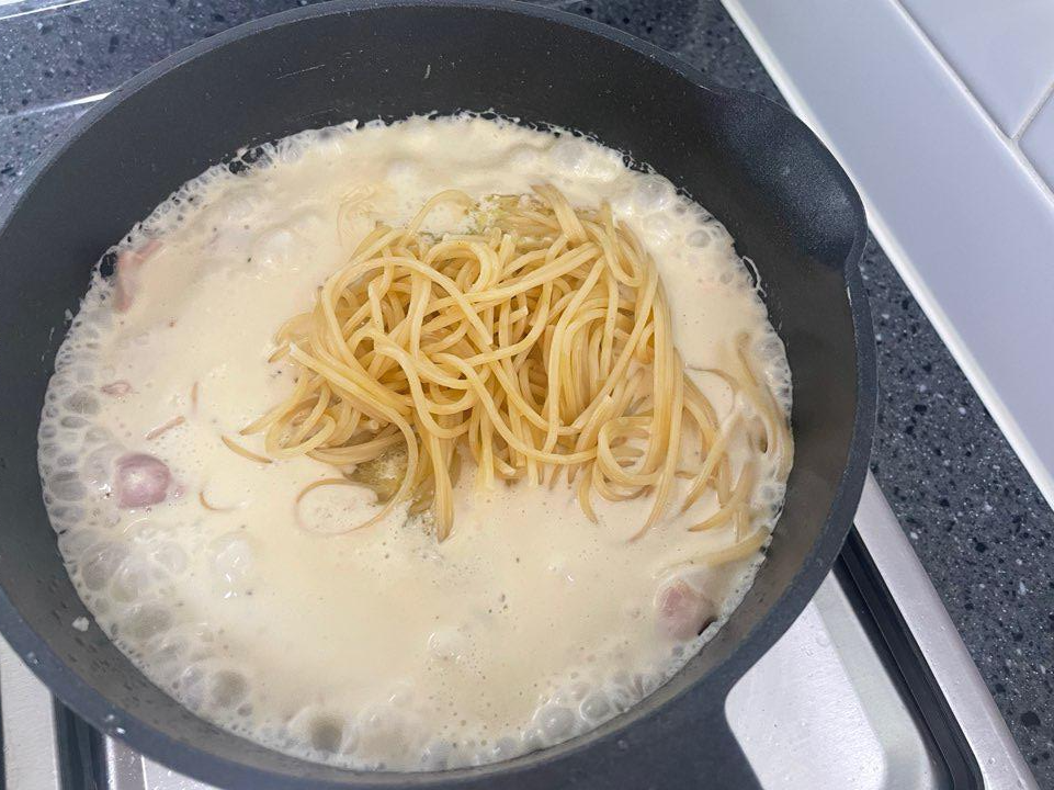 준비해 둔 면수 1컵과 크림파스타소스 2팩을 넣어주세요.