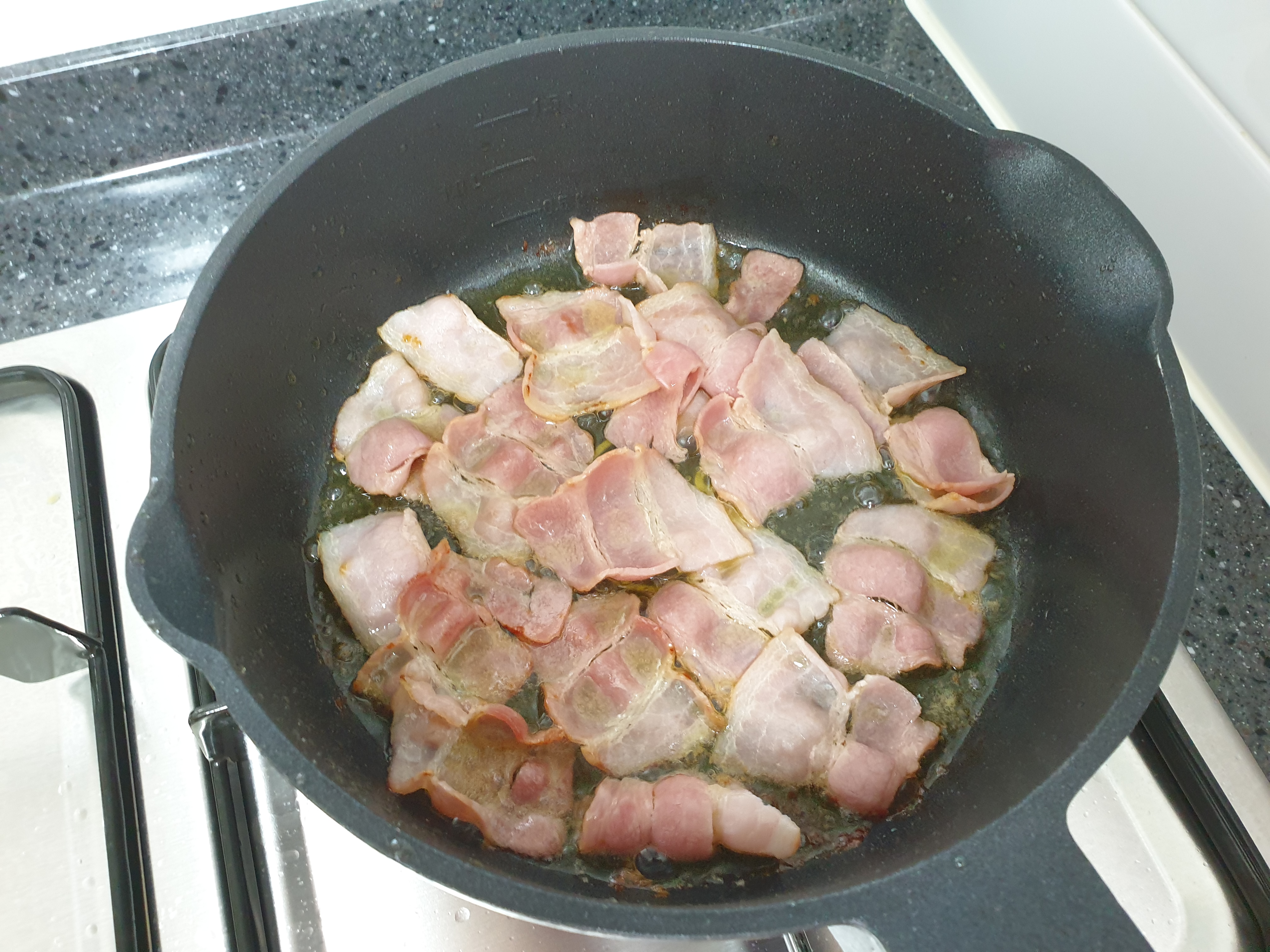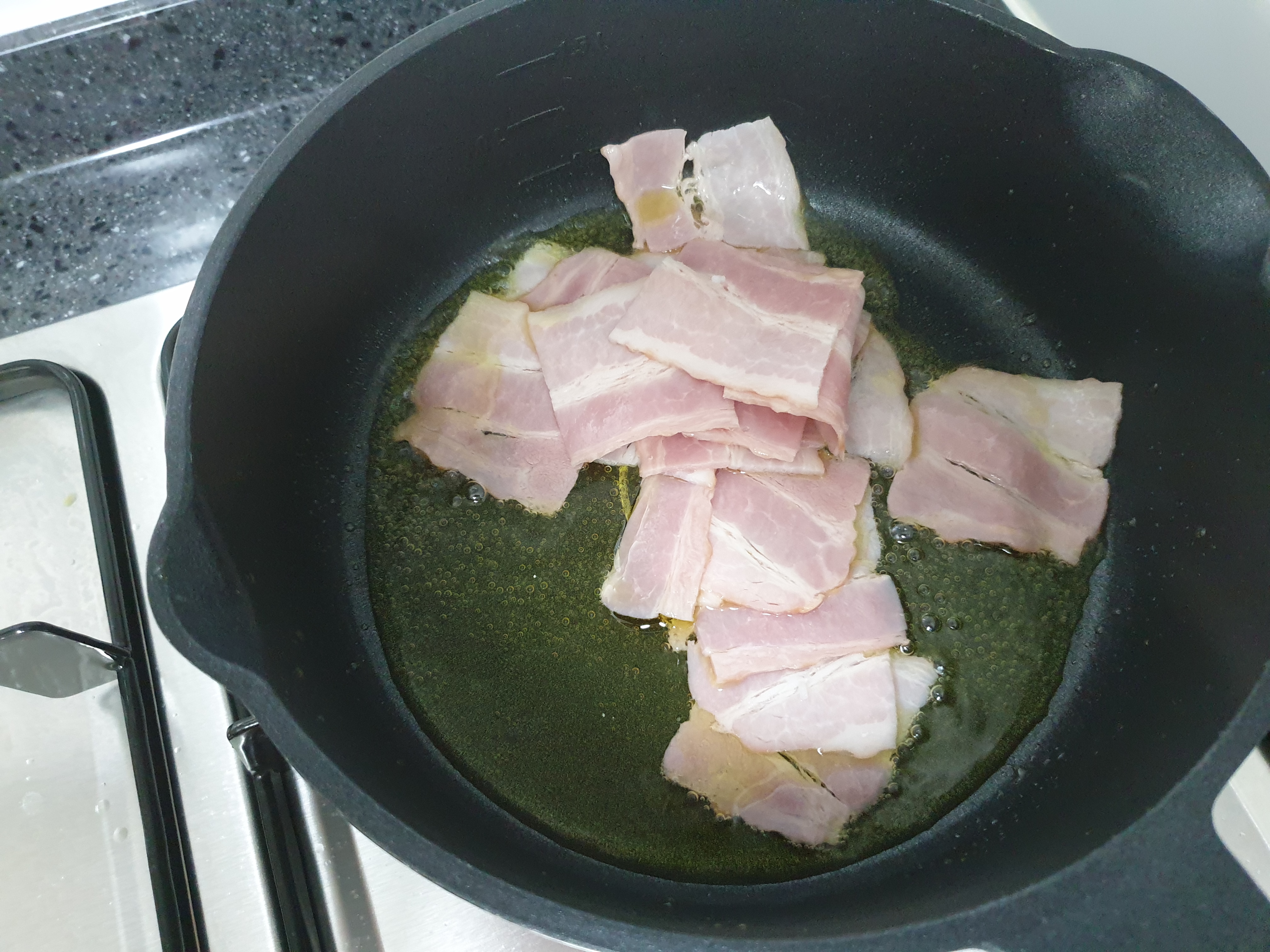 프라이팬을 달구고 나서 남은 올리브유1/2팩을 넣어줍니다. 베이컨을 팬에 넣고 센 불에서 약 2분간 볶아줍니다.