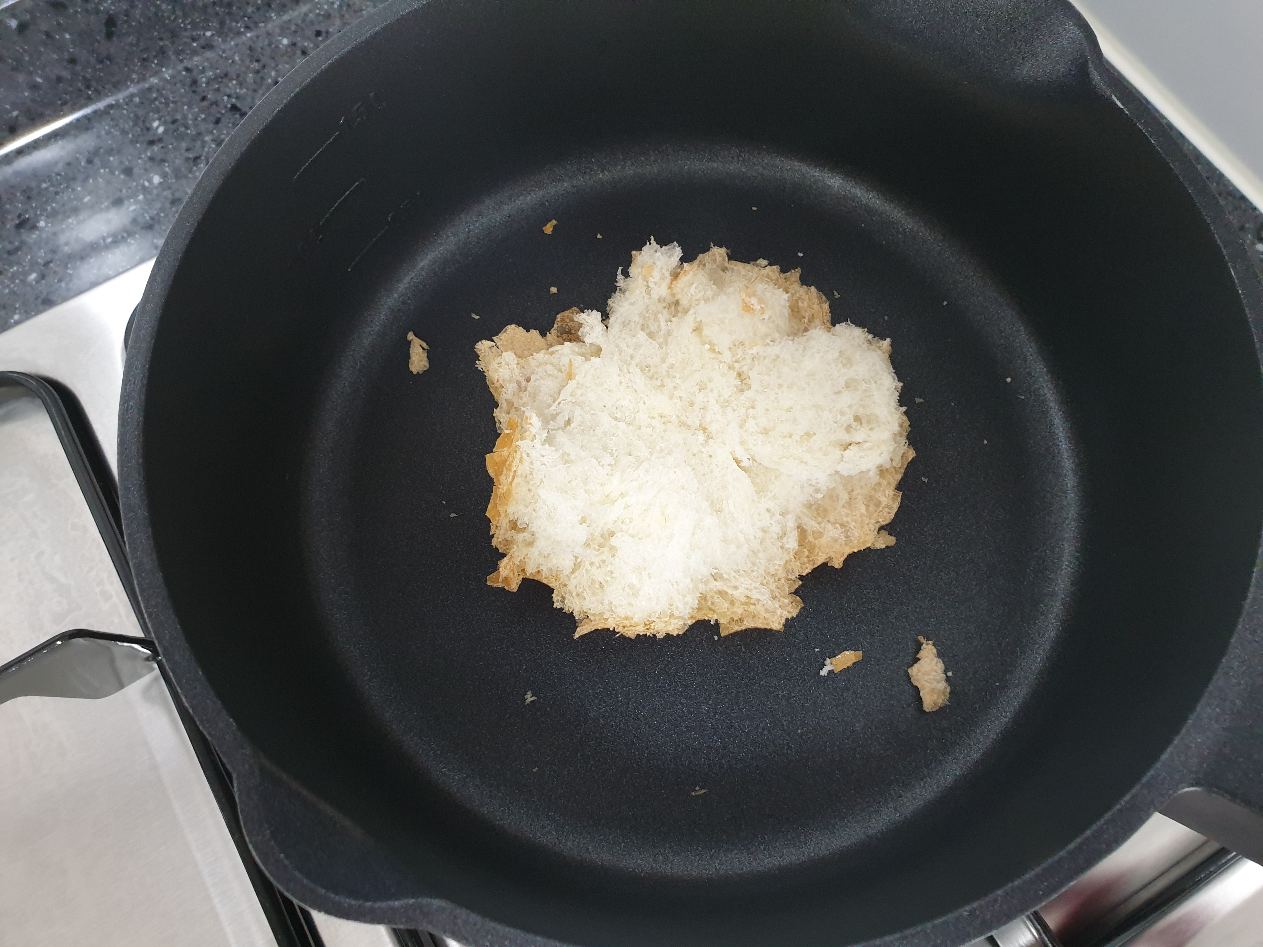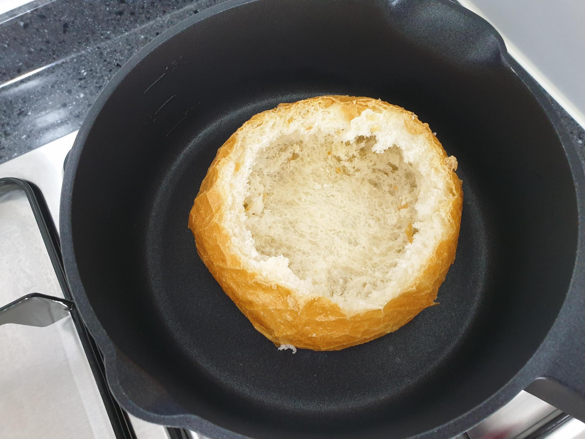 빵의 뚜껑, 빵의 용기, 빵의 속 부분을 중불로 살짝 구워주세요.
