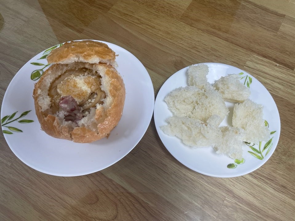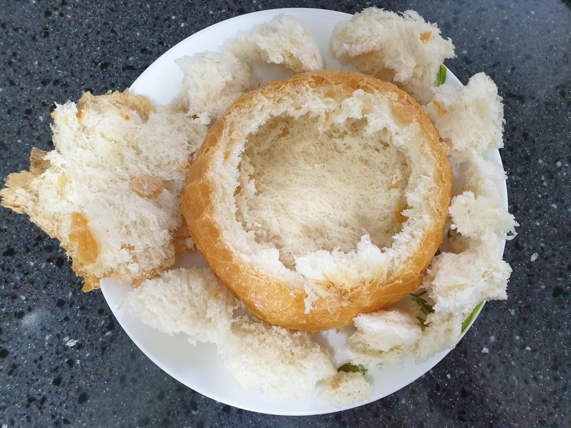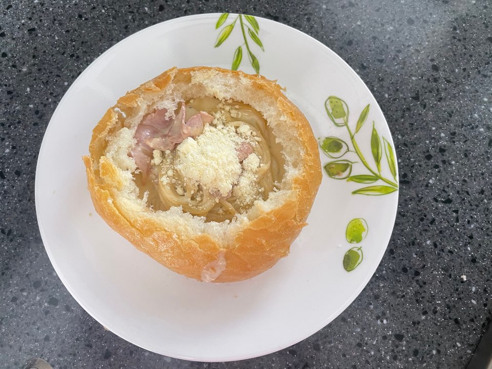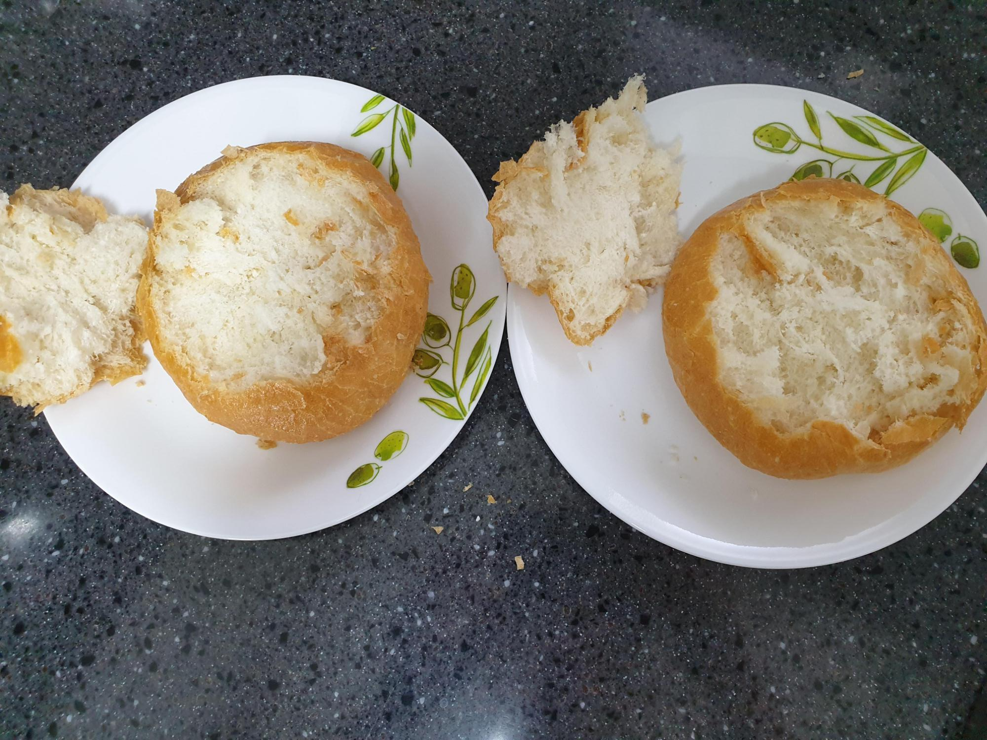 빵의 가운데 부분을 파내어 파스타를 담을 용기로 사용해주세요. 빵의 속 부분은 먹기 좋은 크기로 뜯어주시면 됩니다.