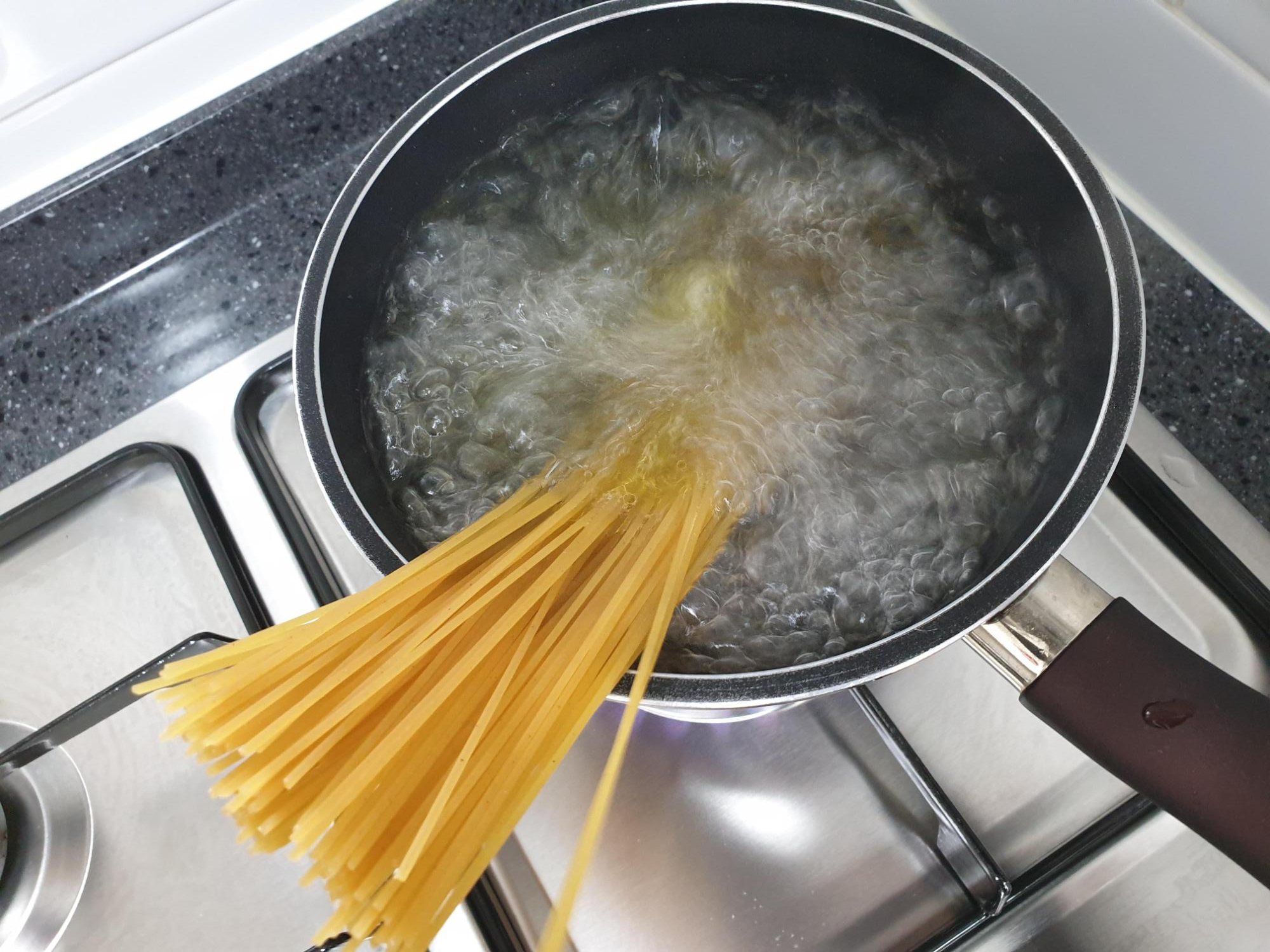 파스타 면은 전체의 1/3만 사용해주시면 2인분 용으로 딱 알맞습니다. 그럼에도 불구하고 빵과 같이 먹으면 3인분의 양이 나오더라고요. 파스타 면을 넣고 6분간 센 불에서 삶아줍니다.