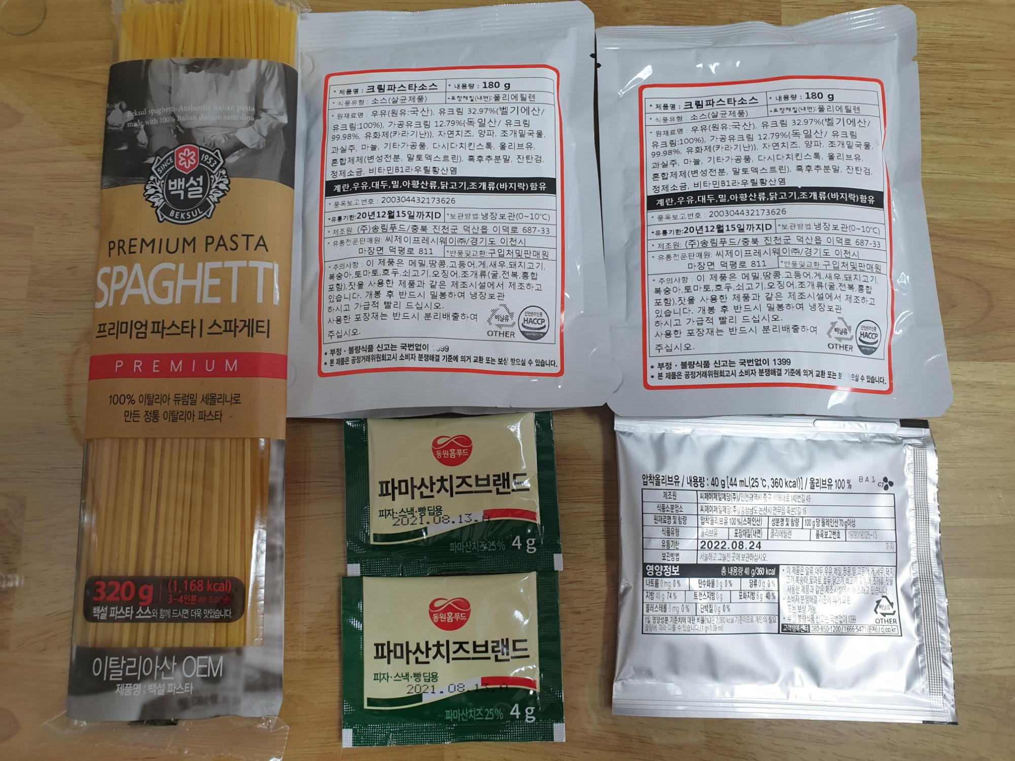추가적으로 크림파스타소스 2팩, 올리브유 1팩, 베이컨 1팩, 파마산(치즈가루) 2팩, 파스타면 1팩으로 구성되어 있습니다.