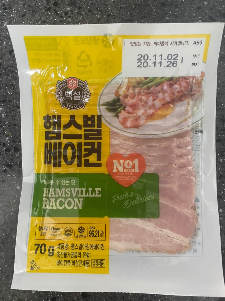 베이컨을 먹기 좋은 크기로 잘라서 준비해 줍니다. 동봉된 베이컨을 반으로 자르면 됩니다^^