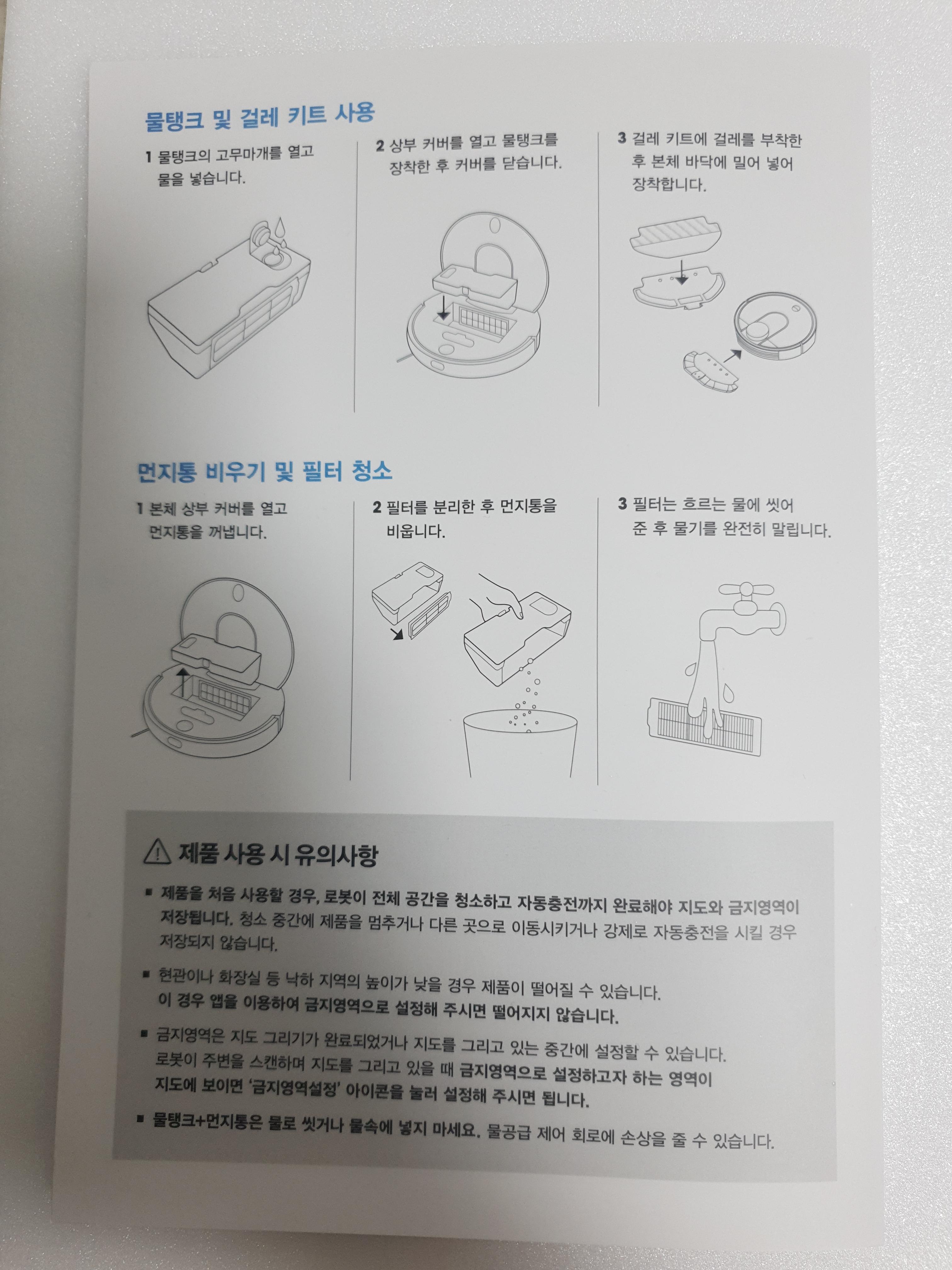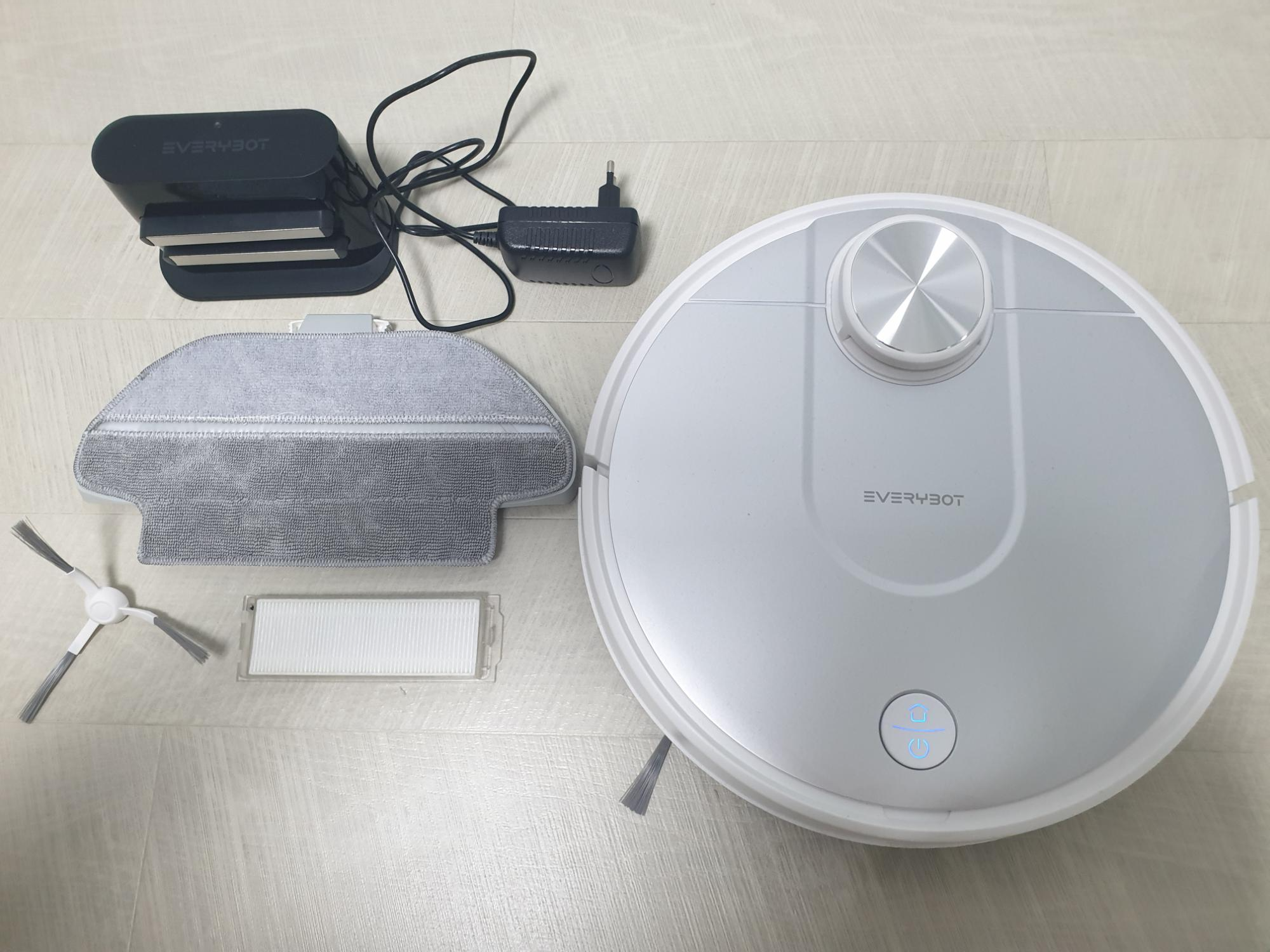 충전기, 사이드 브러시, 극세사 걸레가 장착된 키트, 헤파필터로 구성되어 있습니다. 에브리봇3i는 물걸레 청소 기능도 탑재하고 있지만 저는 오직 일반 청소기 기능만 사용합니다. 물걸레와 일반 청소 기능을 동시에 사용하면 청소 성능이 저하될 수 있다고 생각하기 때문입니다. 일반 청소를 실시 후 따로 물걸레 청소를 실행하는 게 좋아 보입니다.(그래서 저는 에브리봇 엣지 물걸레 청소기를 따로 구매하여 사용하고 있습니다^^)