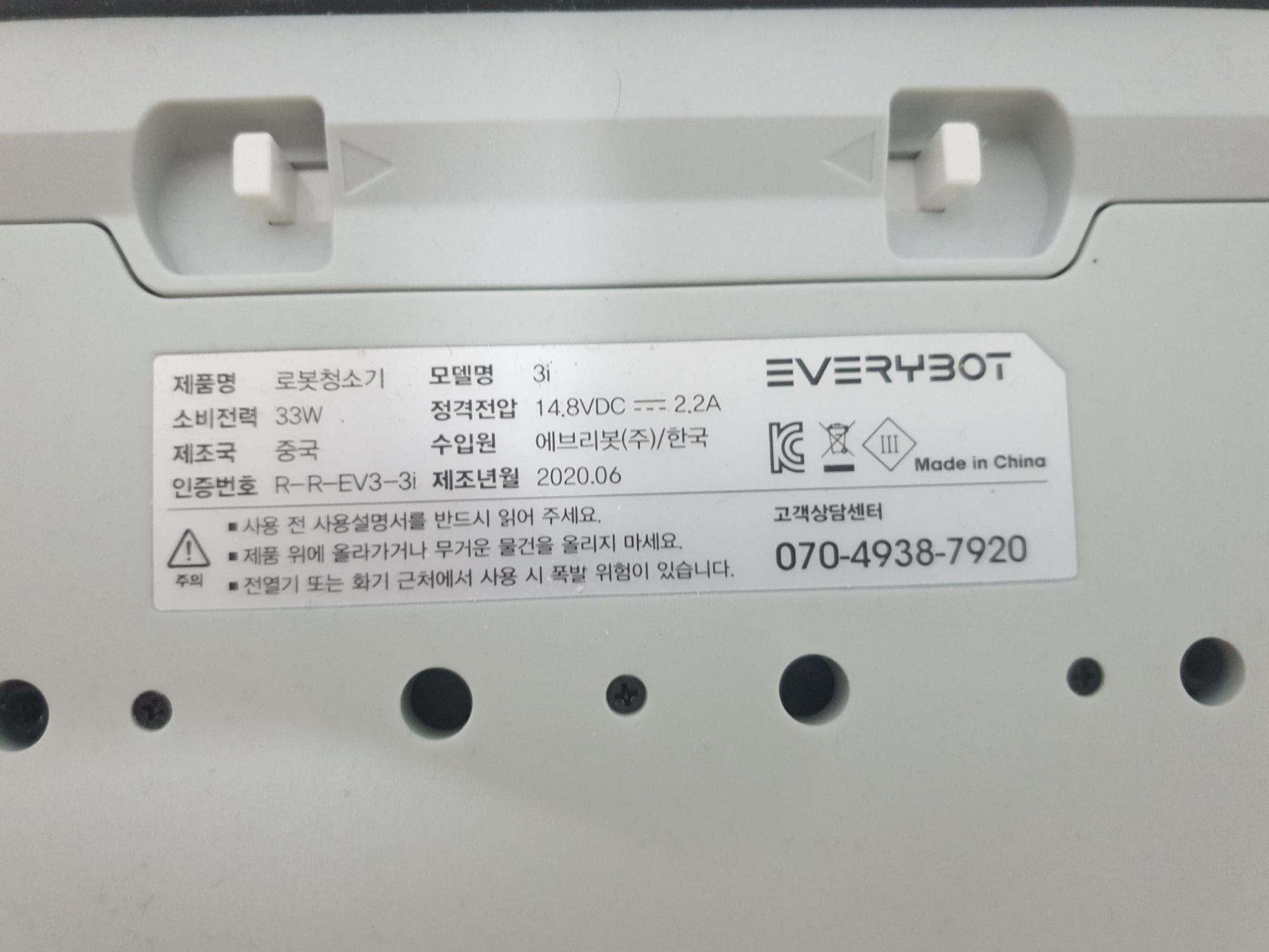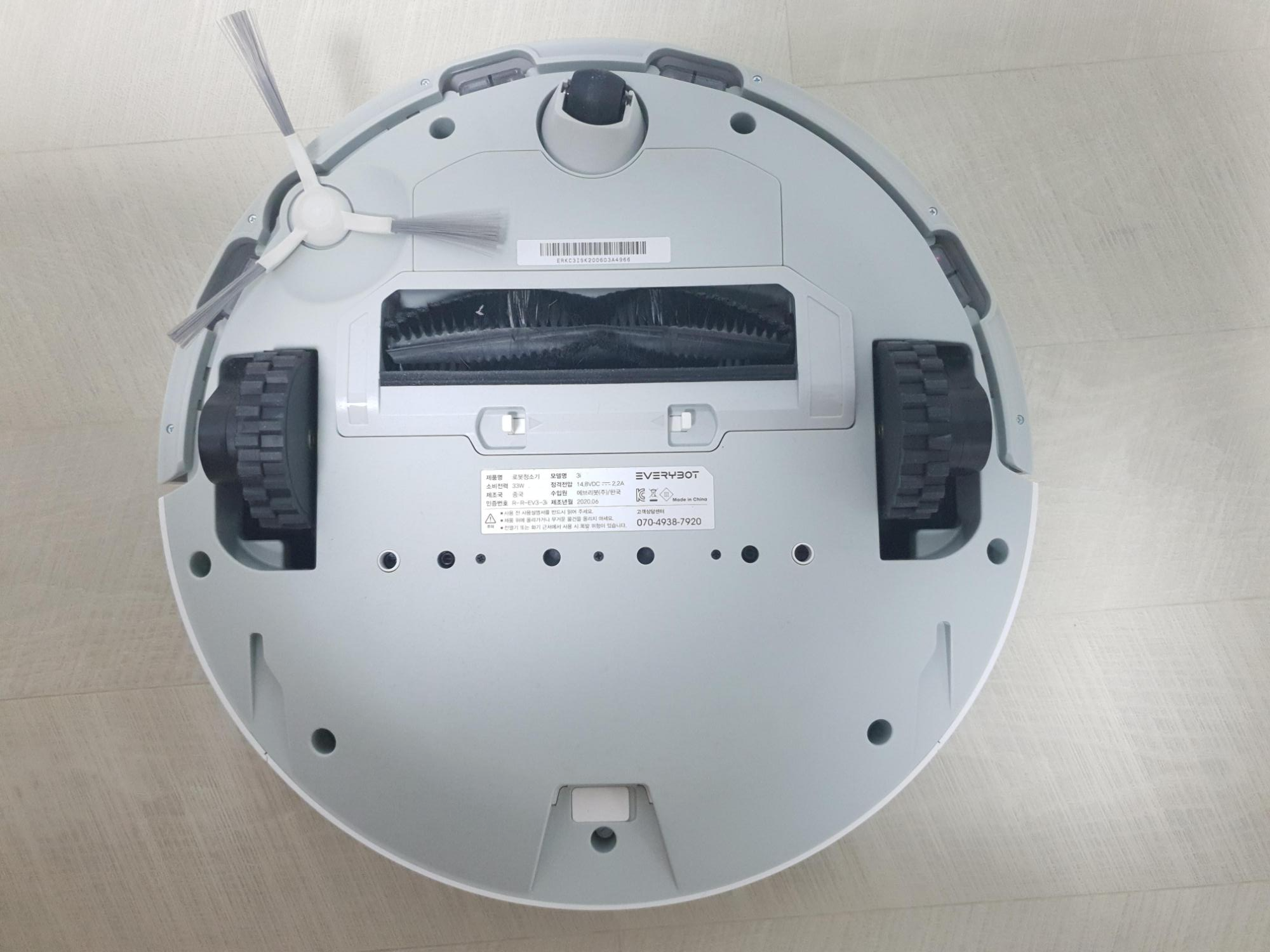 에브리봇3i 뒷면의 모습입니다. 바퀴와 브러시가 보입니다. 제품명, 모델명, 제조국, 제조년월 등이 적혀있습니다.