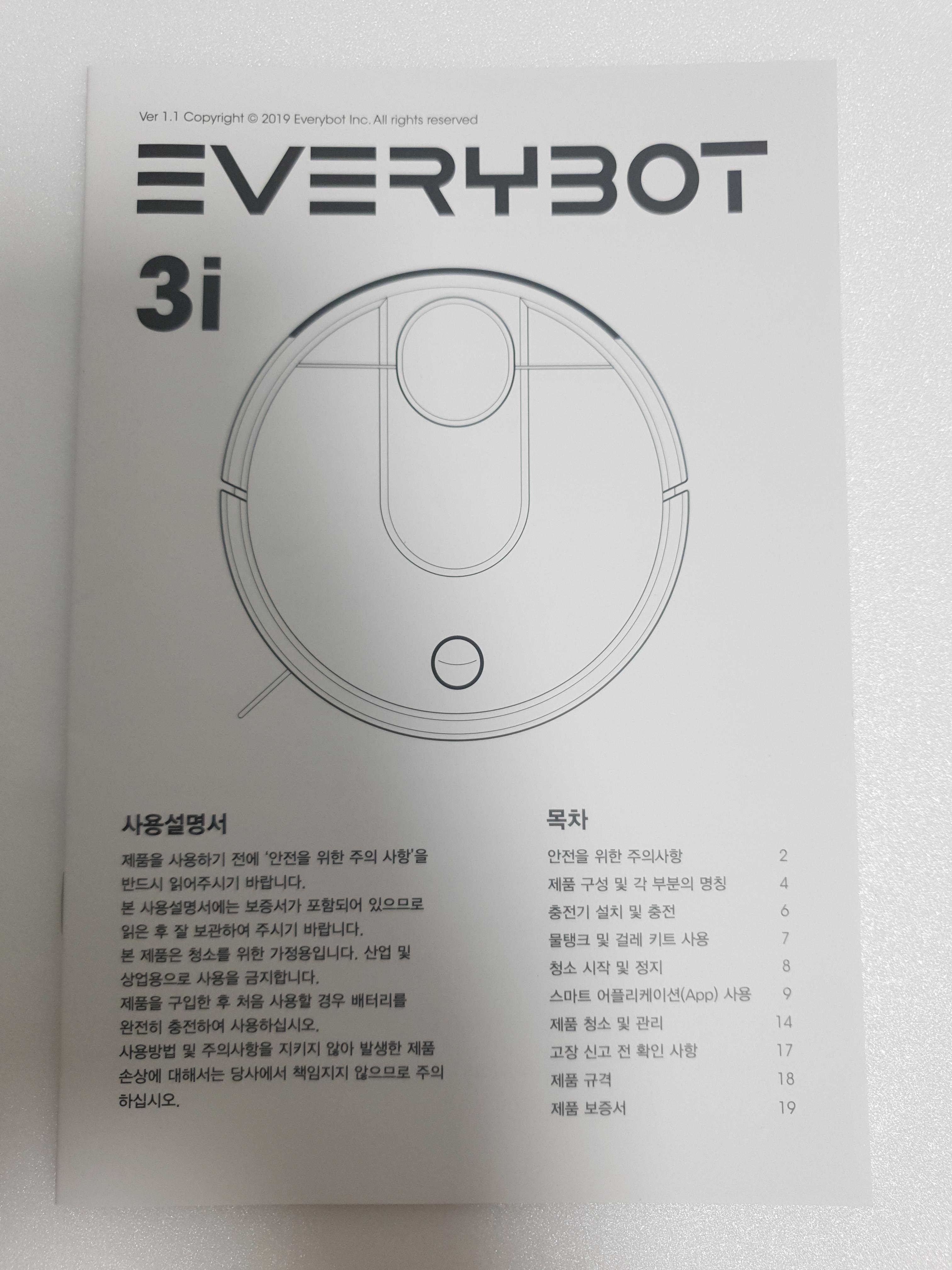 에브리봇3i 사용설명서입니다. 우선 제품이 제대로 왔는지 확인하기 위해서는 이 부분을 보아야 합니다.