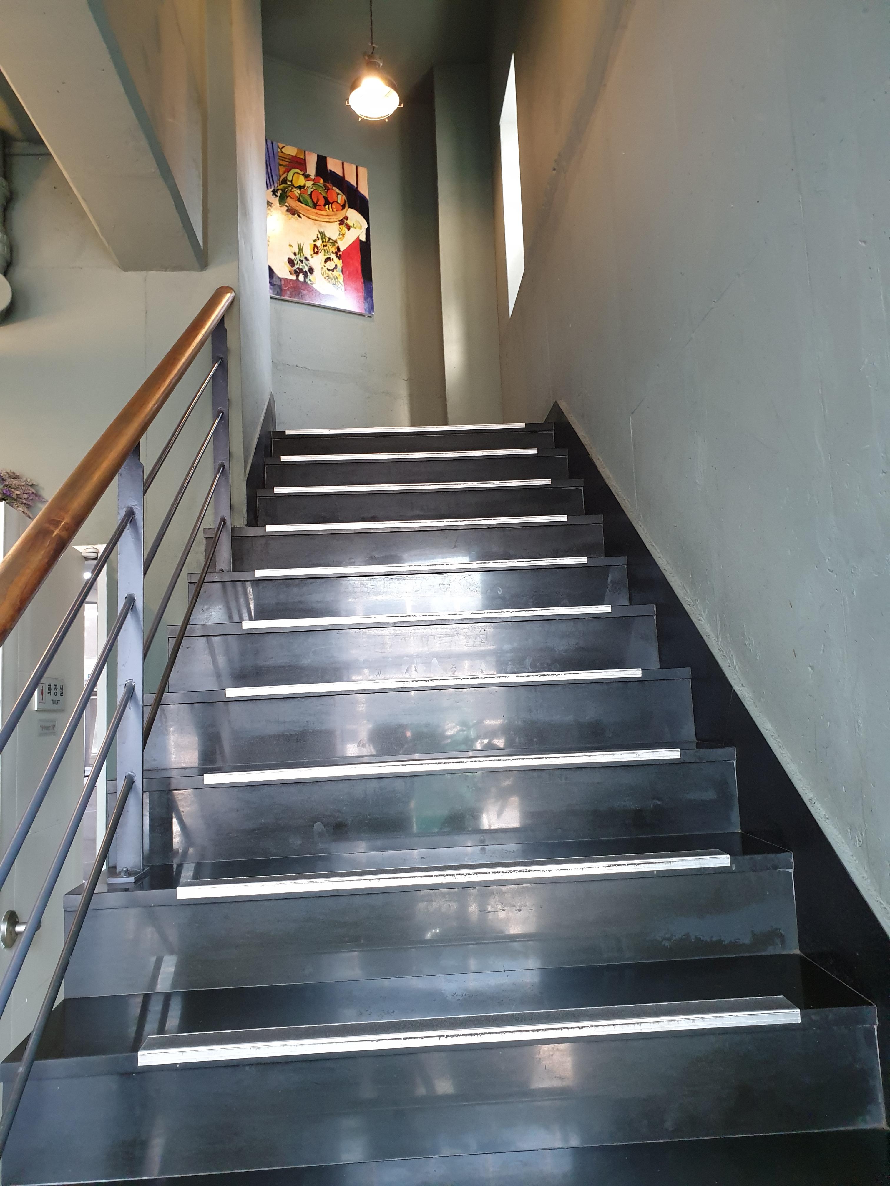 카운터에서 오른쪽을 보면 2층으로 올라가는 계단이 보입니다. 계단을 통해 2층으로 올라갔습니다. 야외를 볼 수 있는 창가 자리가 있습니다.