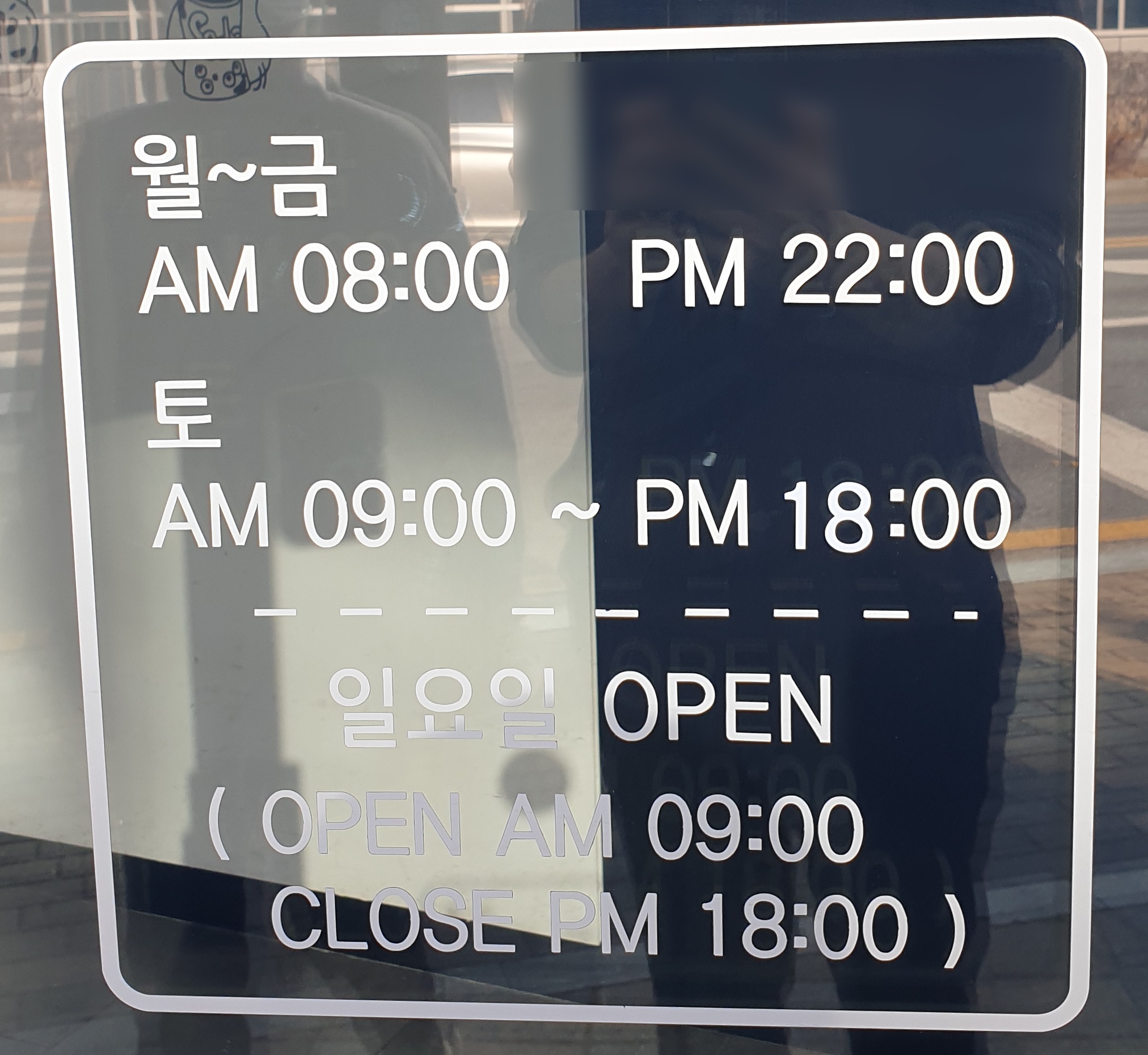 위스크 카페의 입구 모습입니다. 메뉴에 대한 소개와 광고들이 보입니다. 영업시간은 월요일부터 금요일은 8:00 ~ 22:00이며, 토요일과 일요일은 9:00 ~ 18:00까지 영업합니다.