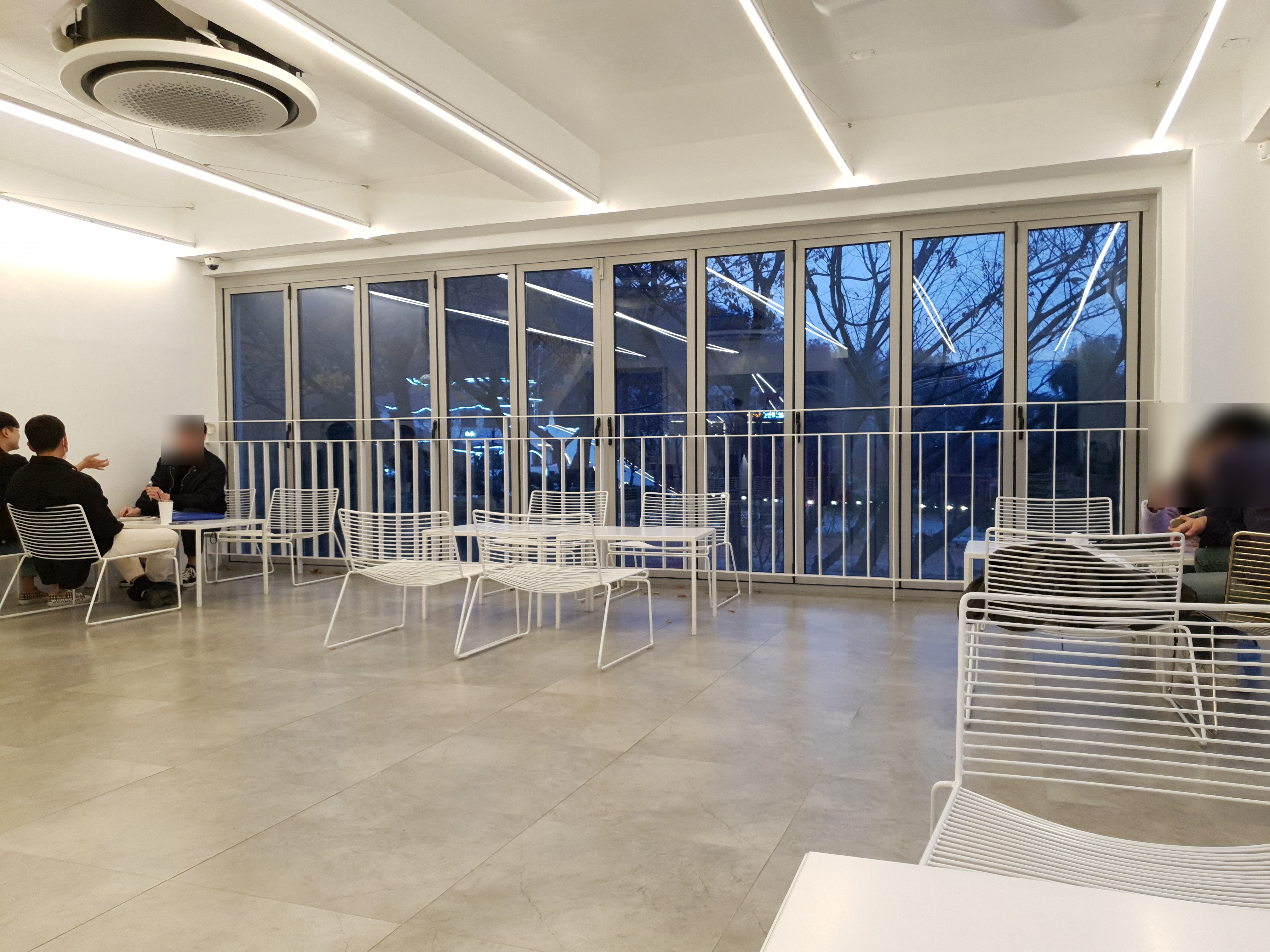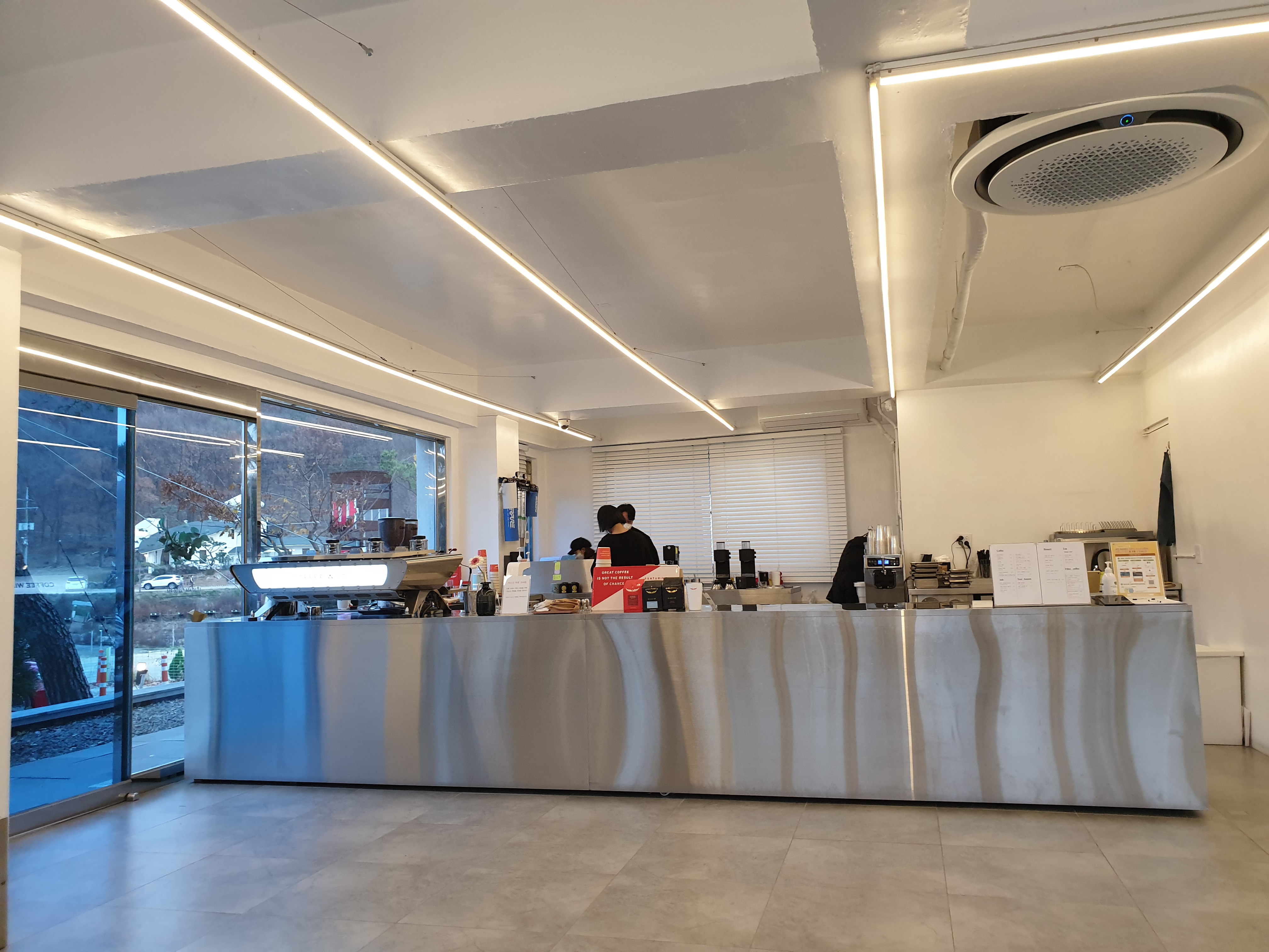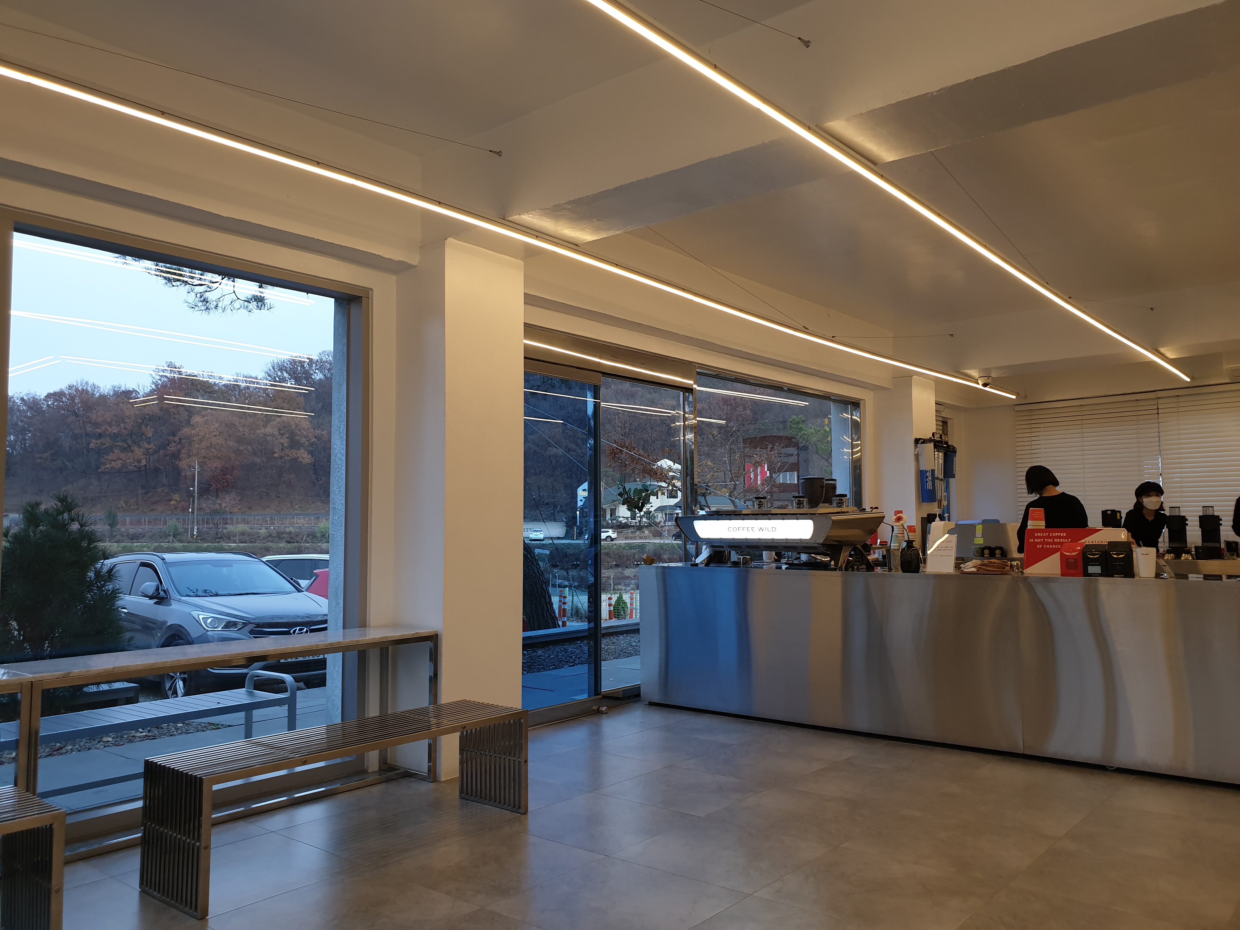 어느덧 저녁시간이 된 커피와일드의 모습입니다. 어두워질수록 커피와일드 내부 모습이 더욱 심플하고 깔끔하게 다가옵니다.