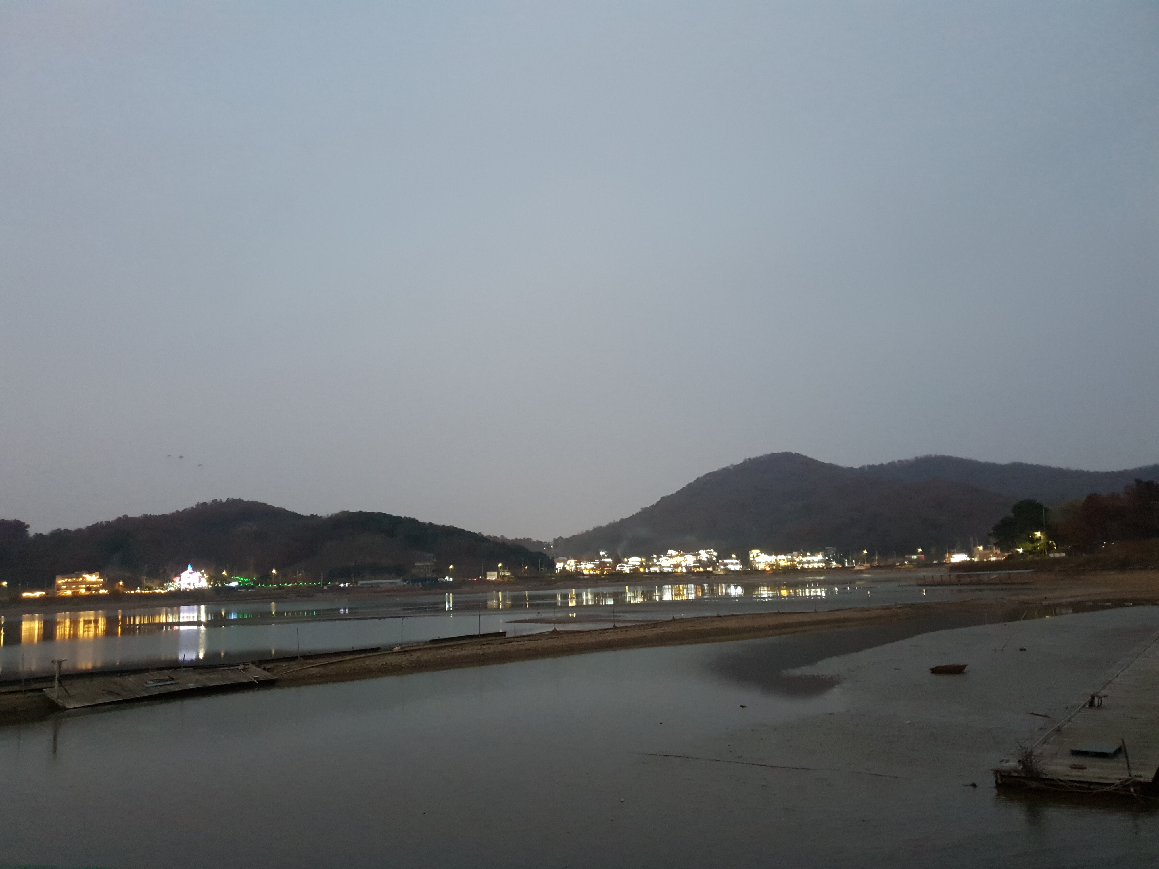 창문 넘어로 해가 저물어가는 저수지의 풍경이 저를 감상에 젖어들게 합니다. 구석에는 물과 냅킨 그리고 물티슈도 비치되어 있습니다.