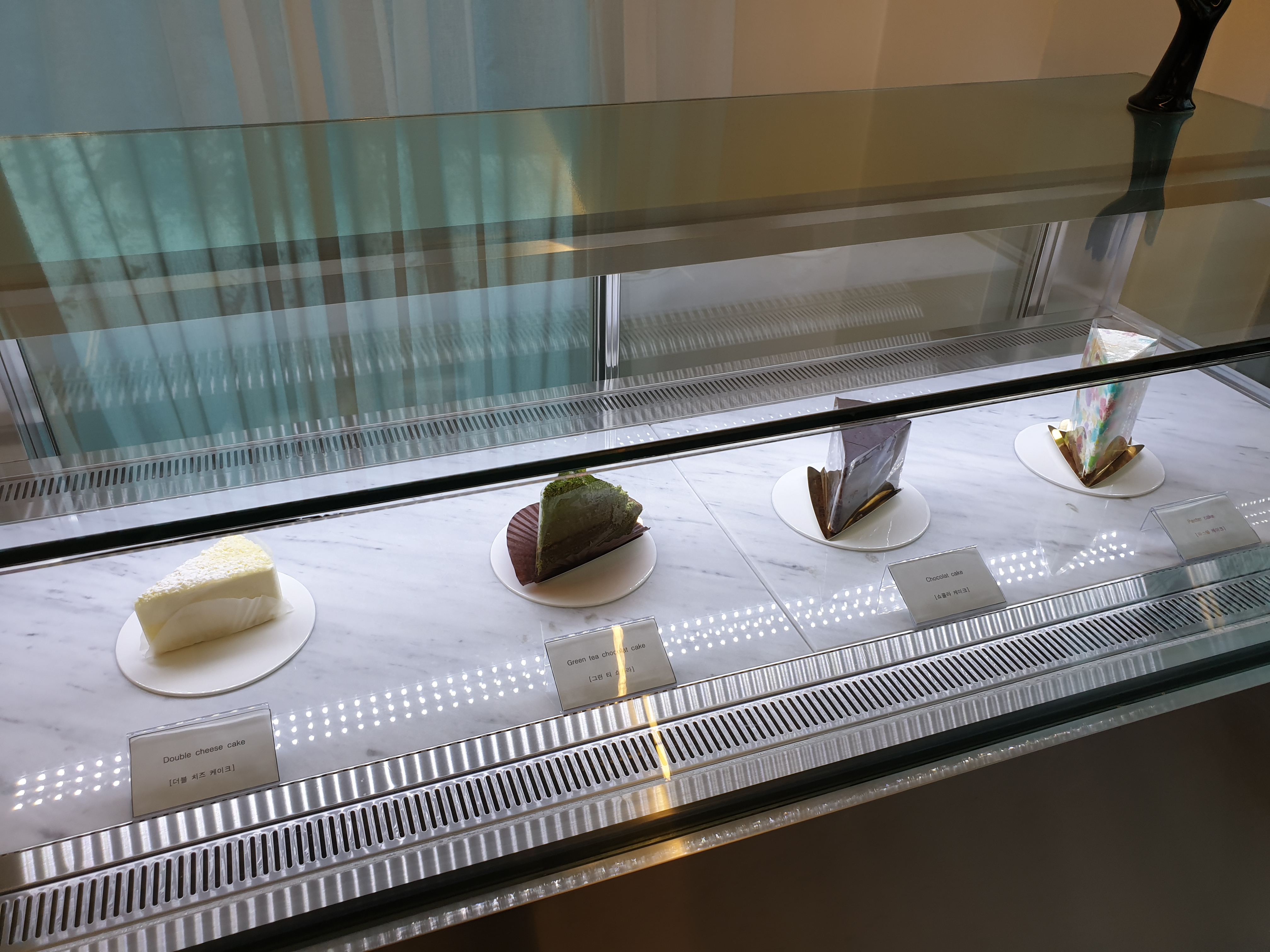 1층의 한쪽에는 케익들이 진열되어 있습니다.