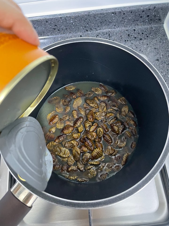 유동 번데기 한통을 냄비에 부어줍니다. 국물까지 전체를 넣어주세요:)