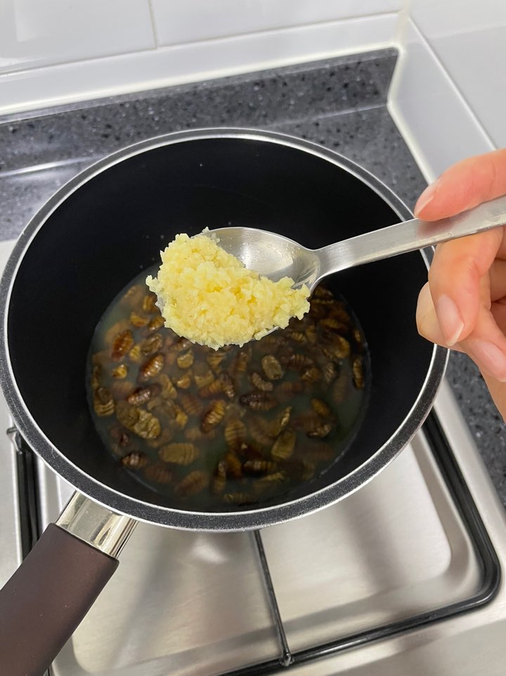 다음으로 다진 마늘을 큰술의 2/3 정도 넣어주세요. 다진마늘을 통해 번데기 특유의 비린내를 살짝 잡아주며, 감칠맛을 돌게 하기 위해 첨가하였습니다.