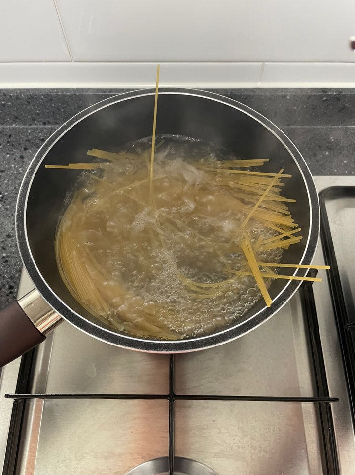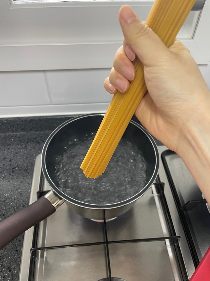 파스타 면은 500원짜리 동전만큼의 직경을 끓는 물에 넣어줍니다. 2인분 정도의 양입니다.