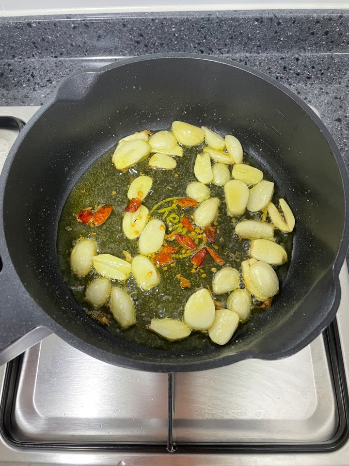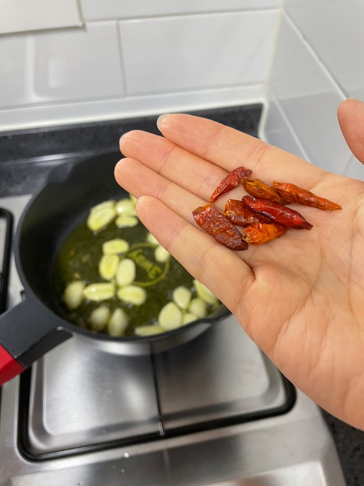 페페론치노홀을 약 7개 정도 반으로 쪼개어 넣어주세요. 페페론치노홀은 오일 파스타의 느끼함을 잡아주기 때문에 첨가해 주었습니다. 매운 것을 잘 못 드시는 분은 조금만 넣어주시면 됩니다.