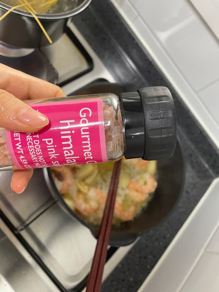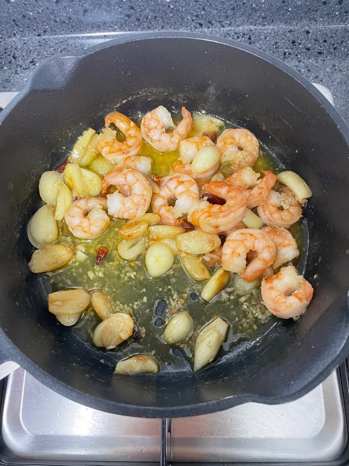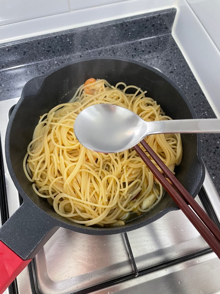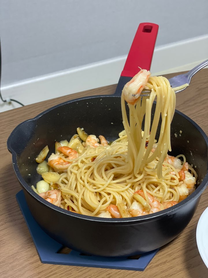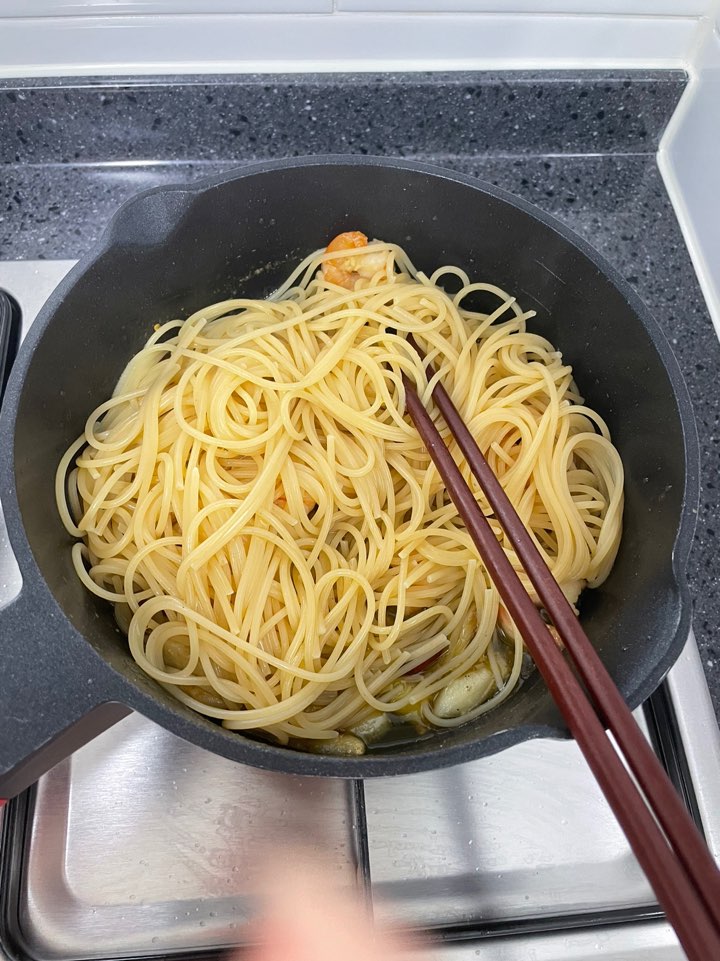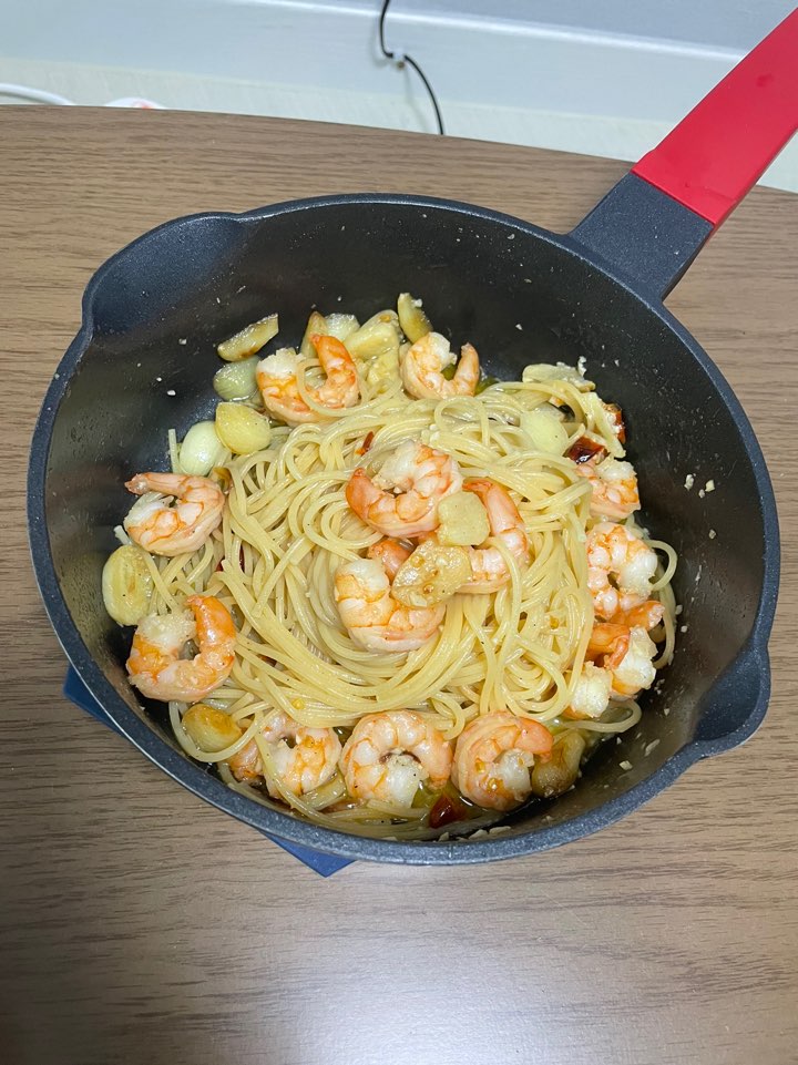 중불에 1분 30초에서 2분가량 볶아주세요. 드디어 새우 오일 파스타가 완성되었습니다. 오일 파스타의 부드러움과 살짝 매콤한 맛이 미각을 자극하였습니다. 느끼하지 않으면서도 짭짤하게 입에 딱 맞았습니다.