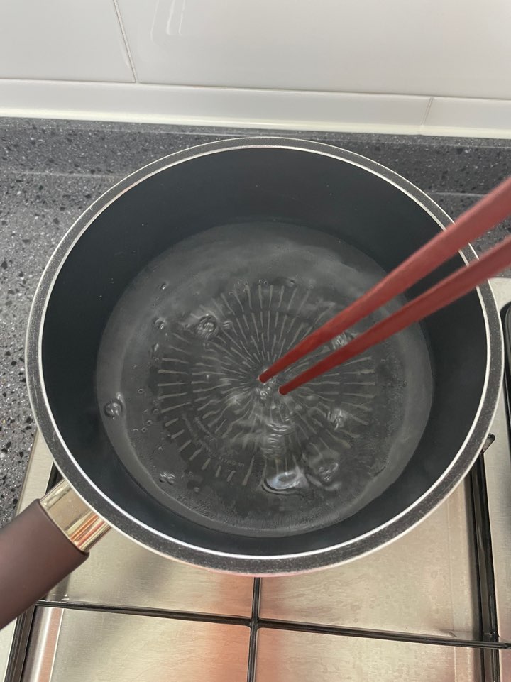 7분간 센 불에 면을 끓여주세요! 면이 다 끓으면 면수 120ml(종이컵으로 2/3 정도)를 덜어주세요. 그리고 면을 건져내어 주세요.