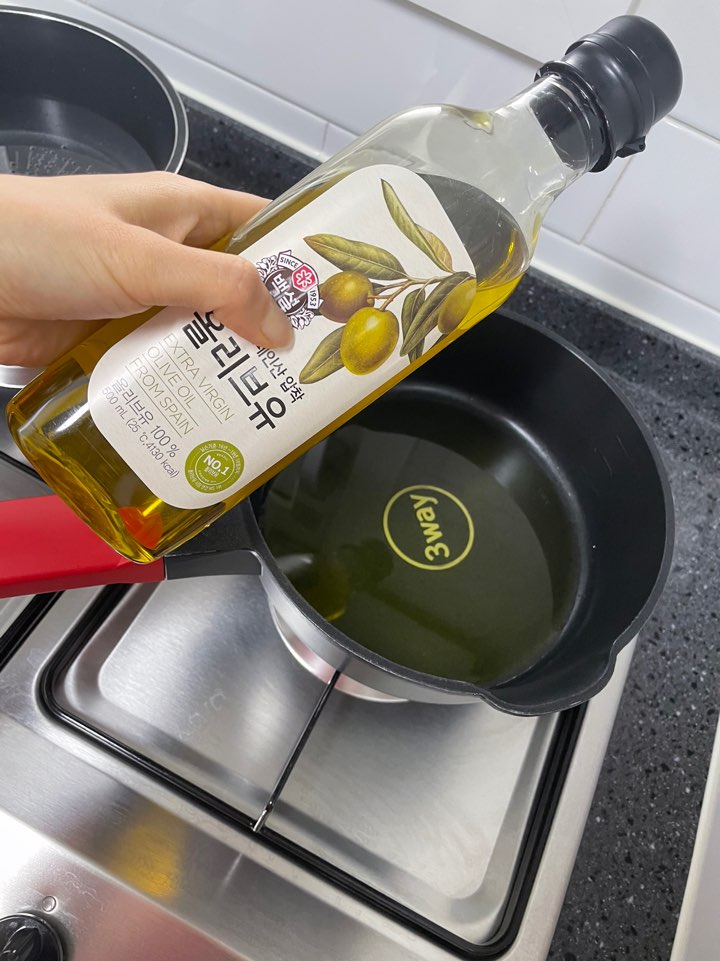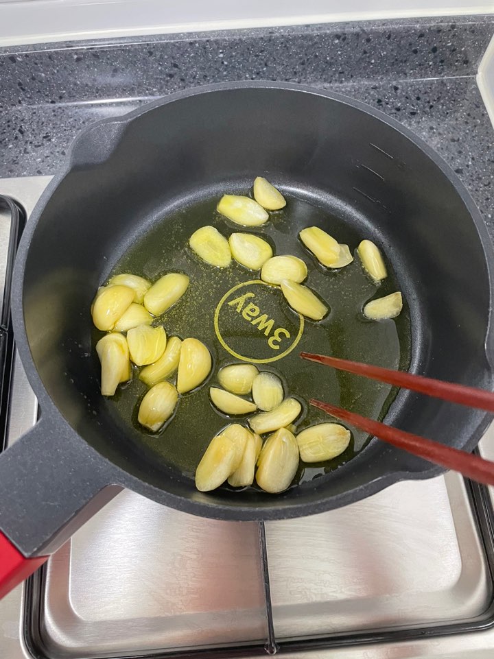 프라이팬에 전체적으로 올리브유를 둘러주세요. 다음으로 편마늘을 넣어 중불에 노릇노릇해질 때까지 볶아주시면 됩니다.
