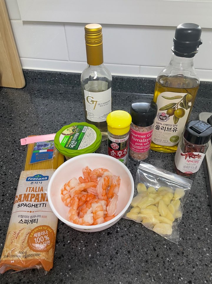 메인 재료는 스파게티 면, 자숙 냉동 새우, 올리브유이며, 다진 마늘, 마늘, 소금, 후추 페페론치노홀, 와인 등을 추가적으로 준비해 주세요.