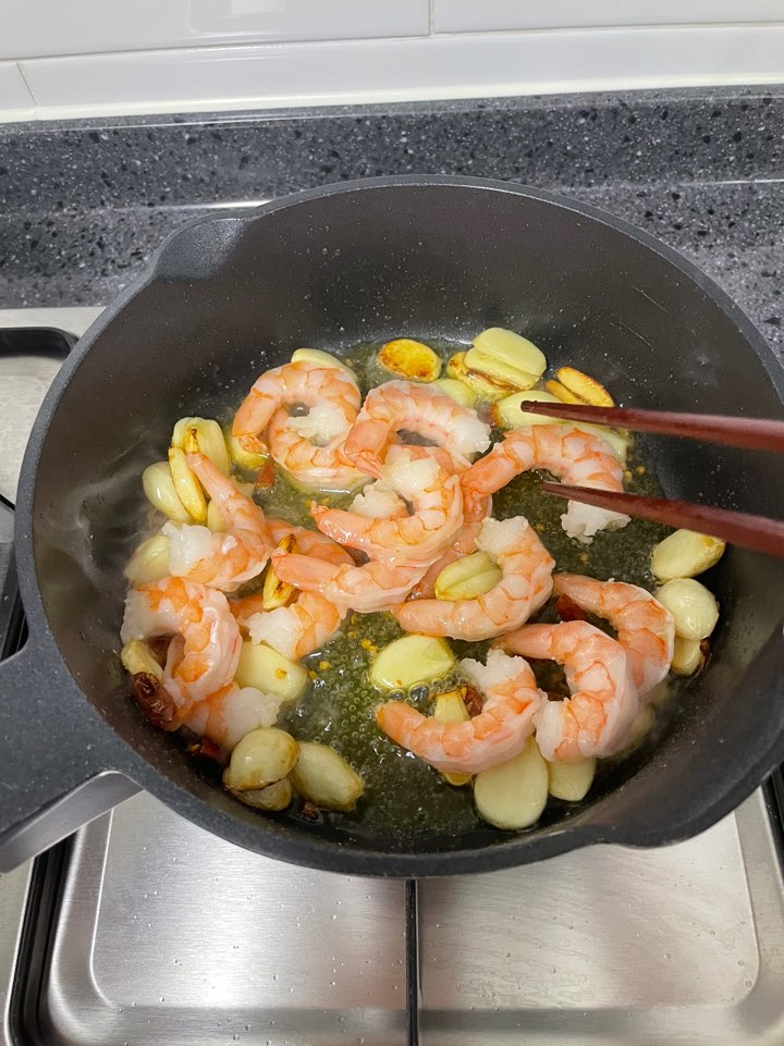 새우는 약 15개 정도 넣어주세요. 약 3분 정도 자숙 냉동 새우를 센 불에 볶아주세요. 생새우가 아니라 이미 한 번 익혀져 판매되는 새우인 점에 유의해주세요.