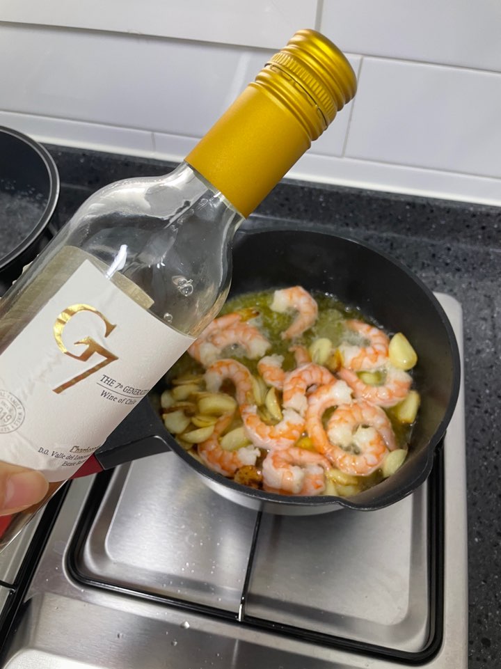 와인을 큰 술로 2스푼 정도 부어주세요. 다음으로 마늘은 큰 술의 반 정도 넣어주세요.