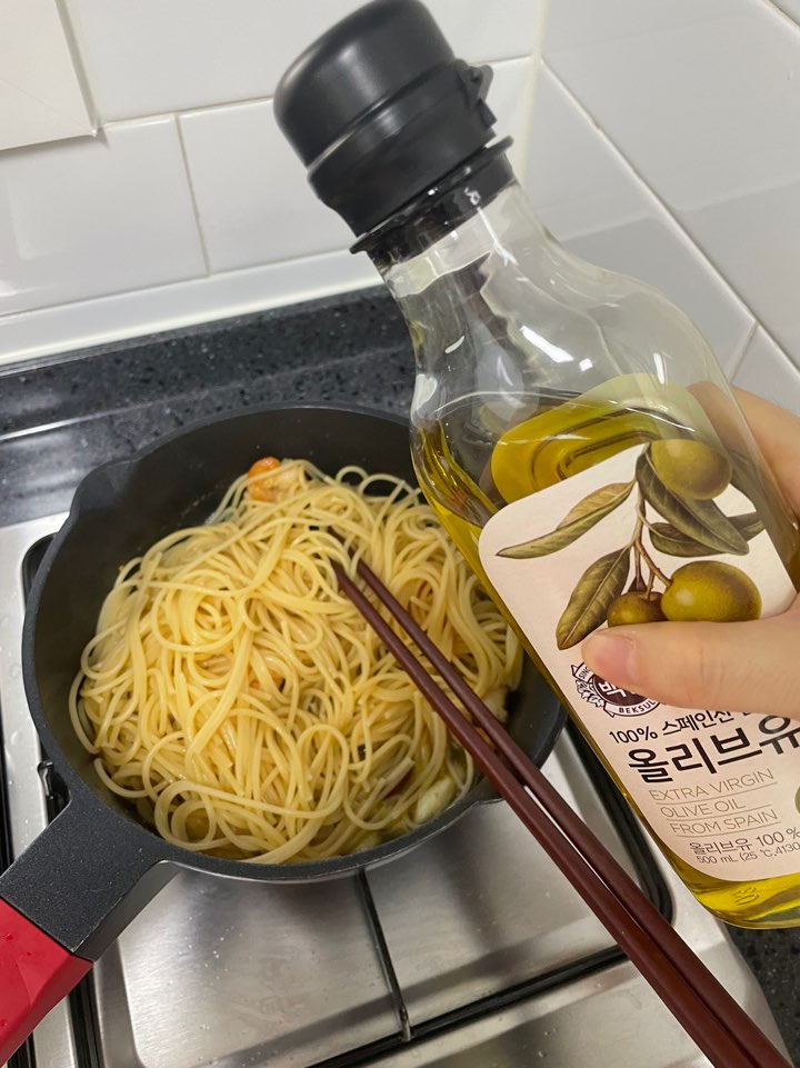 오늘 요리는 새우 오일 파스타입니다. 오일 파스타는 오일, 파스타 면으로도 요리가 가능하며, 여기에다가 새우를 추가해 주면 새우 오일 파스타가 됩니다.