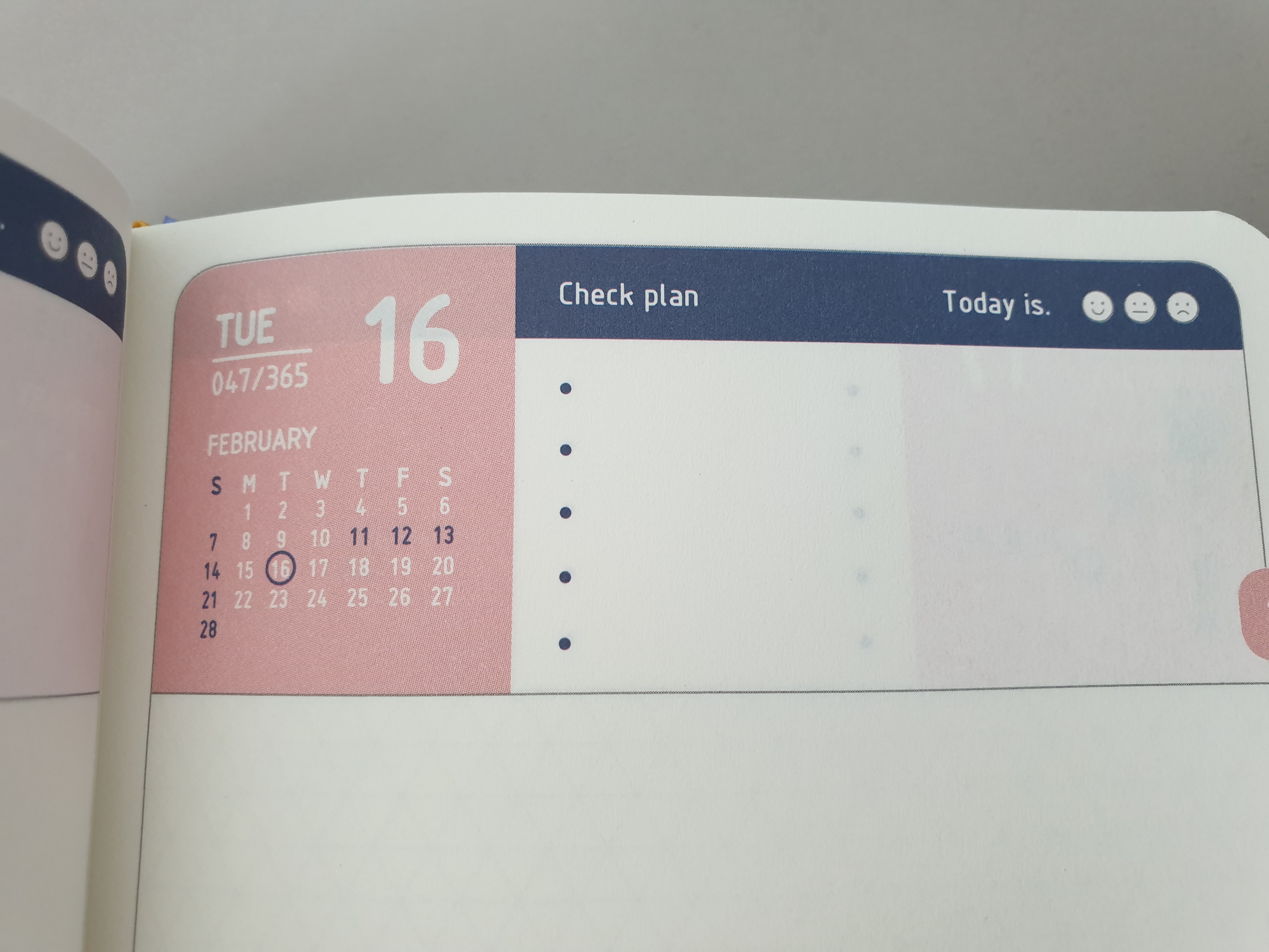 오늘이 몇일인지 월별 달력에 동그라미를 쳐서 알려주는 세심한 배려가 돋보이네요. 체크 플렌과 1년 365일 중에 오늘은 얼마의 시간이 지났는지 알려줍니다. 2월 16일 화요일은 365일 중에 47일째입니다.