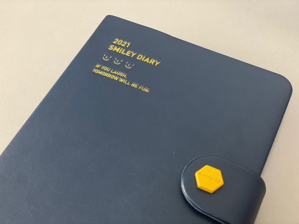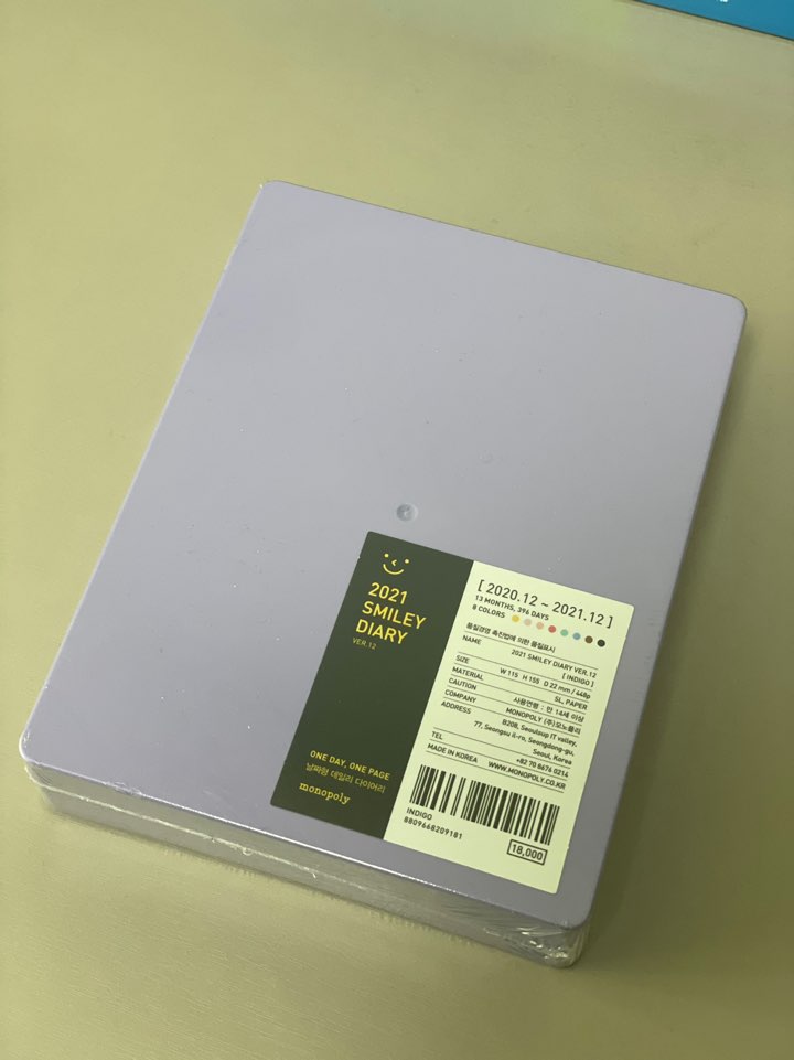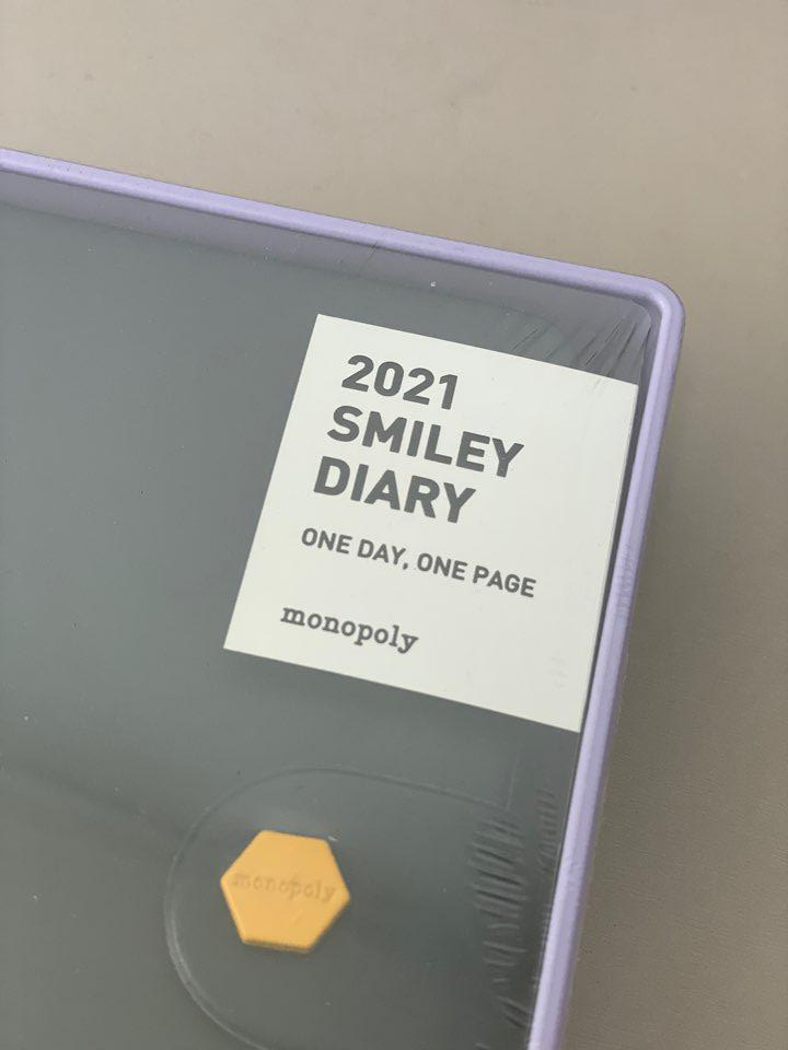 옆면에는 2021 스마일리 다이어리의 회사명인 모노폴리(MONOPOLY) 로고가 새겨져 있습니다. 반대쪽 옆면에는 다이어리의 색상을 알려주고 있네요.
