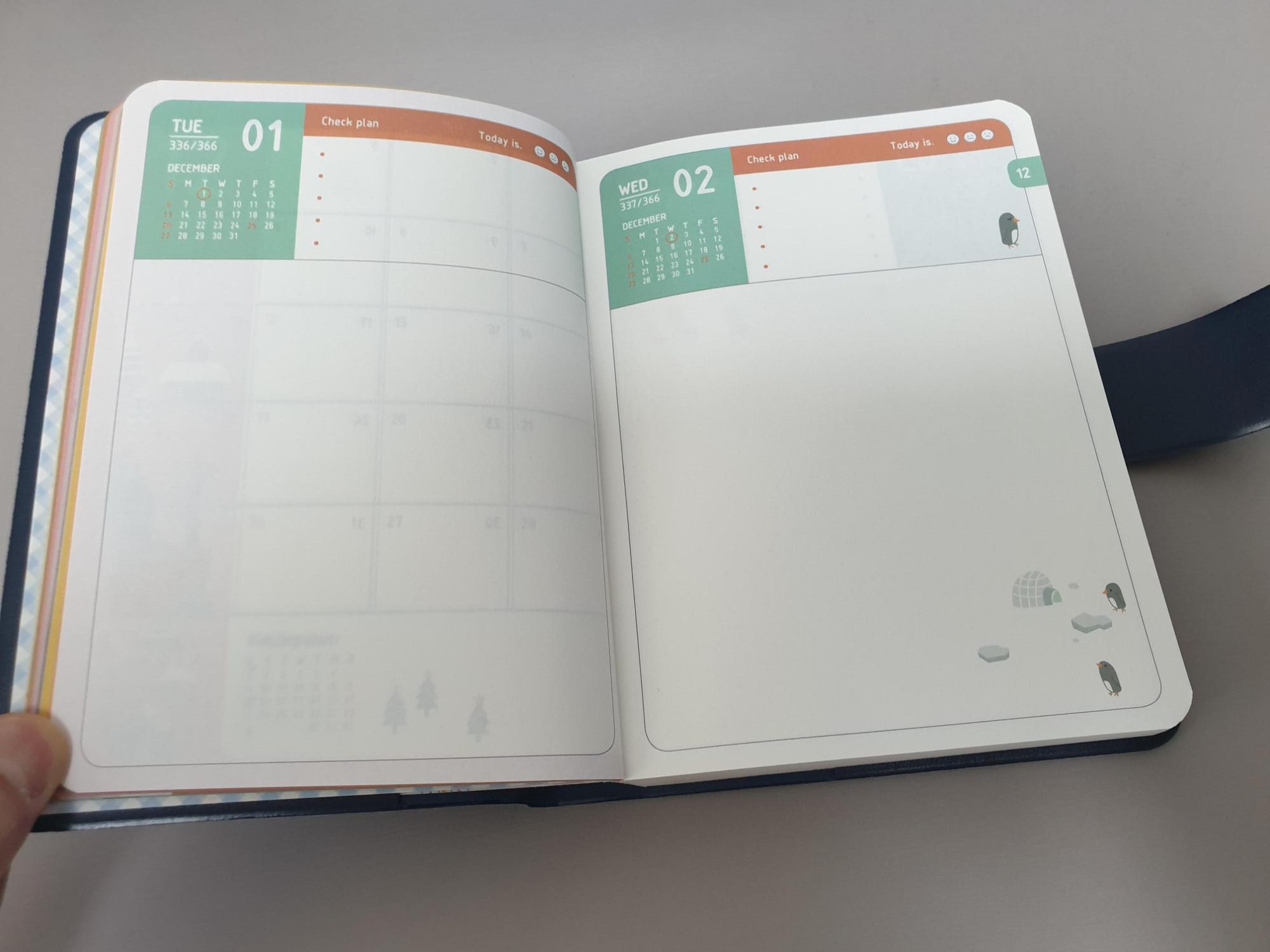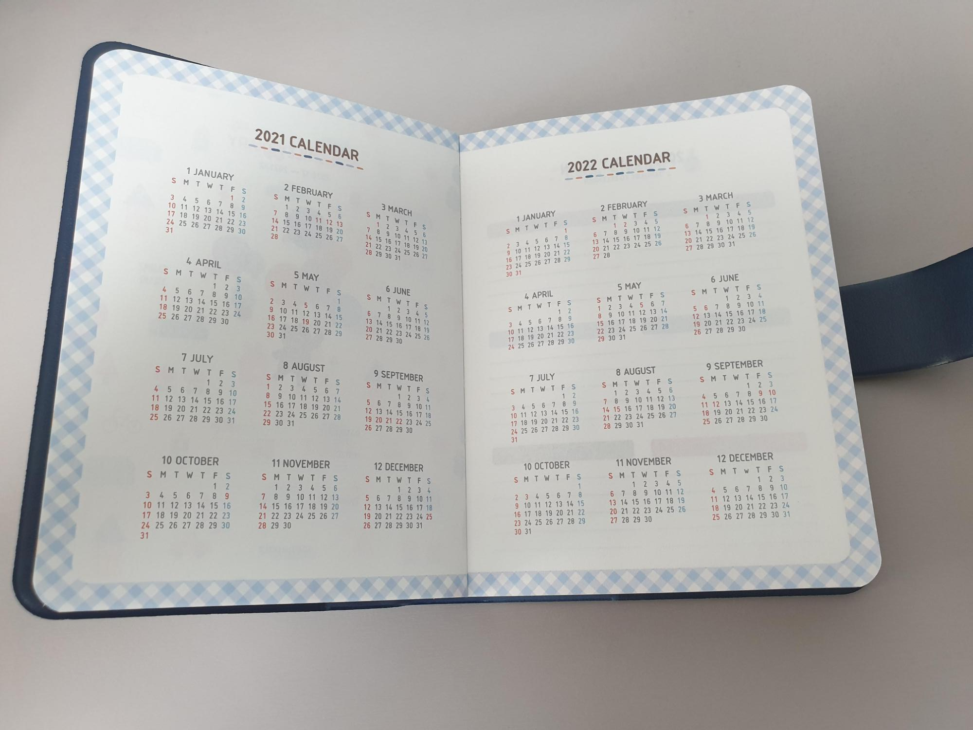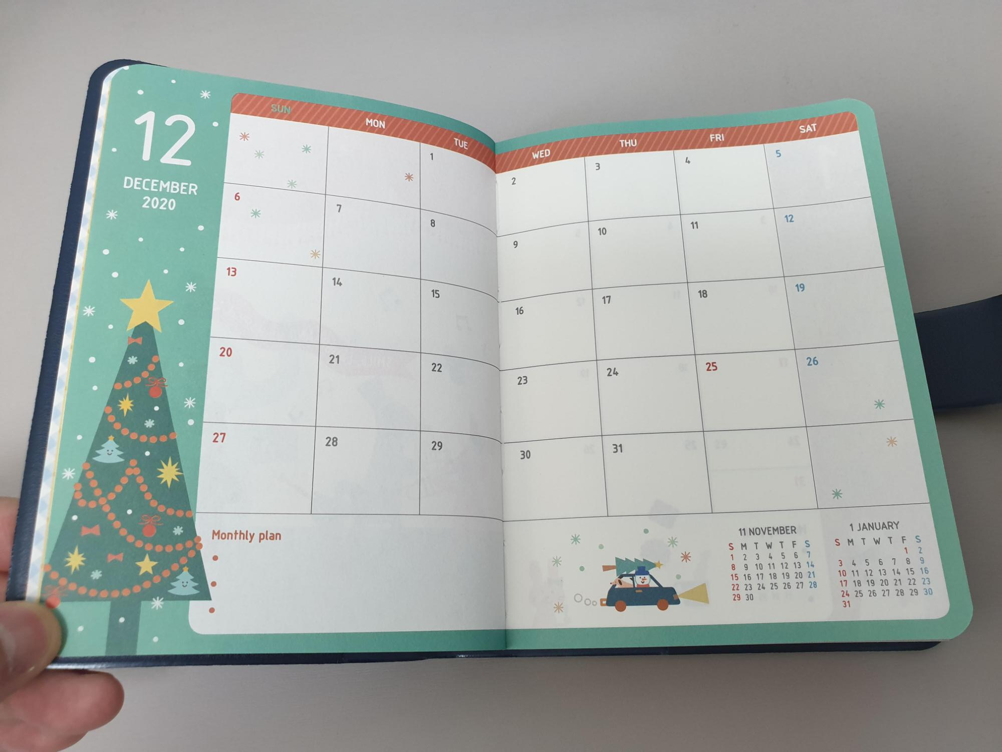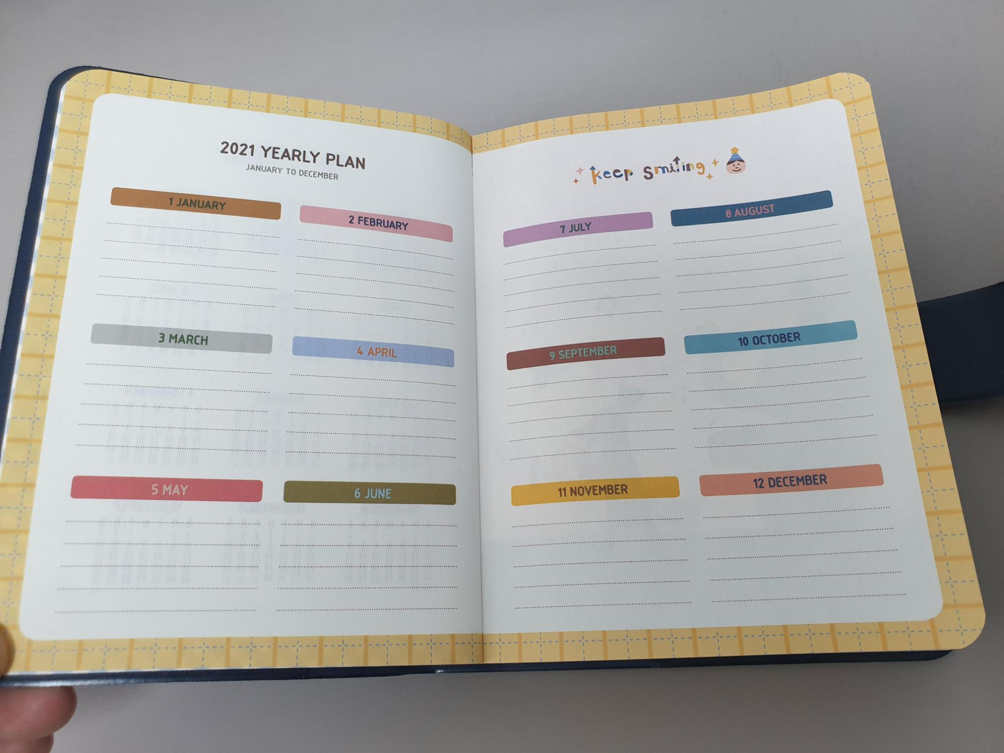 2020년 12월부터 작성을 할 수 있어서, 미리 구매한 저에게는 아주 유용하였습니다. 디자인은 전체적으로 아기자기한 느낌이며, 앞부분은 월별 달력이 있습니다.