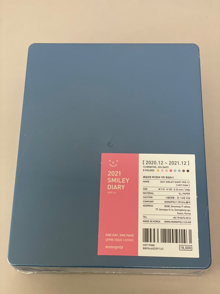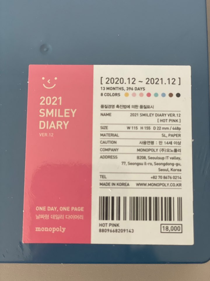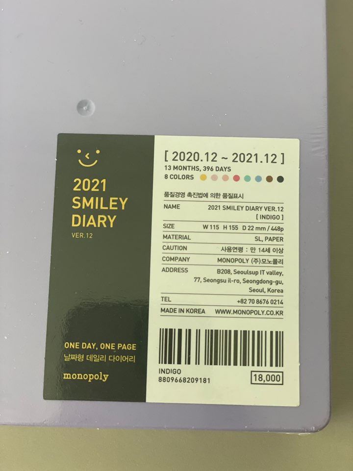 플라스틱 포장 용기의 뒷모습입니다. 2020년 12월부터 2021년 12월까지 사용이 가능한 2021년 스마일리 다이어리입니다.