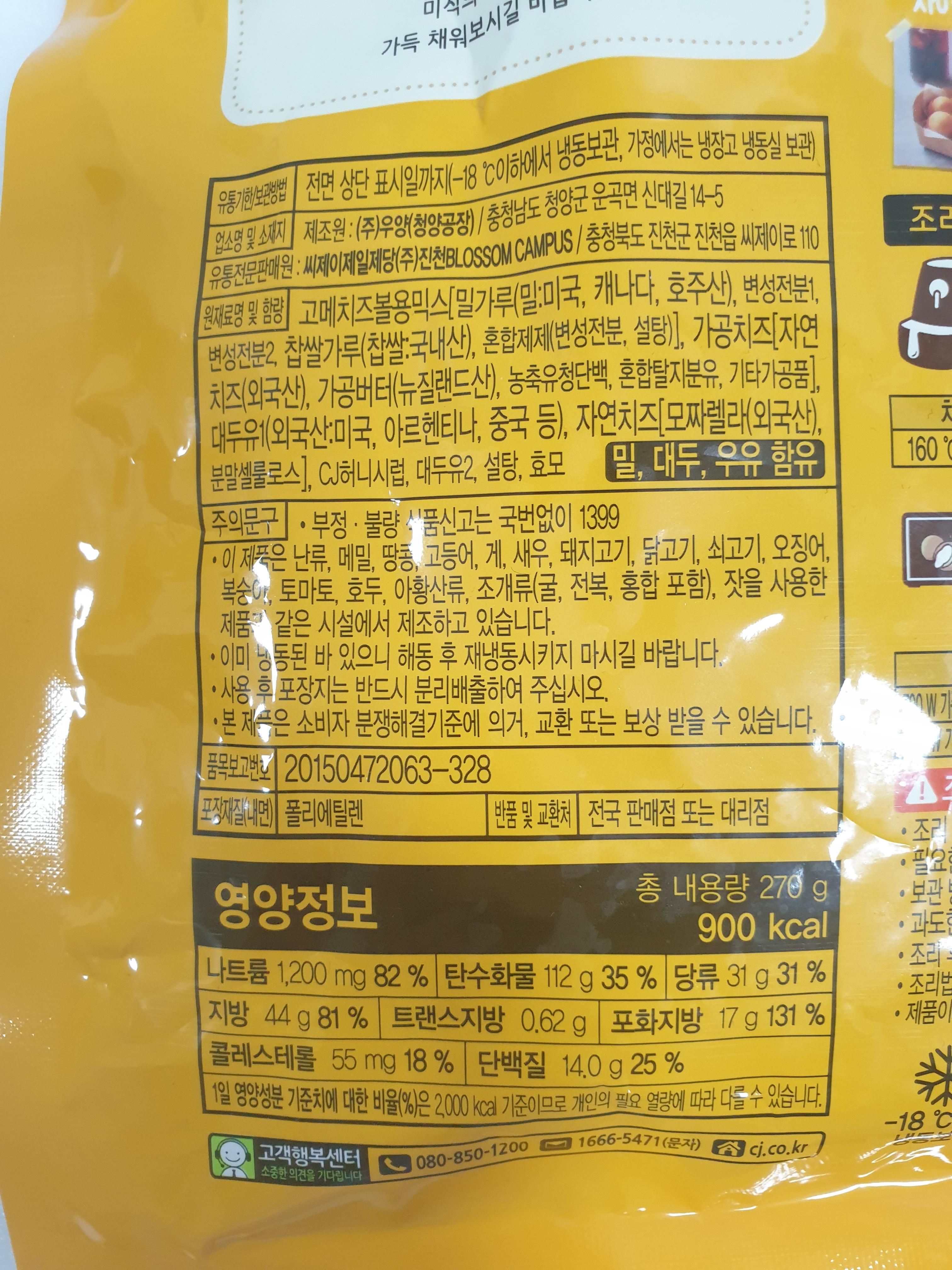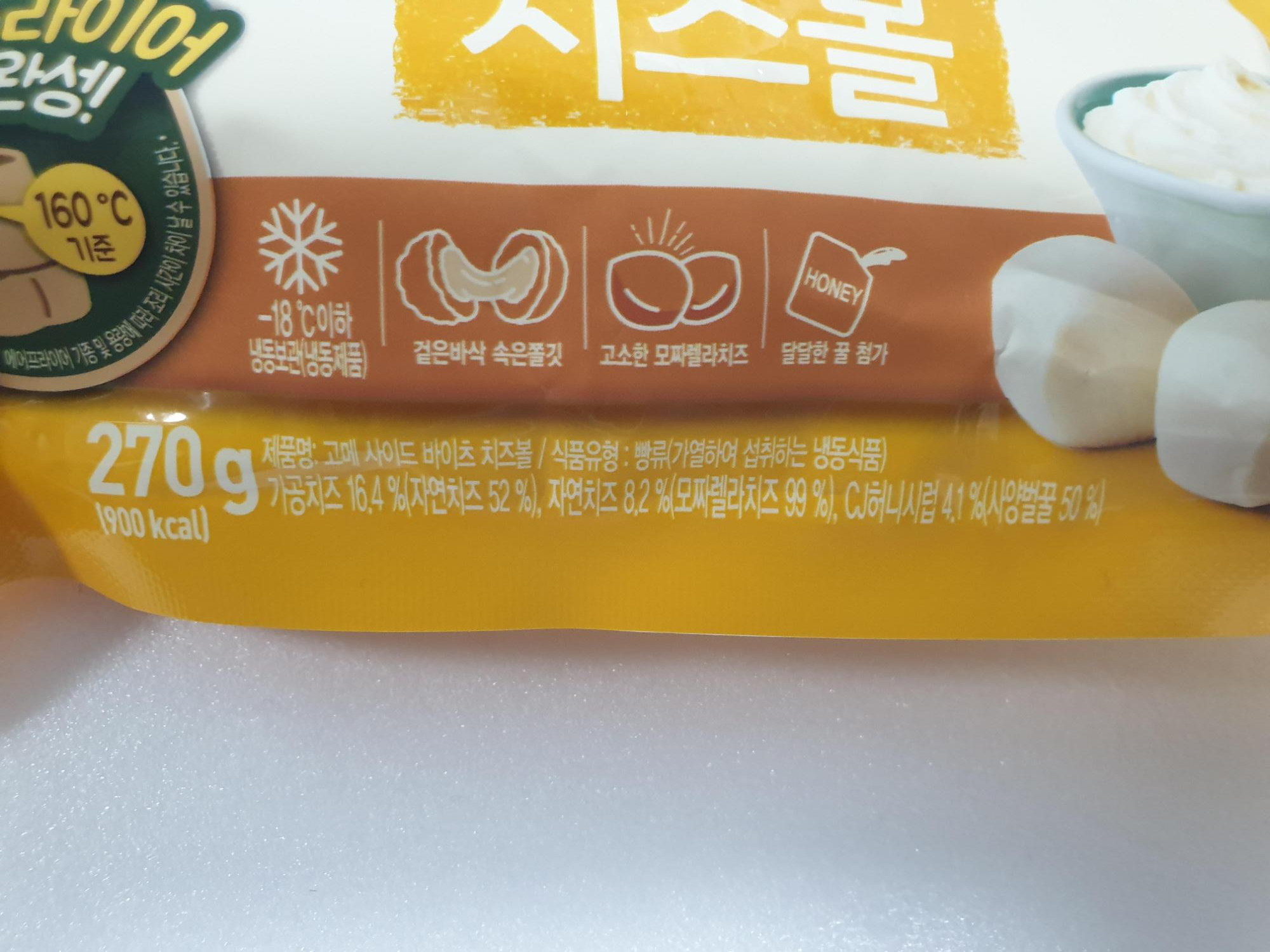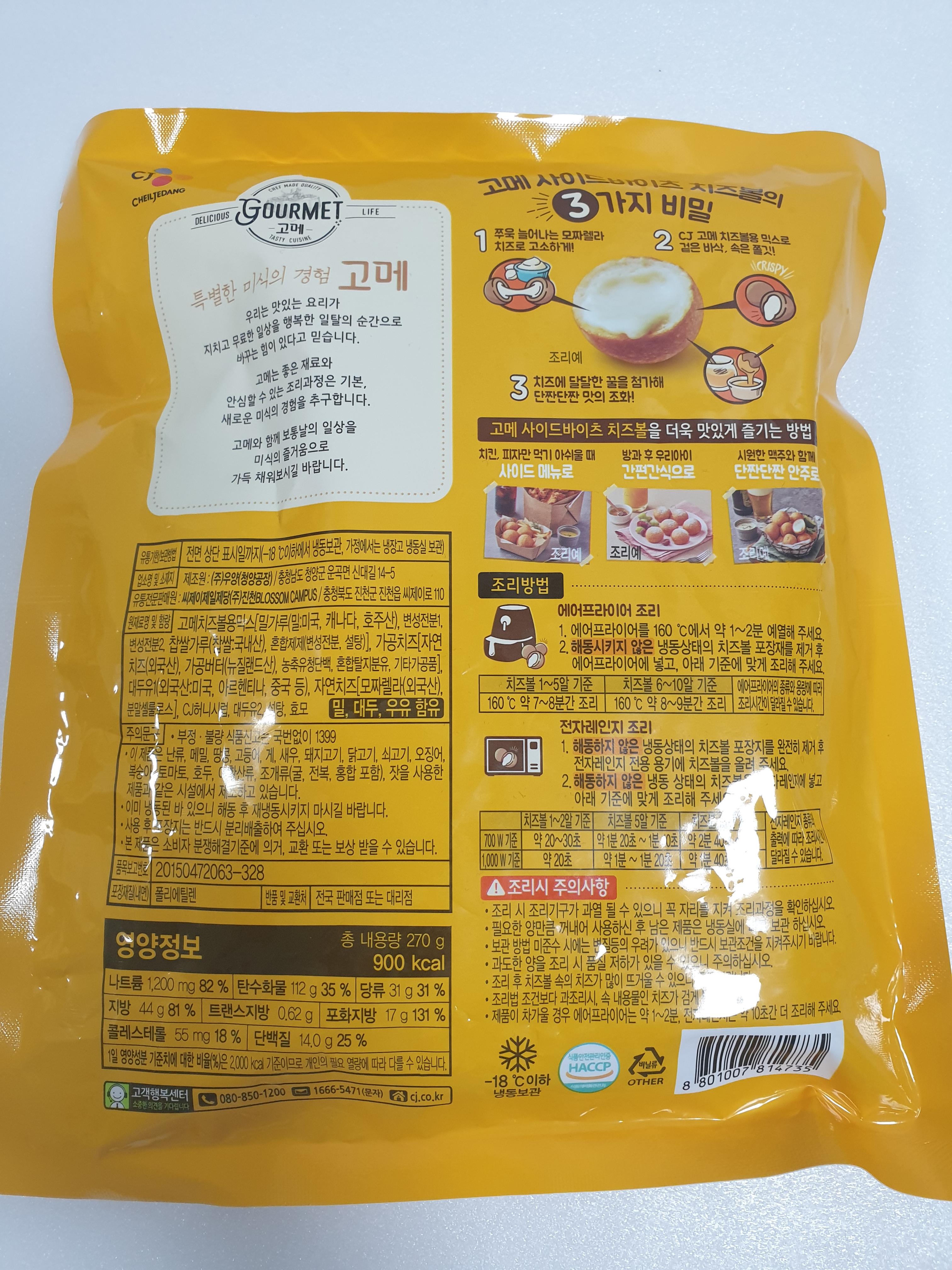 정식 제품명은 고메 사이드 바이츠 치즈볼이며, 270g(900kcal)입니다. 가공 & 자연치즈가 들어 있으며, 허니 시럽도 첨가되어 있네요.