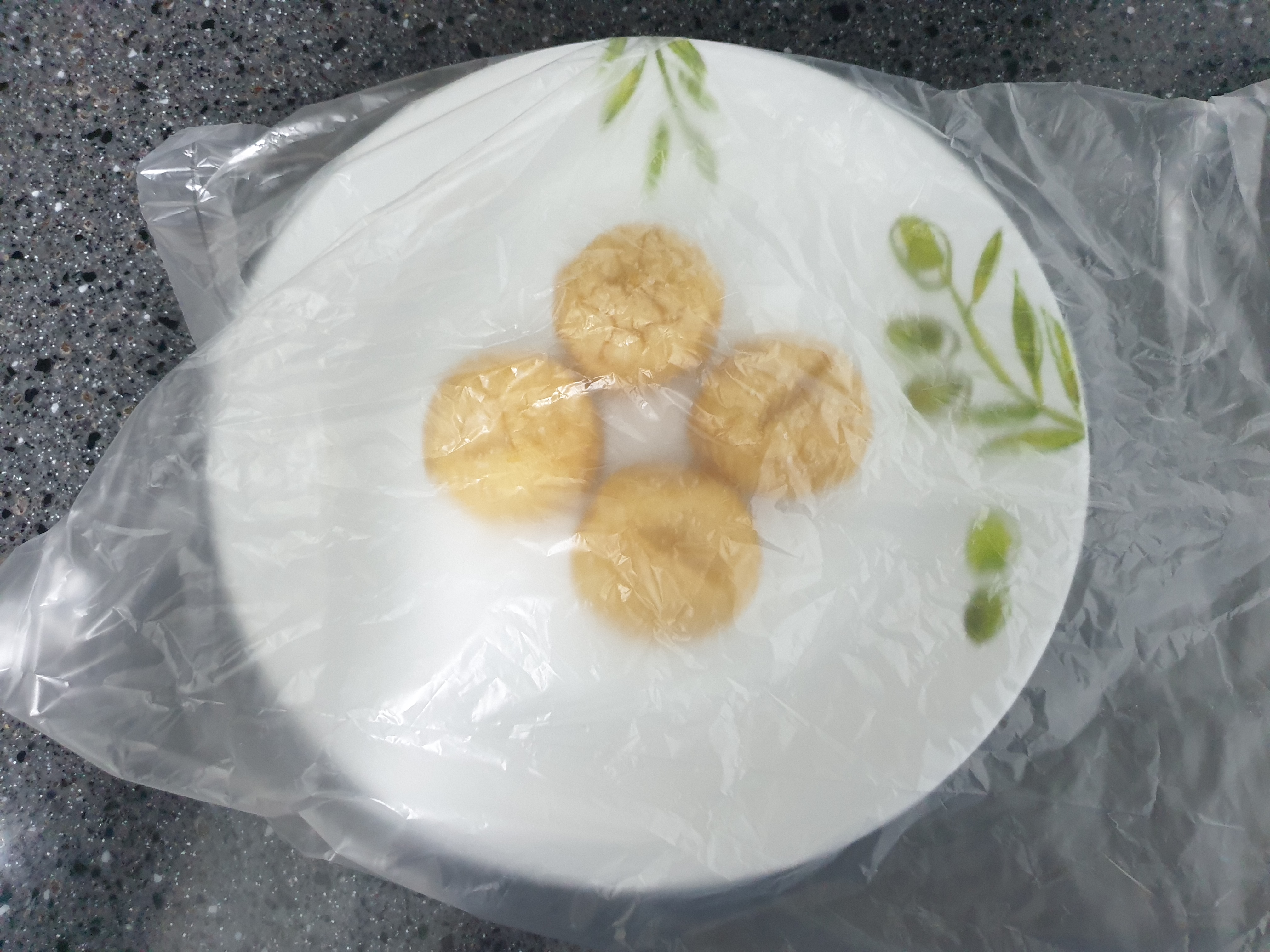 설명서대로 치즈볼을 꺼내 조리해주세요. 해동되지 않은 치즈볼 4개를 유리접시에 올려놓았습니다. 치즈볼이 터지면 전자레인지가 더러워질 수도 있으니 비닐랩으로 감싸주시면 좋습니다.
