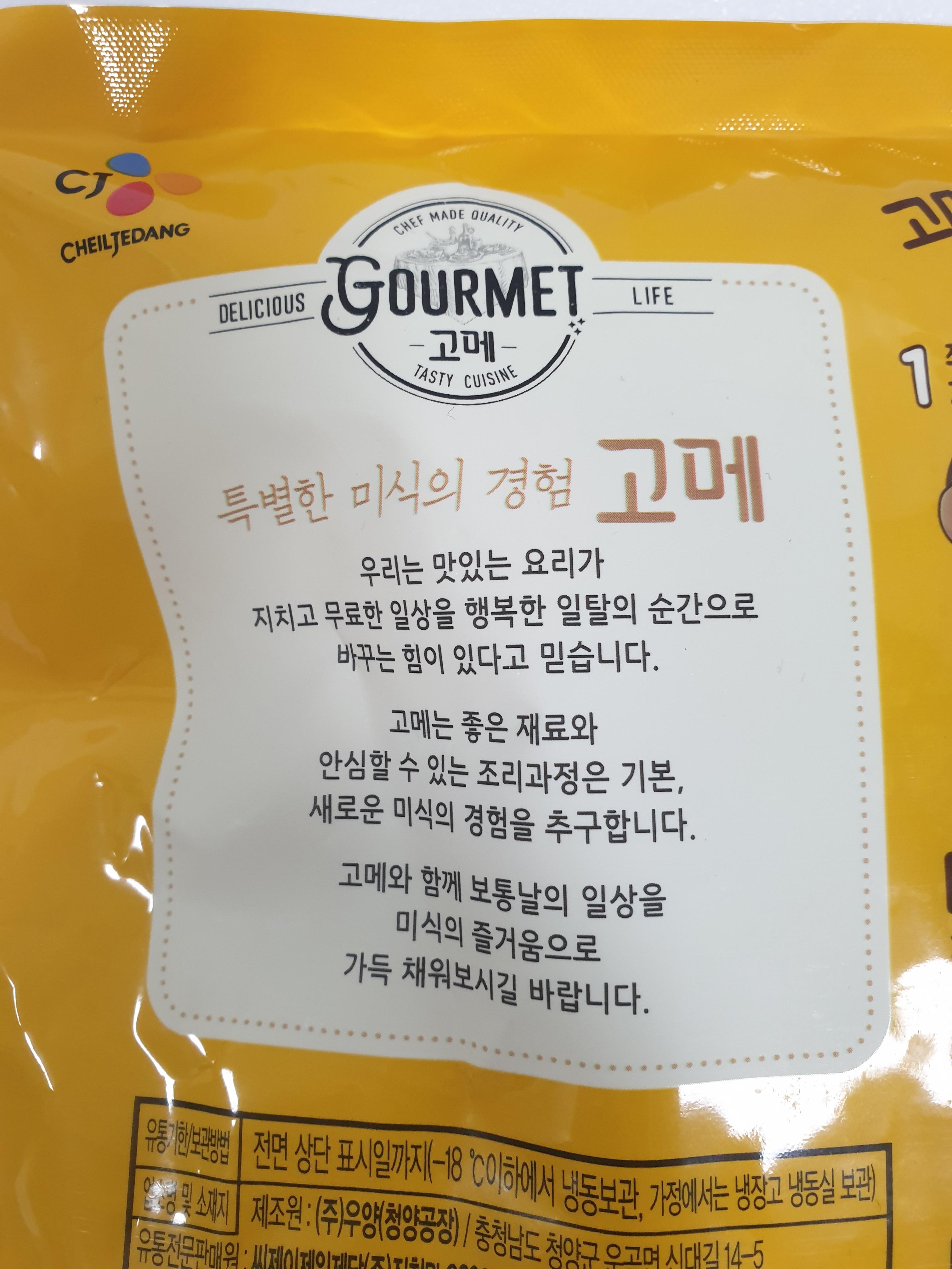 특별한 미식의 경험이라는 고메 브랜드를 내세우고 있습니다. 영양정보와 원재료 및 함량 등은 사진을 확인해주세요.