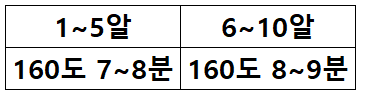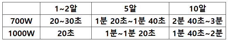 2. 아래 기준에 맞추어 조리한다.(전자레인지 종류와 출력에 따라 조리시간이 달라질 수 있음)