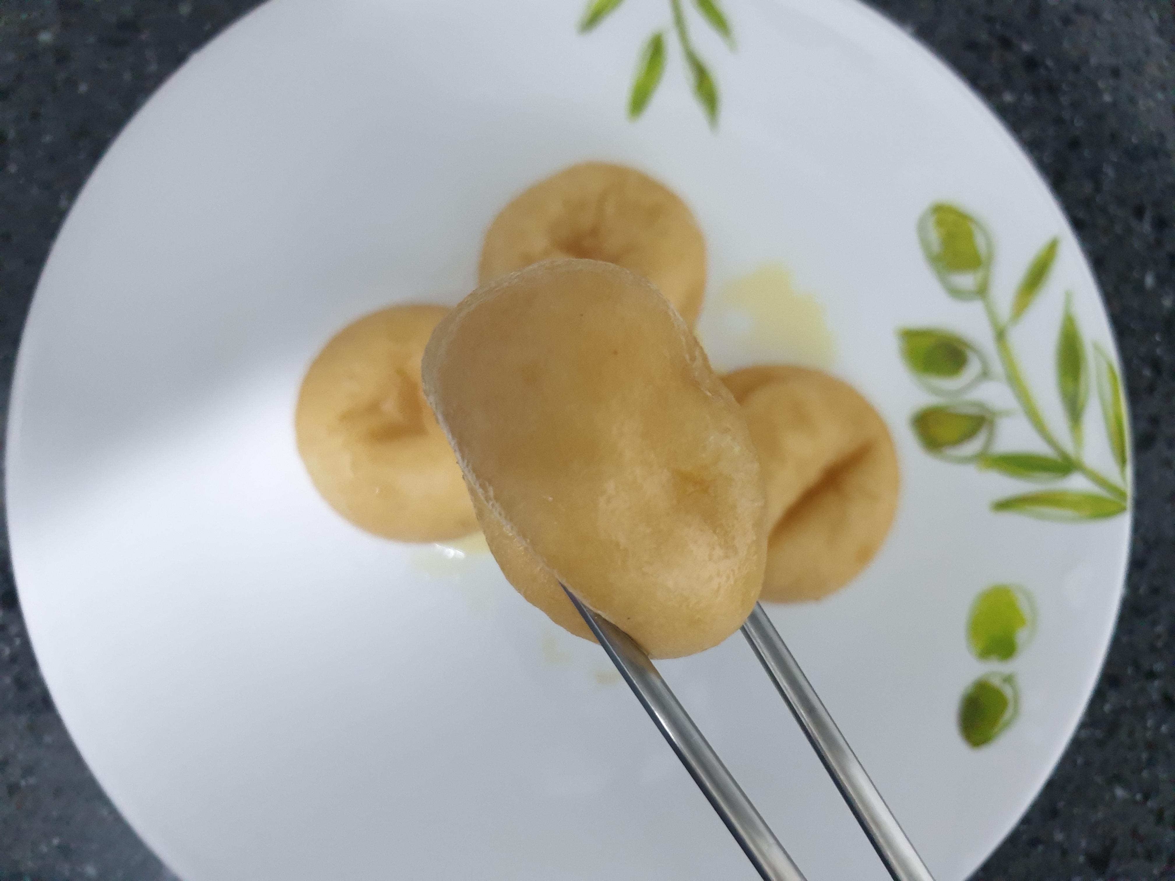 전자레인지로 조리된 CJ 고메 치즈볼입니다. 치즈볼이 터져서 치즈가 흘러나왔습니다. 이제 치즈볼을 하나 집어 들고 맛을 확인해 볼 시간입니다.