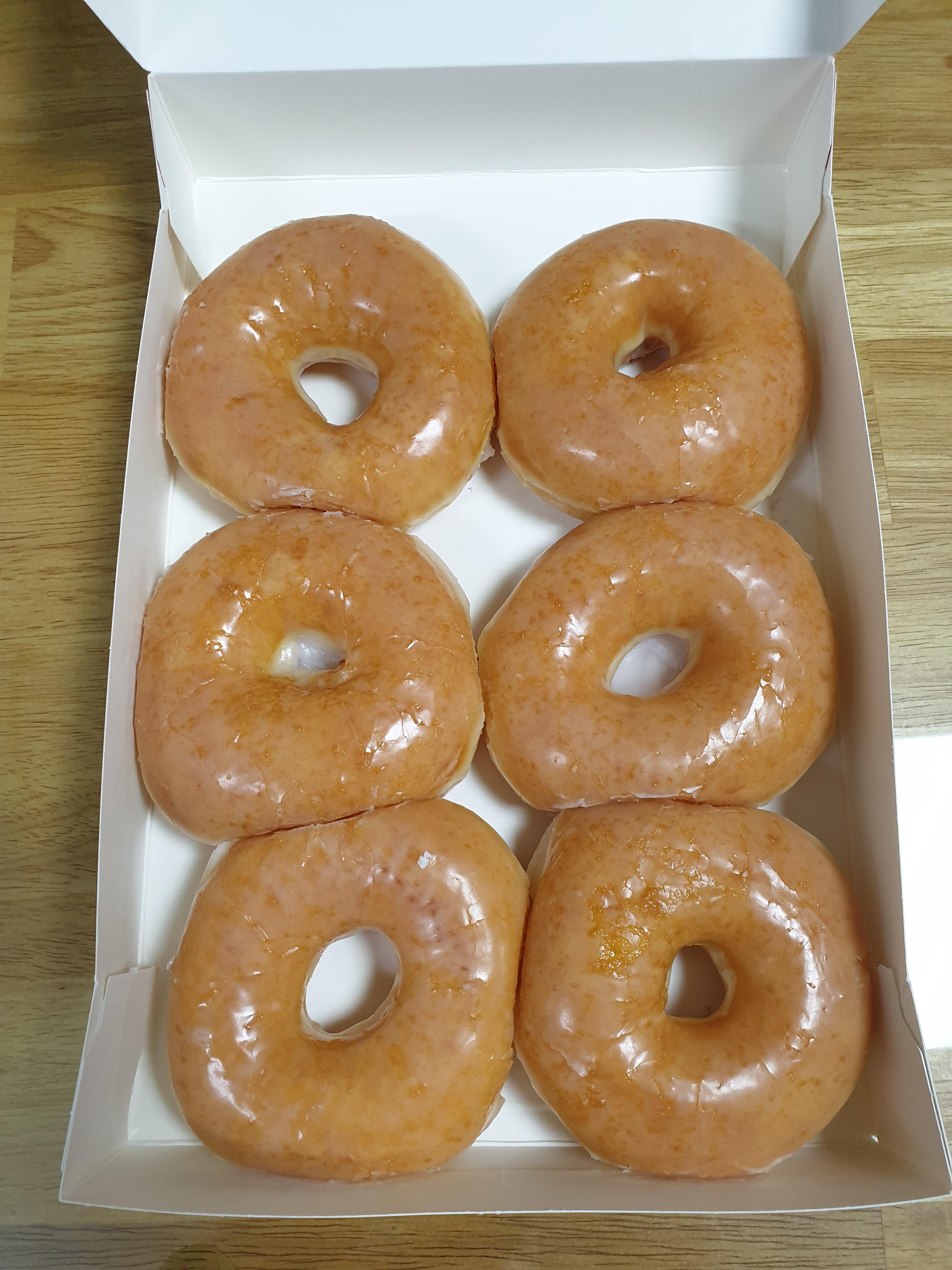 크리스피크림도넛 상자안에 들어있는 도넛입니다. 박스당 6개씩 들어있습니다. 보기만 해도 너무나 먹음직스럽네요:)