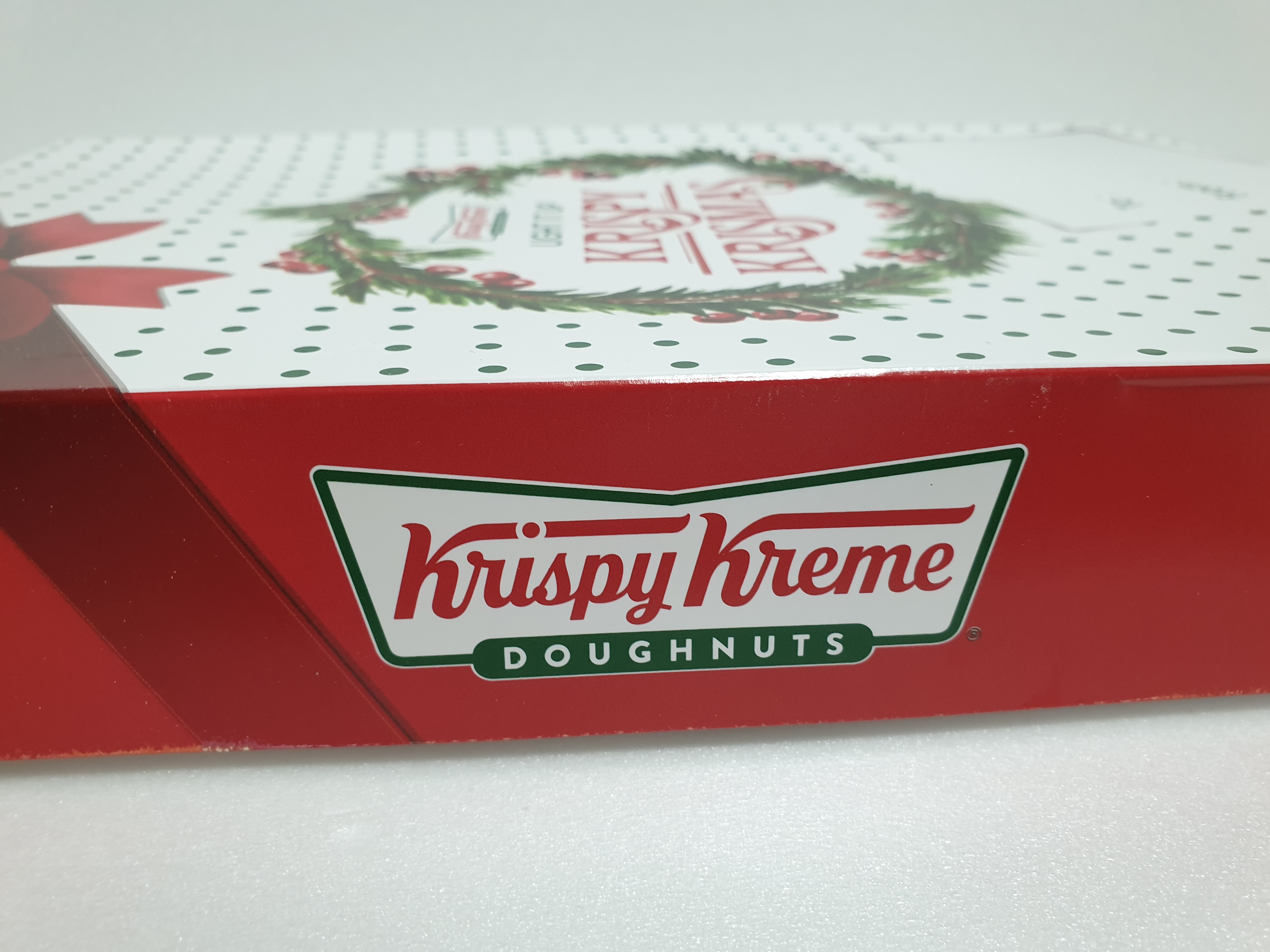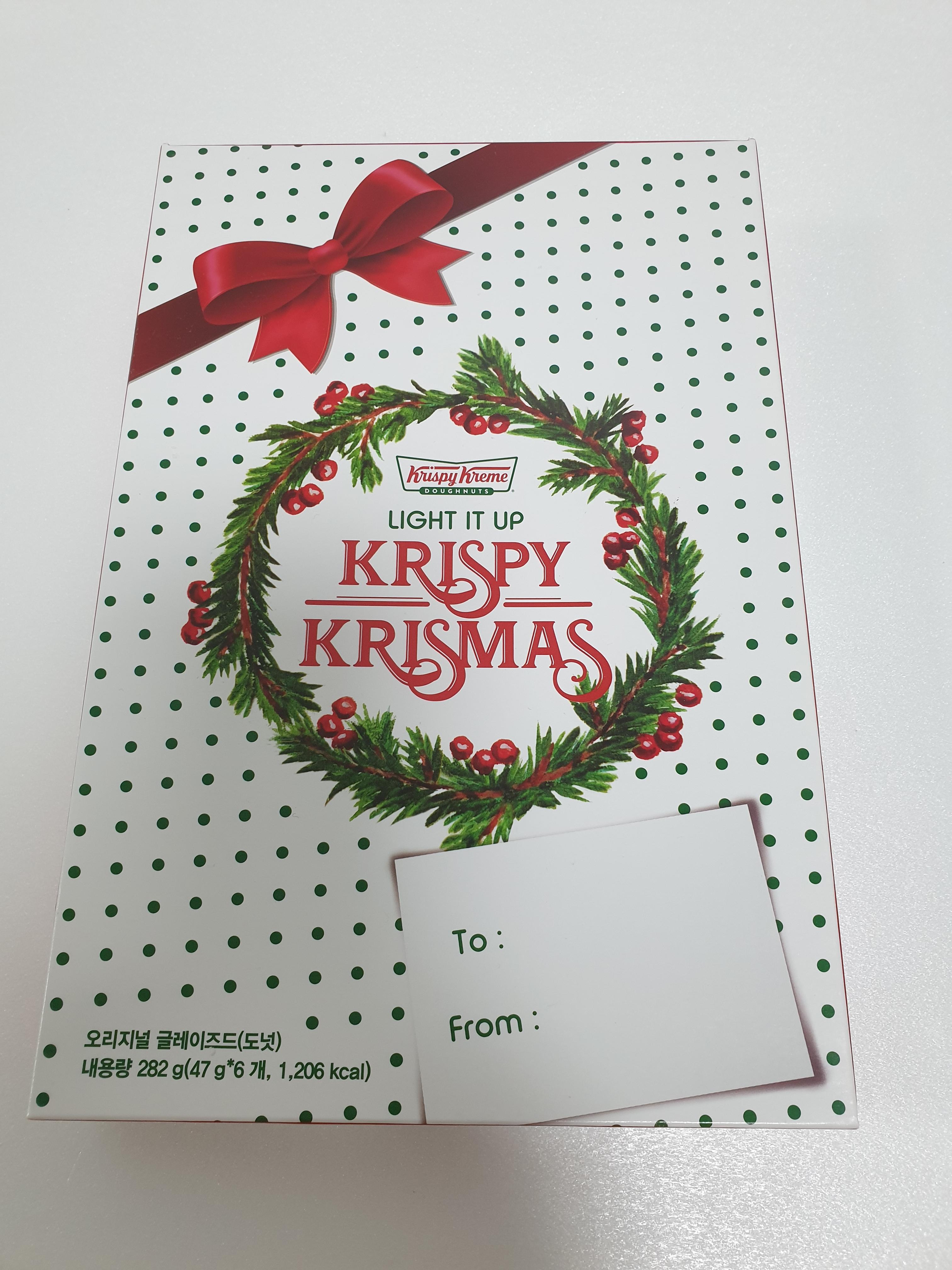크리스피크림도넛 쇼핑백에서 오리지널 글레이즈드 더즌 상자를 꺼냈습니다. 크리스마스를 연상하게 하는 박스이고, 선물용으로 가능하게끔 디자인되어 있네요. 평소 고마움을 표시하고 싶은 지인이나 사랑하는 사람에게 이름을 적어서 선물해줘도 좋겠다는 생각이 들었습니다.